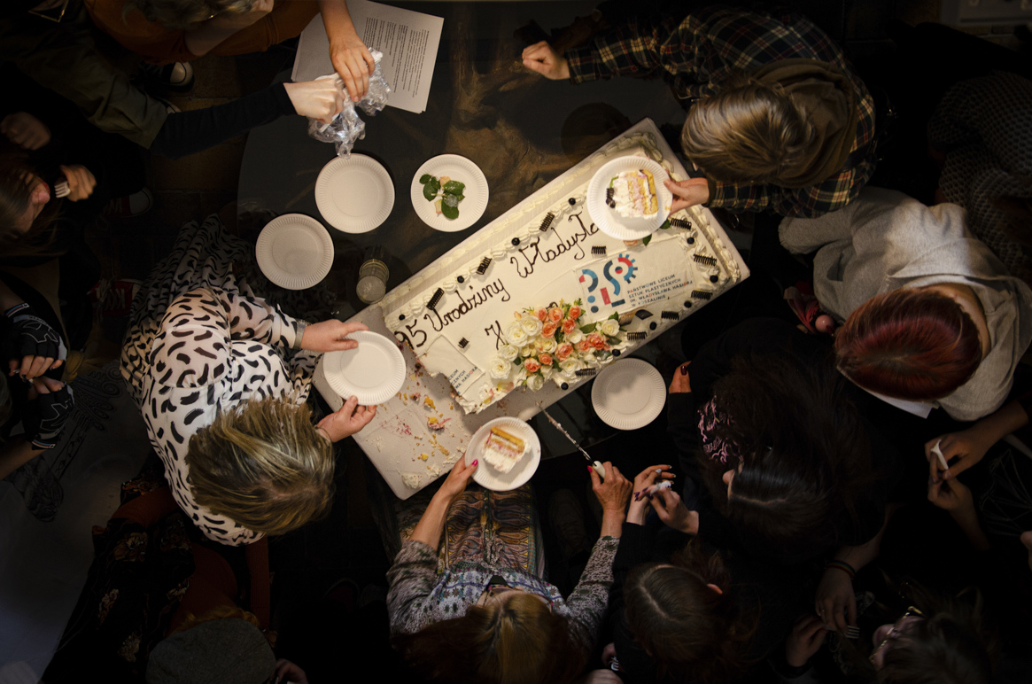 Na koniec zgromadzeni uczniowie wraz z nauczycielami spotkali się na uroczystym apelu zwieńczonym urodzinowym poczęstunkiem.