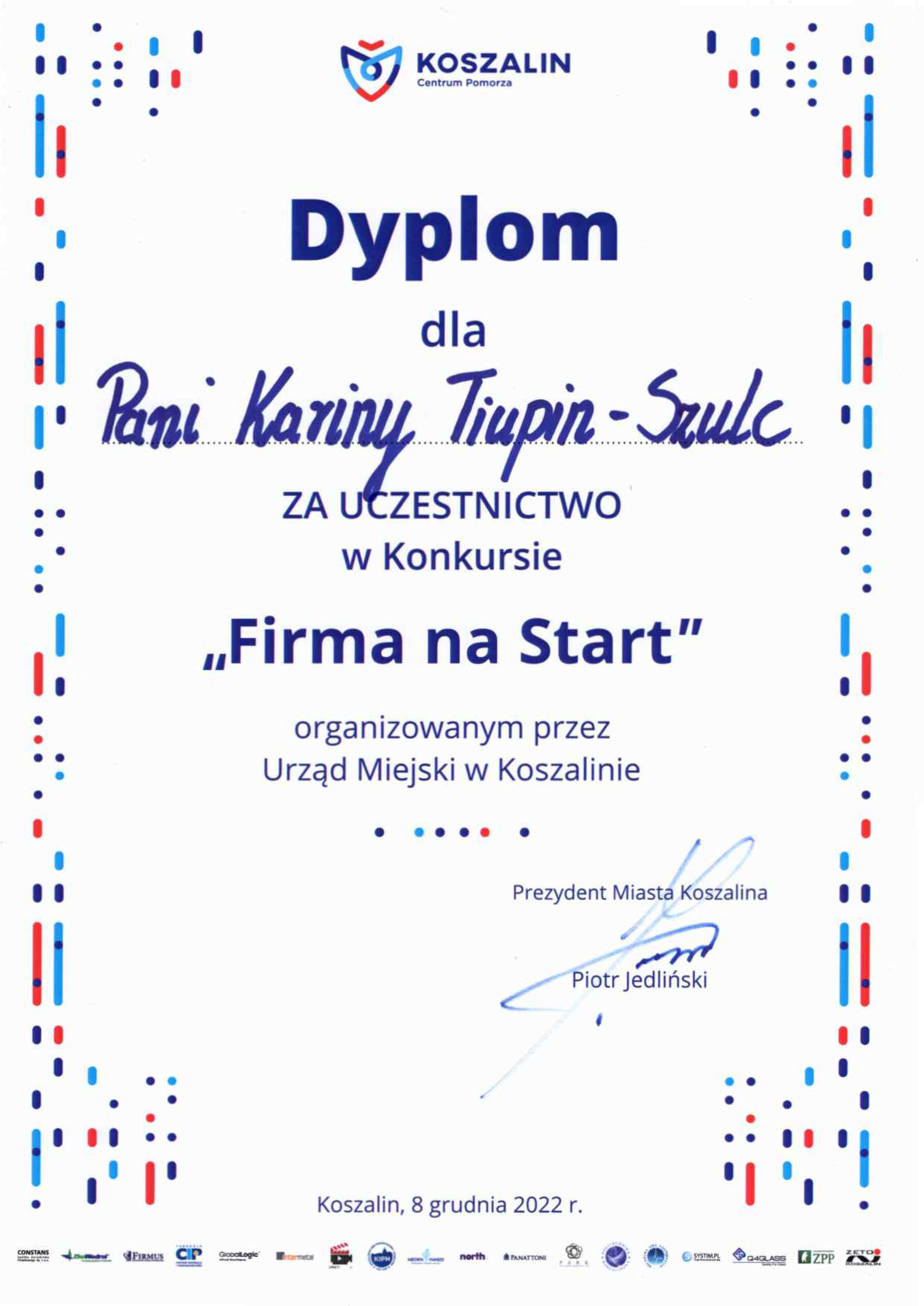 “W listopadzie wzięłam udział w pierwszym etapie konkursu “Firma na start”. Musiałam wymyśleć i podać nazwę własnej firmy. Po weryfikacji dostałam się do następnego etapu, podczas którego odbyłam obowiązkowe warsztaty. Na warsztatach zdobyłam wiedzę jak stworzyć biznesplan. W trzecim etapie mieliśmy stworzyć swój własny biznesplan i przedstawić go jako prezentację. Przed kapitułą konkursową w urzędzie miasta Koszalin 30 listopada 2022 roku zaprezentowałam swój pomysł na firmę. Po wystąpieniu kapituła zadawała dodatkowe pytania dotyczące biznesu. 8 grudnia 2022 odbyła się uroczysta gala, na której zostały wręczone nagrody i wyłonieni laureaci w sali konferencyjnej urzędu miasta Koszalin.”