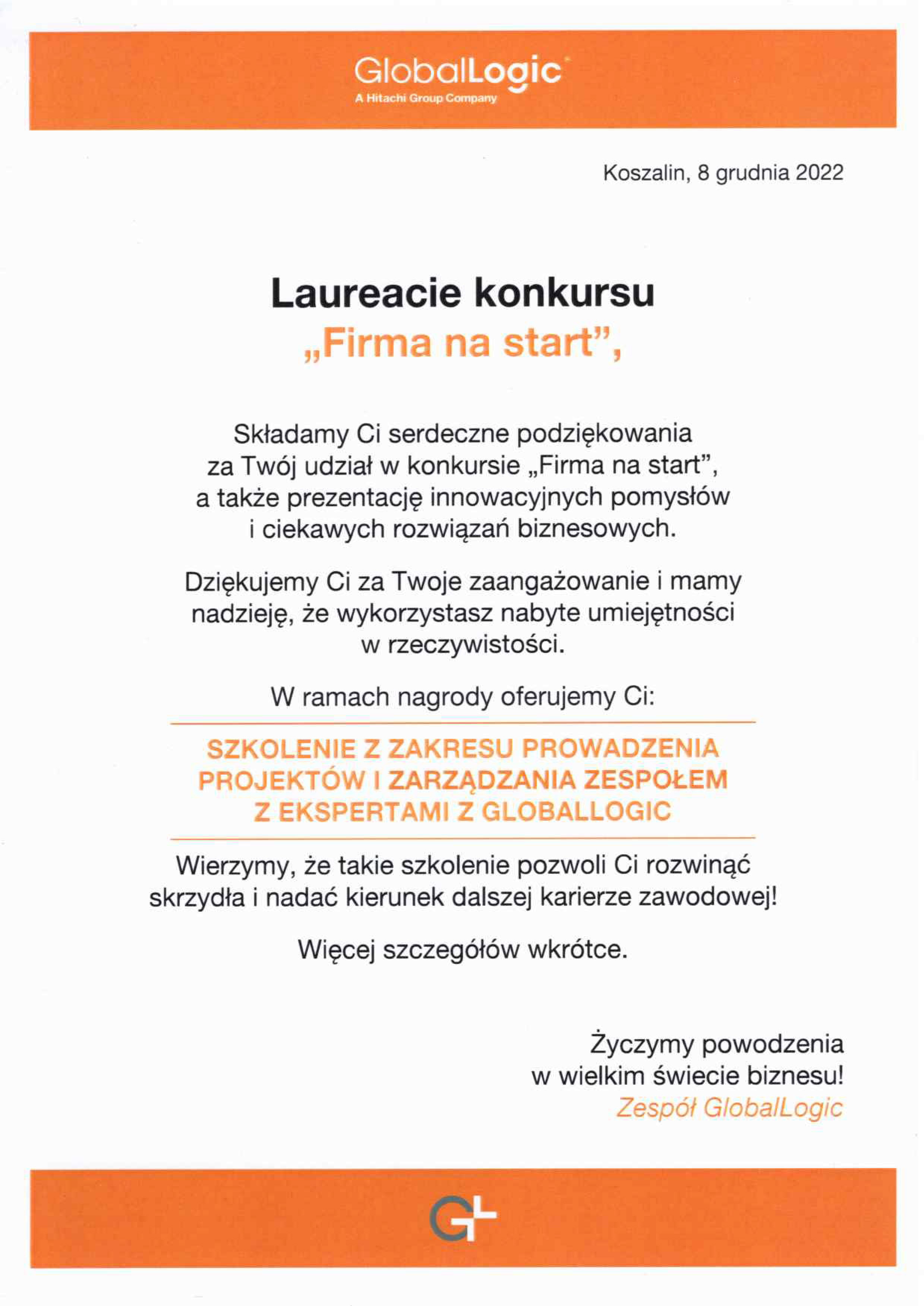 Karina otrzymała podziękowanie za udział w konkursie a w nagrodę zaproszenie na szkolenie z zakresu prowadzenia projektów i zarządzania zasobami ludzkimi organizowanymi przez firmę GlobalLogic. Jest to bardzo ważny krok przygotowujący Karinę do poważnych przedsięwzięć, jakie może mieć przed sobą w przyszłości. Trzymamy kciuki za zdobywanie kolejnych nowych doświadczeń i umiejętności zawodowych.