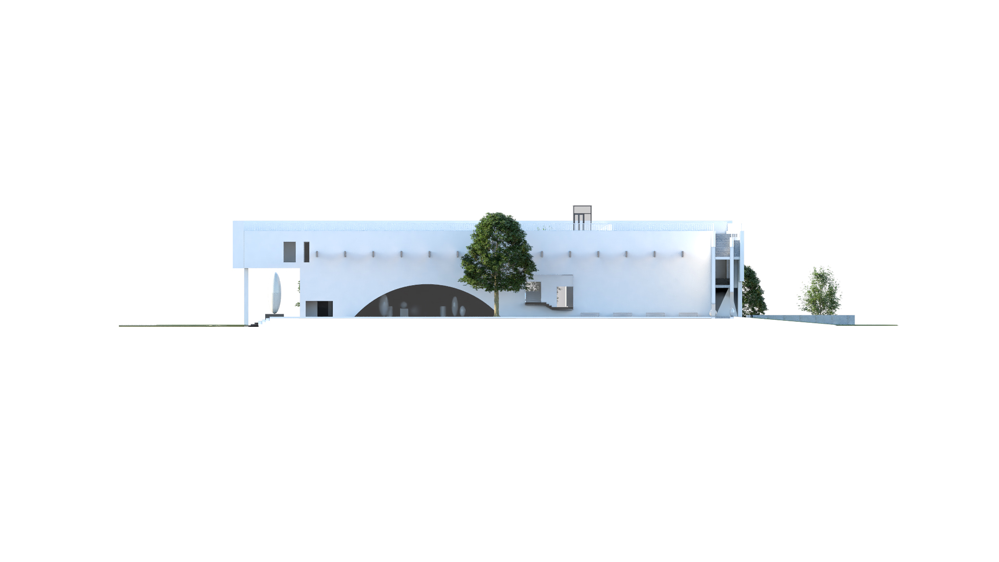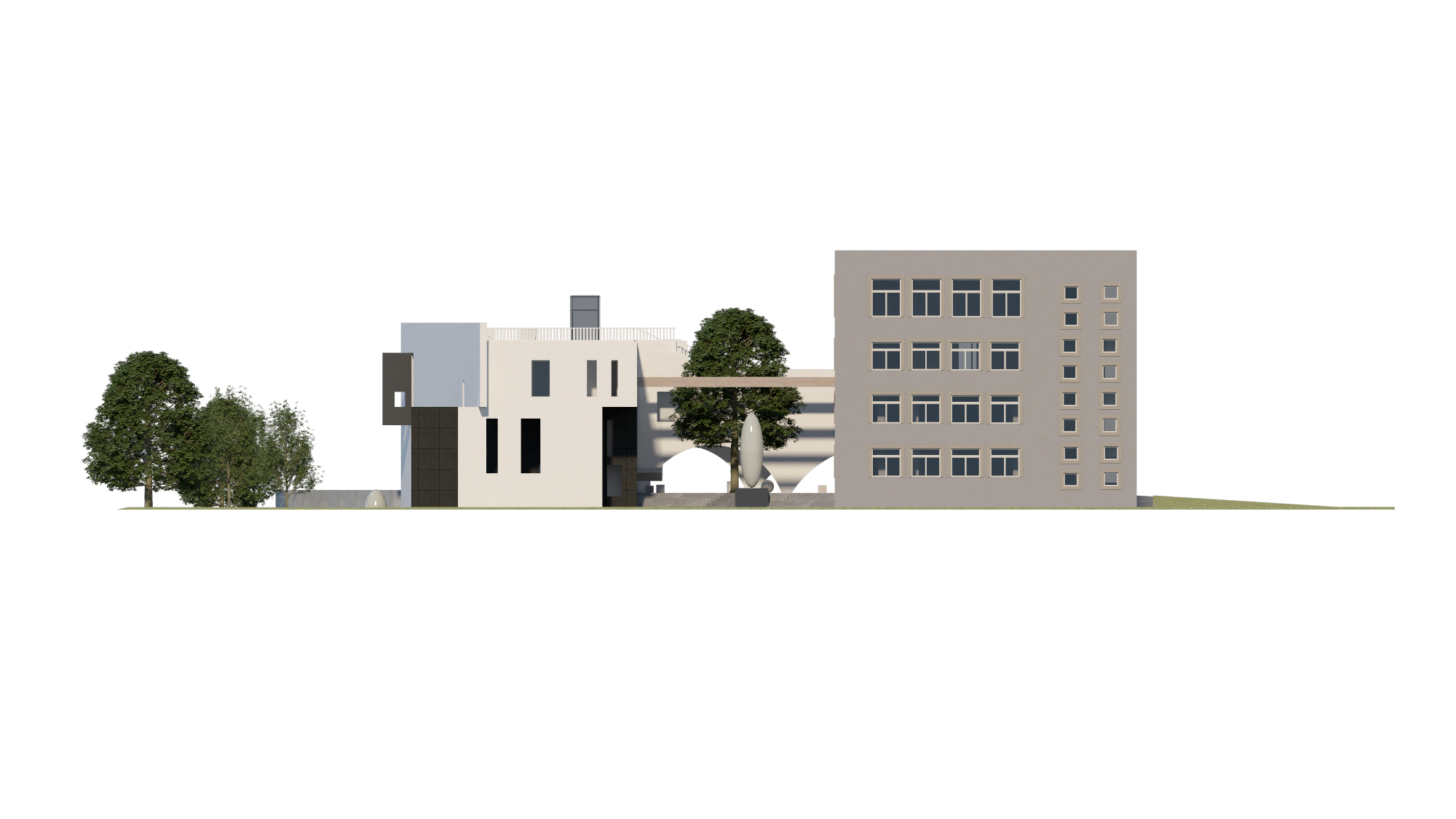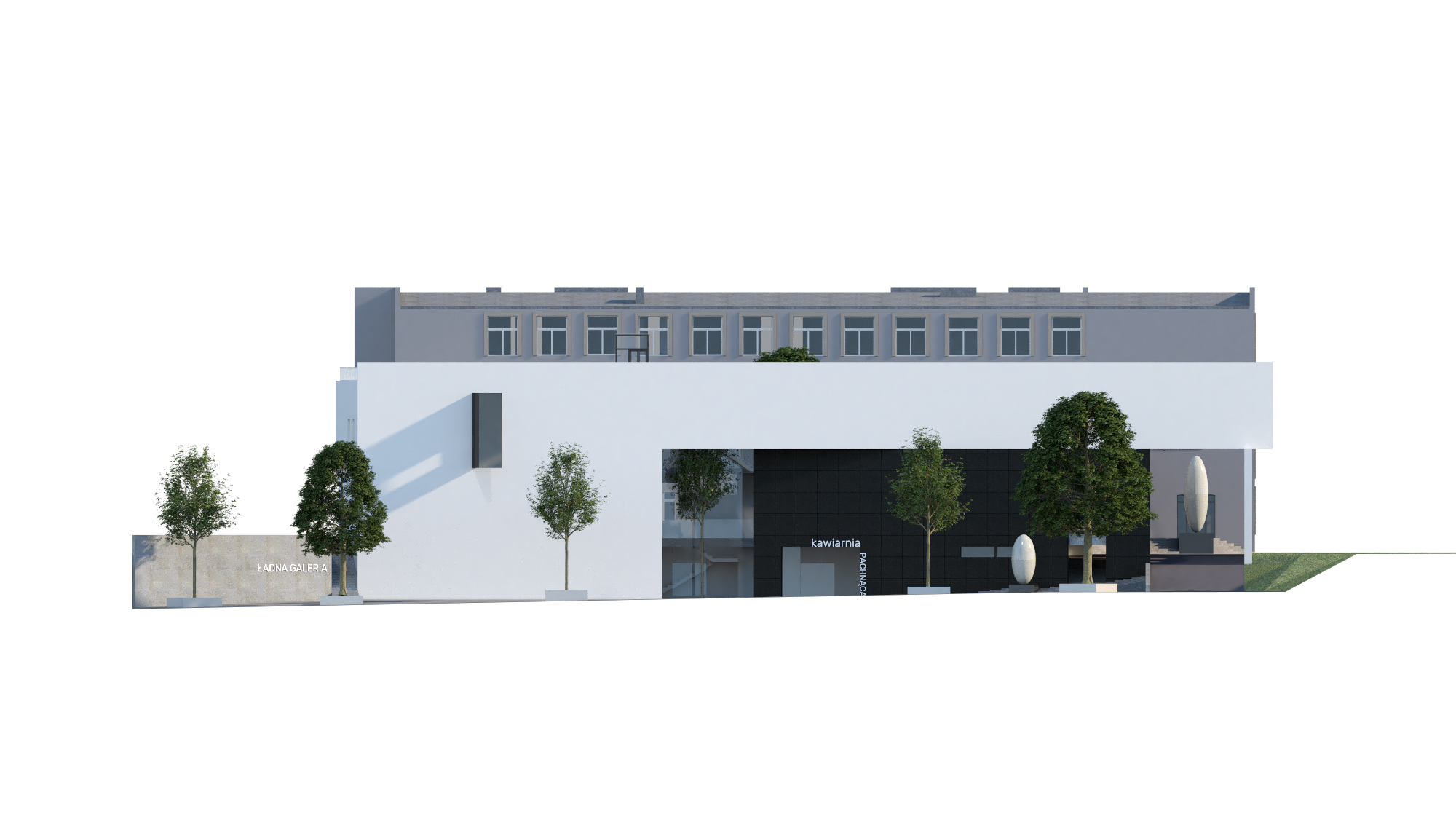W poniższej galerii zamieszczono wizualizacje architektoniczne przedstawiające nowoczesny budynek w białym kolorze, z płaskim dachem i jasnymi elementami konstrukcyjnymi. Obok niego widać istniejący, starszy budynek w odcieniach szarości. Otoczenie stanowią zielone trawniki i liczne drzewa o ciemnozielonych koronach, sugerujące zalesiony obszar. Widoczne są również fragmenty szarego asfaltu dróg i parkingów.