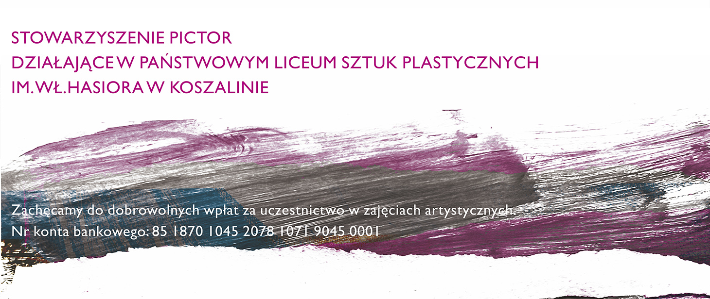 Uczestników zapraszamy do dobrowolnych wpłat na Stowarzyszenie Pictor działające w Państwowym Liceum Sztuk Plastycznych im. Wł.Hasiora w Koszalinie. Stowarzyszenie prowadzi działalność na rzecz rozwoju talentów naszych uczniów, organizacji wydarzeń artystycznych oraz ich promocję. Numer konta bankowego: 85 1870 1045 2078 1071 9045 0001
