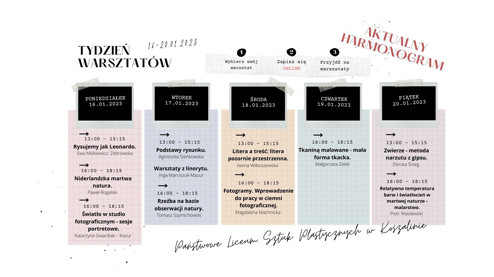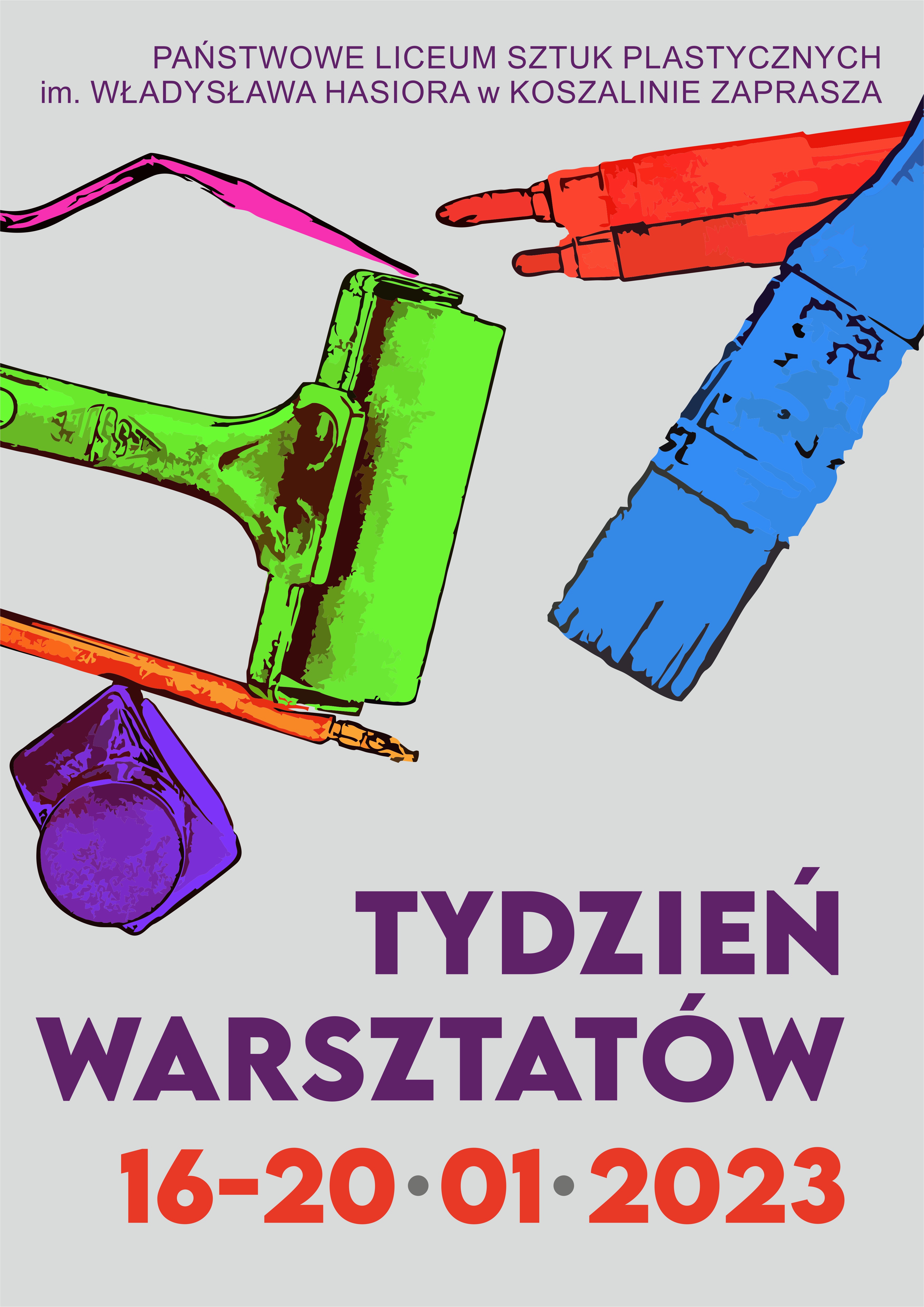 Państwowe Liceum Sztuk Plastycznych im. Władysława Hasiora w Koszalinie serdecznie zaprasza na Tydzień WARSZTATÓW organizowany w dniach 16-20 stycznia 2023 roku. Przez pięć dni nauczyciele przedmiotów artystycznych przeprowadzać będą 11 warsztatów z każdego artystycznego przedmiotu realizowanego w programie liceum plastycznego.