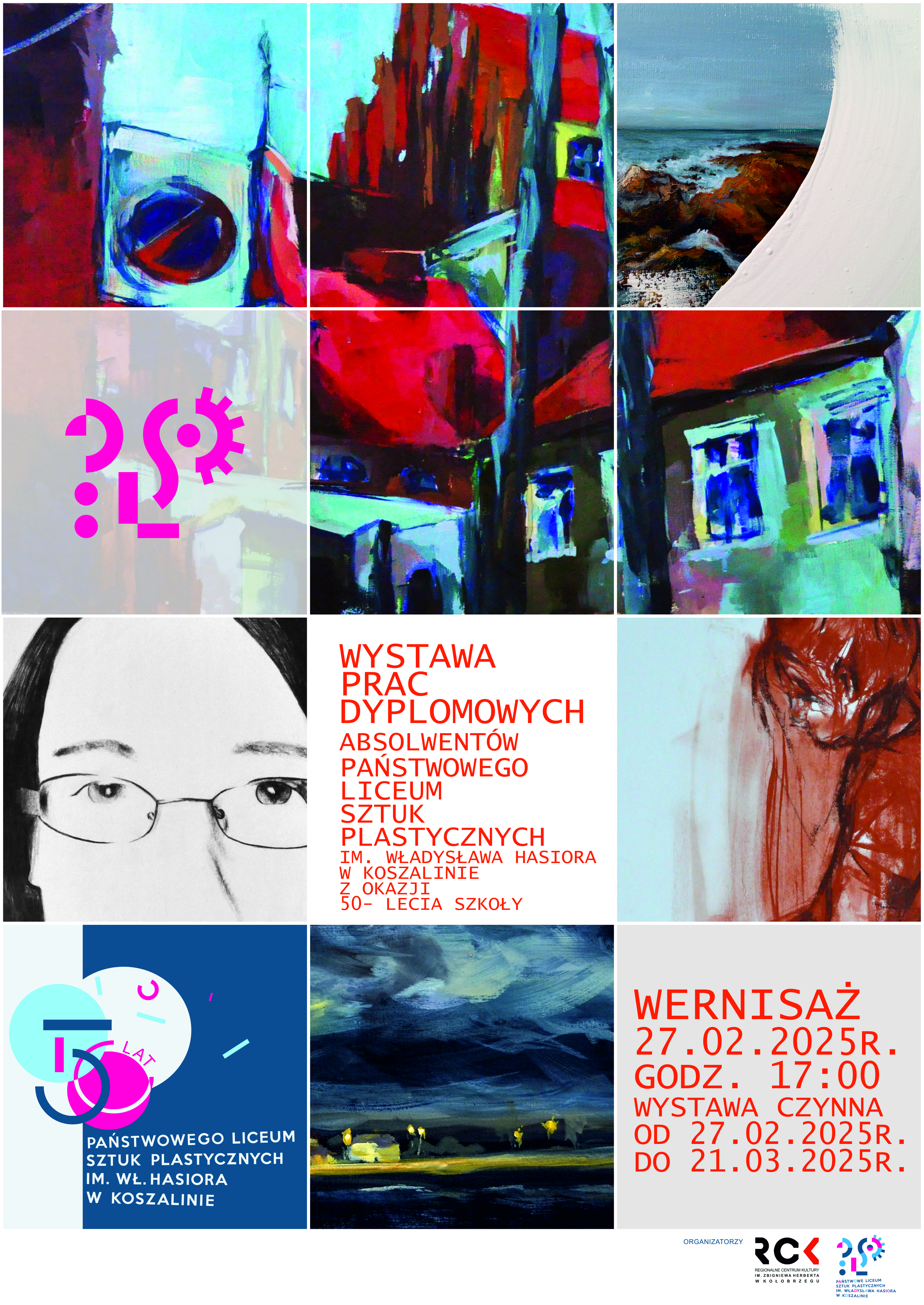 Serdecznie zapraszamy na WYSTAWĘ PRAC DYPLOMOWYCH ABSOLWENTÓW Państwowego Liceum Sztuk Plastycznych w Koszalinie. Wydarzenie to otwiera obchody 50-lecia Państwowego Liceum Sztuk Plastycznych im. Wł. Hasiora w Koszalinie zaplanowane na cały 2025 rok.