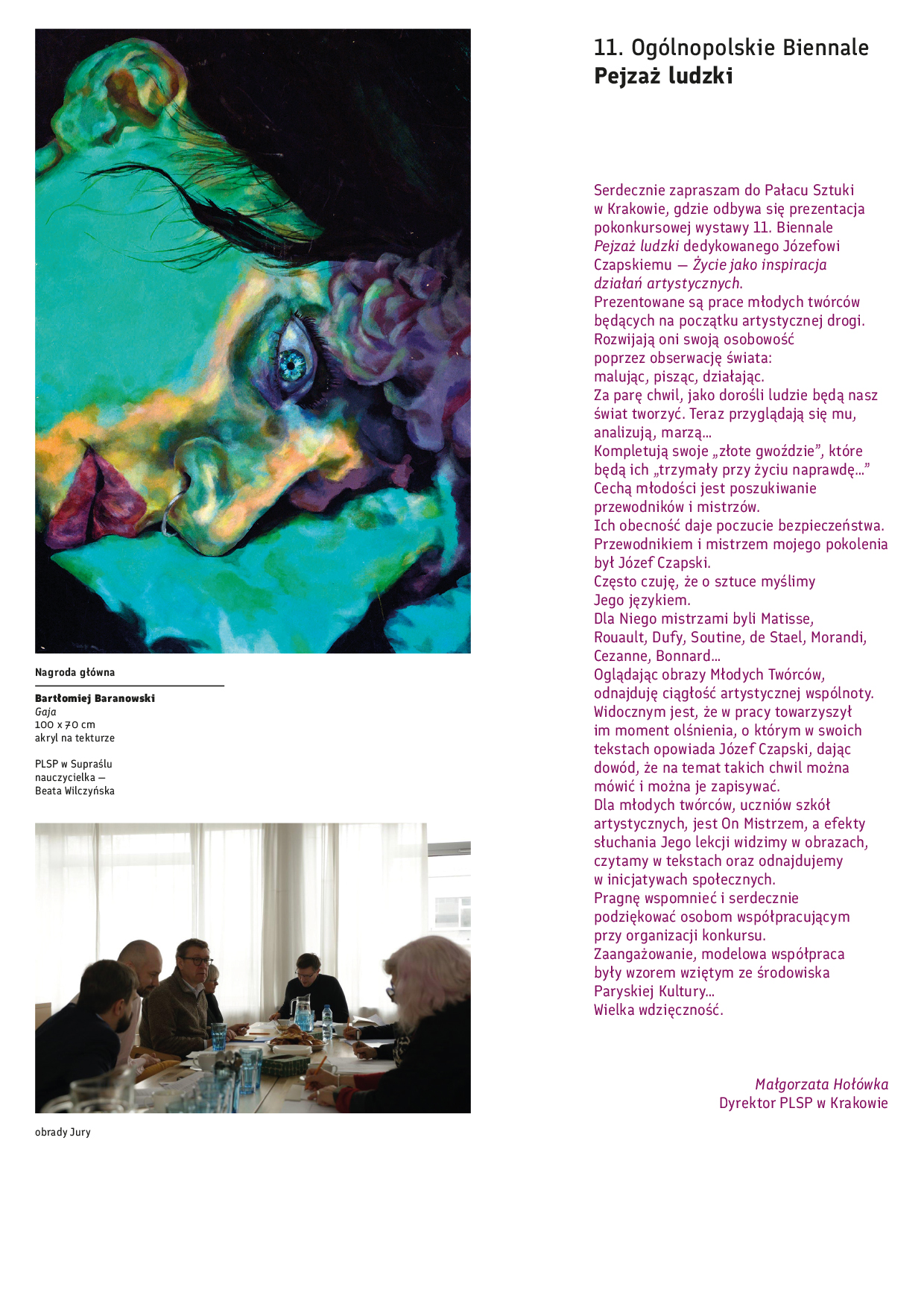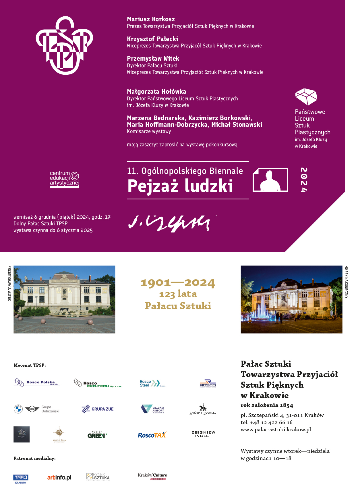 W dniu 06 grudnia 2024 r. o godz. 17.00 w Pałacu Sztuki, pl. Szczepański 4, odbędzie się wernisaż wystawy pokonkursowej 11. Ogólnopolskiego Biennale „Pejzaż ludzki” dedykowanego Józefowi Czapskiemu. Podczas uroczystości wręczone zostaną nagrody i wyróżnienia przyznane w konkursie.