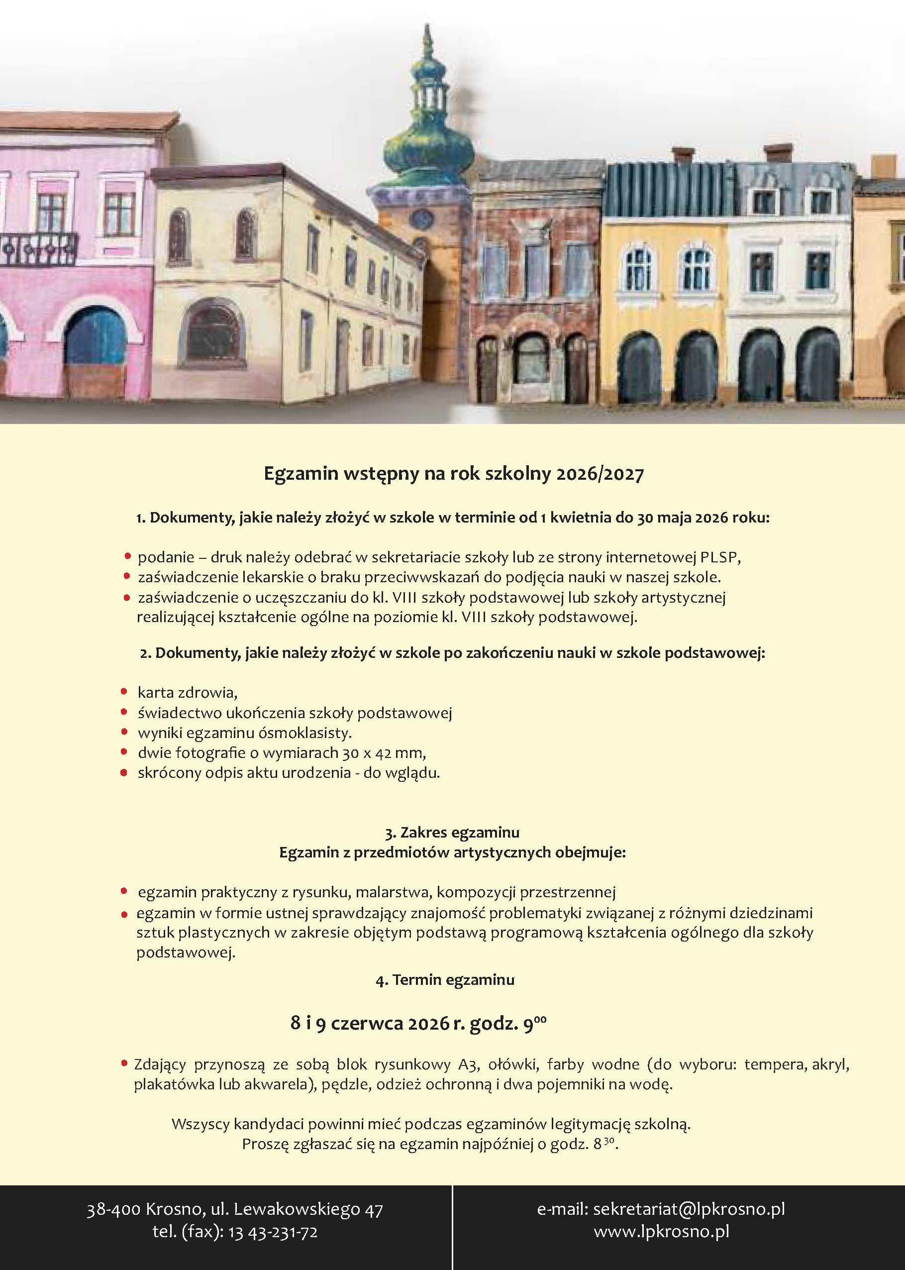 Zdający przynoszą ze sobą blok rysunkowy A3, ołówki, farby wodne (do wyboru: tempera, akryl, plakatówka lub akwarela), pędzle, odzież ochronną i dwa pojemniki na wodę. Wszyscy kandydaci powinni mieć podczas egzaminów legitymację szkolną.