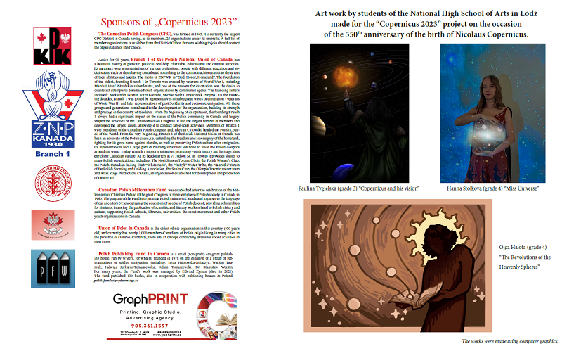 Z przyjemnością informujemy o uczestnictwie naszych uczennic: Pauliny Tygielskiej, Olgi Haloty i Hanny Stoikovej w projekcie „Copernicus” zrealizowanym w Kanadzie z okazji 550. rocznicy urodzin Mikołaja Kopernika. Ich prace plastyczne uświetniły jedną z imprez (w języku polskim), która odbyła się 18 października br. w Centrum Kultury im. Jana Pawła II w Mississauga (GTA Toronto). Były one prezentowane wraz z opisami i wprowadzeniem na dużym ekranie w przerwie między częścią naukową a spektaklem teatralnym „Włos Kopernika”. Zostały też wykorzystane w anglojęzycznej wersji publikacji „Copernicus 2023” – dodatkowo praca Olgi Haloty ozdobiła okładkę programu teatralnego jednoaktówki „Włos Kopernika”.