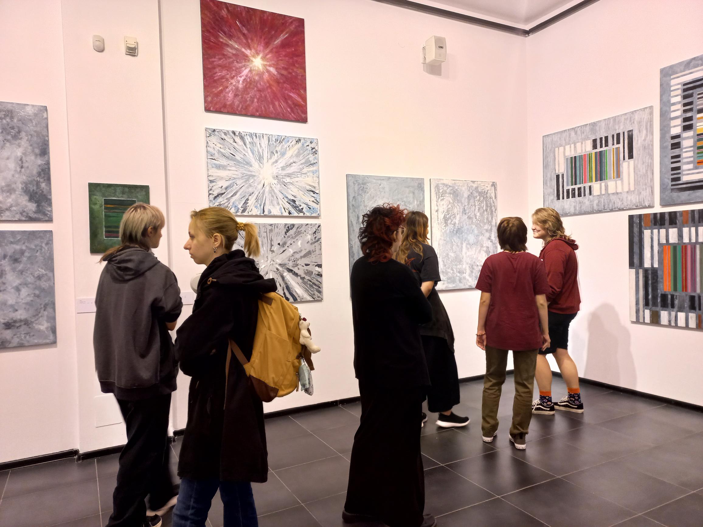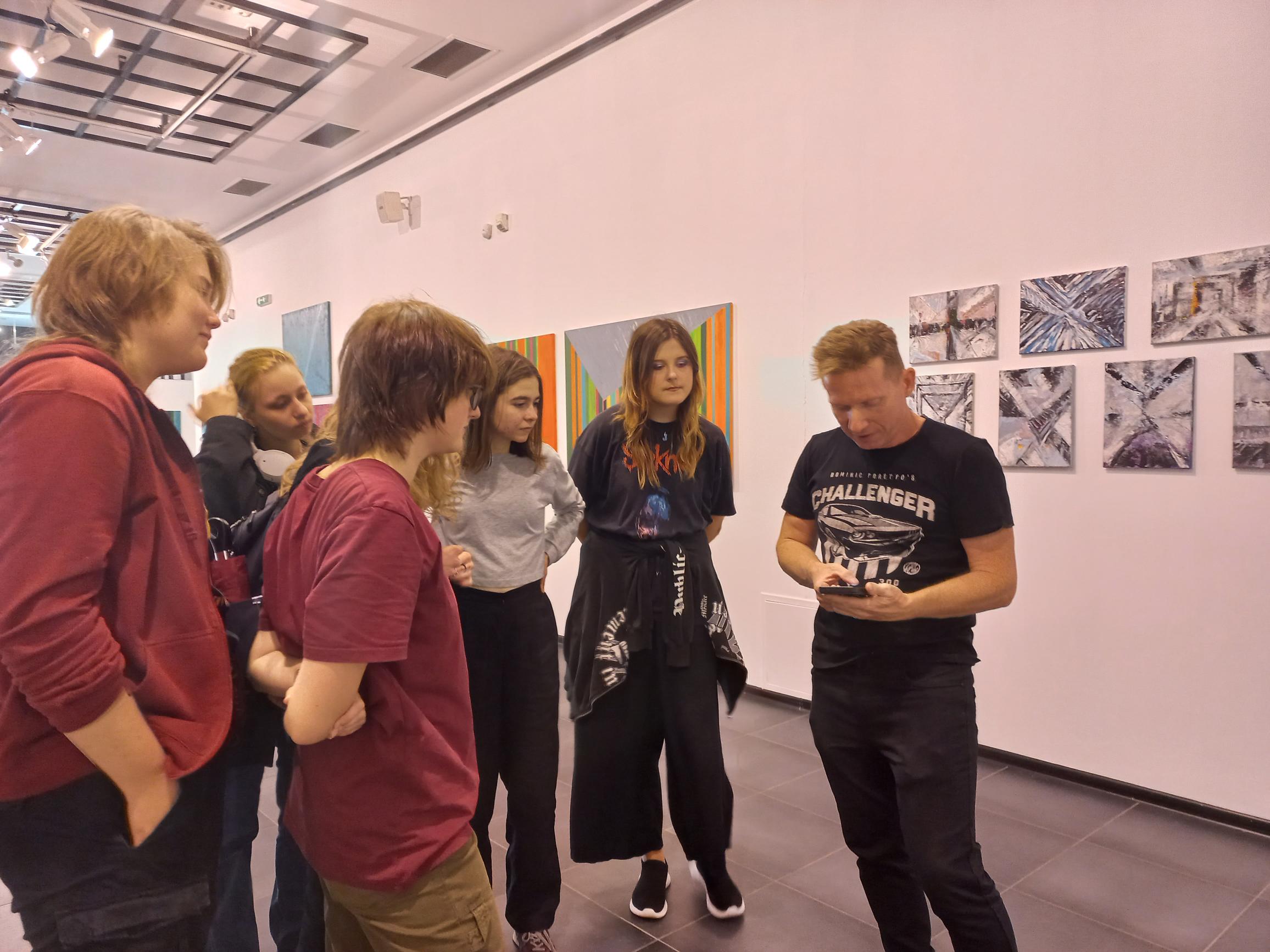 Po swojej wystawie malarstwa abstrakcyjnego twórca osobiście oprowadzał uczennice i towarzyszące im panie nauczycielki.
