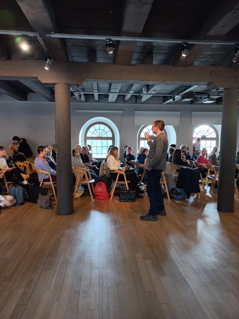 Prelekcja została poprzedzona godzinnym wykładem p. Piotra Stępniaka z Ceramiki Paradyż n/t technologii produkcji płytek ceramicznych. Po krótkiej przerwie, wzbogaceni o wiedzę, jak powstają płytki ceramiczne, nasi uczniowie i inni goście wysłuchali prelekcji o łódzkich mozaikach, które w okresie PRL-u nie tylko w naszym mieście były dosyć popularną ozdobą architektoniczną zarówno wewnątrz, jak i na zewnątrz budynków. Prowadzący prelekcję p. Bartosz Stępień omówił zarówno nieistniejące już realizacje, jak i te, które w sposób bardziej lub mniej widoczny (są wnętrza, które zmieniły swoje przeznaczenie i zdobione ściany zostały zasłonięte), nadal upiększają różne budynki.