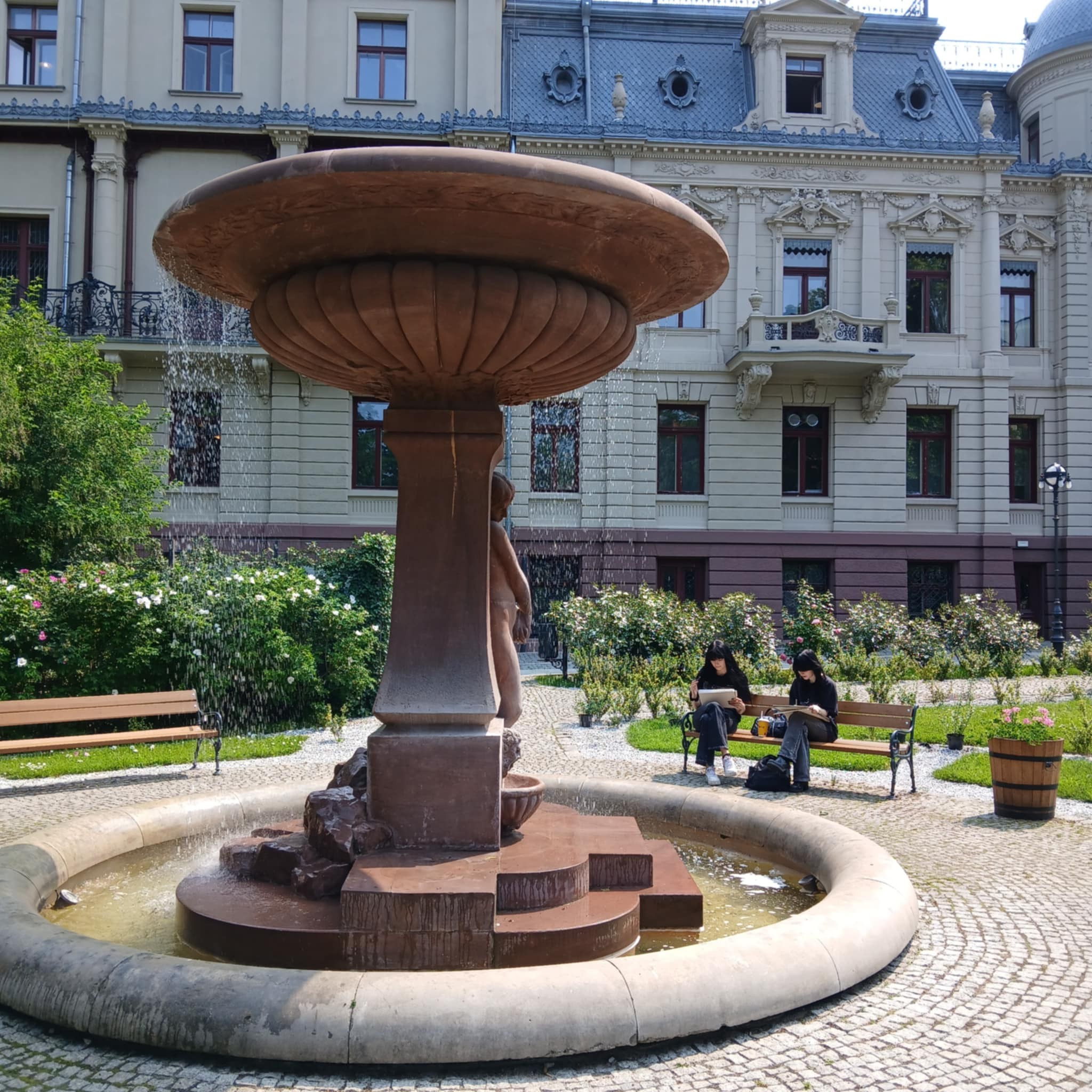 Na uczniowskich pracach znalazł się zatem neobarokowy pałac z reprezentacyjnym dziedzińcem, którego dekoracja zewnętrzna nawiązuje do uproszczonych form klasycystycznych (klasycyzujące są również wnętrza), a także ogród „włoski” z symetrycznymi prostokątnymi kwaterami.