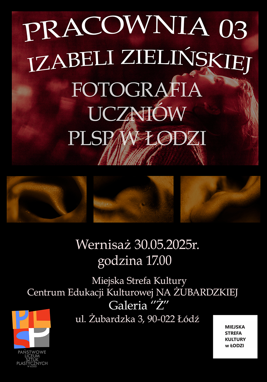 "Wystawa fotograficzna Pracowni 03, czyli prac młodzieży "Łódzkiego Plastyka", to ekspozycja zdjęć powstałych w ramach zajęć na kierunku fotografia i film, prowadzonych w PLSP przez p. Izabelę Zielińską.