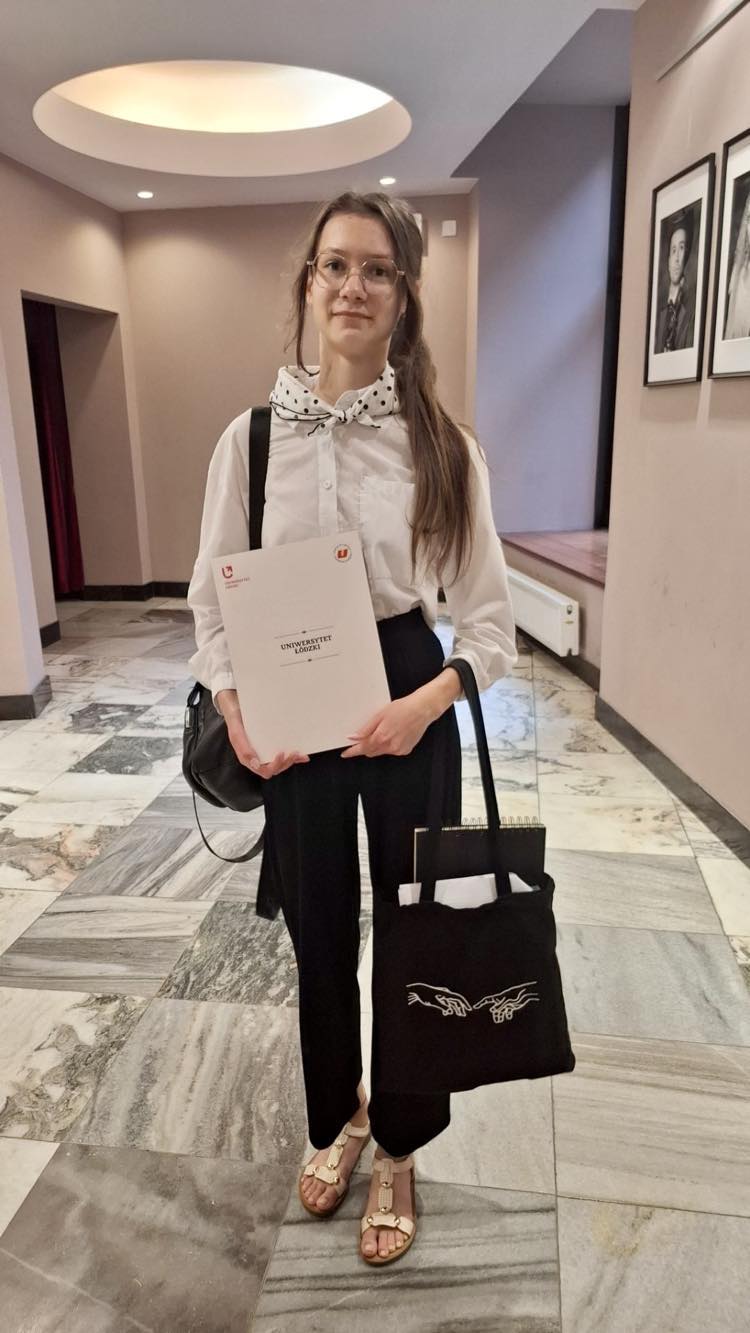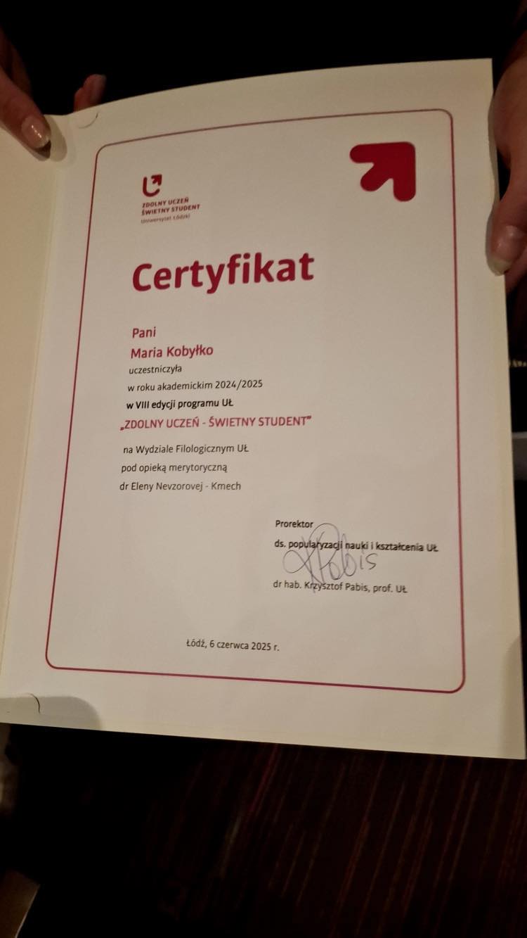 W czwartek, 5 czerwca, w pięknej i nowoczesnej auli Wydziału Filologicznego Uniwersytetu Łódzkiego nasza uczennica Mariia Kobylko (z klasy Ib) zaprezentowała efekty swojej kilkumiesięcznej pracy w ramach VIII edycji programu „Zdolny uczeń - świetny student”, realizowanego na Wydziale Filologicznym UŁ.
