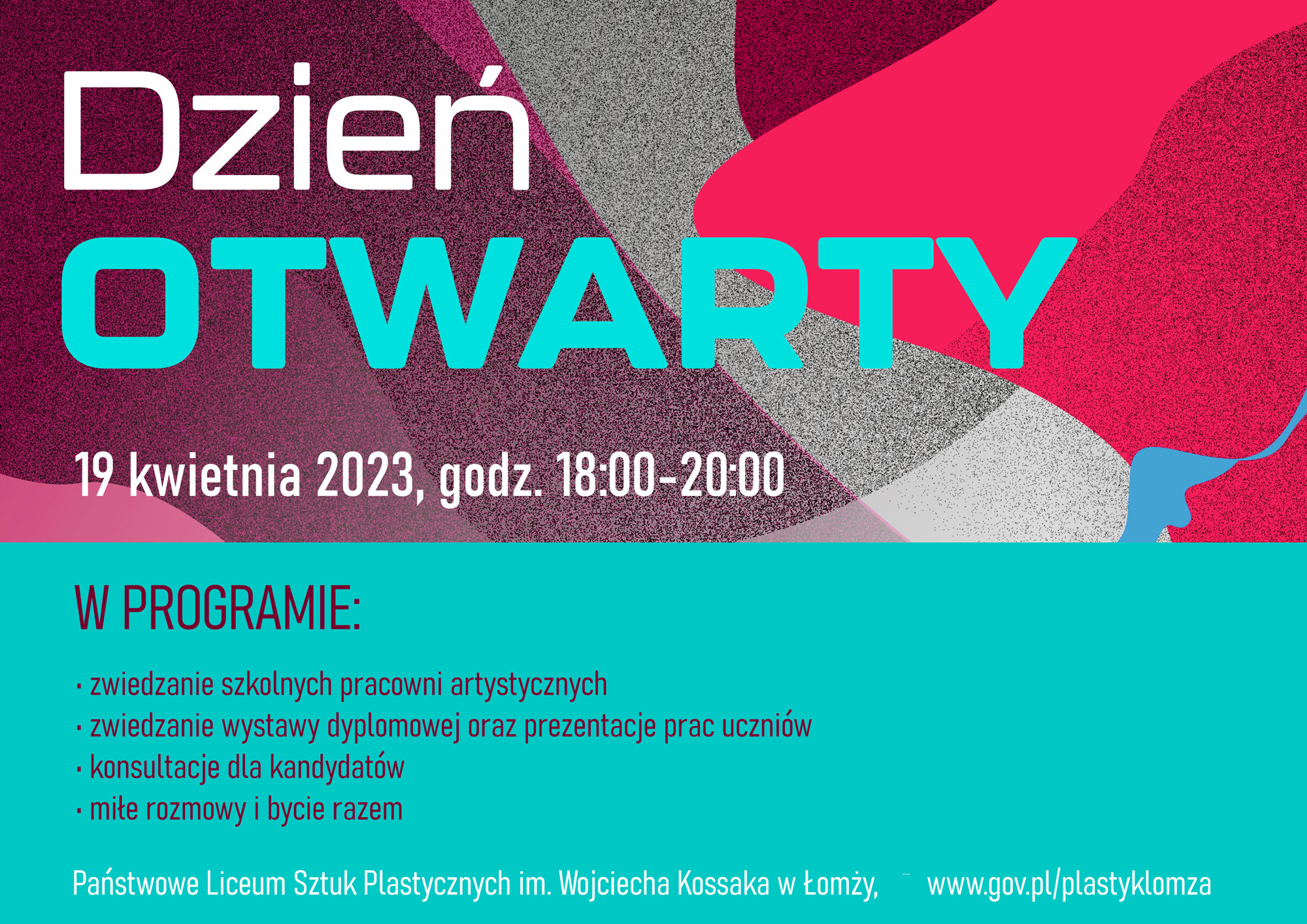 Państwowe Liceum Sztuk Plastycznych im. Wojciecha Kossaka w Łomży zaprasza na Dzień Otwarty, 19 kwietnia 2023 r. w godz. od 18:00 do 20:00