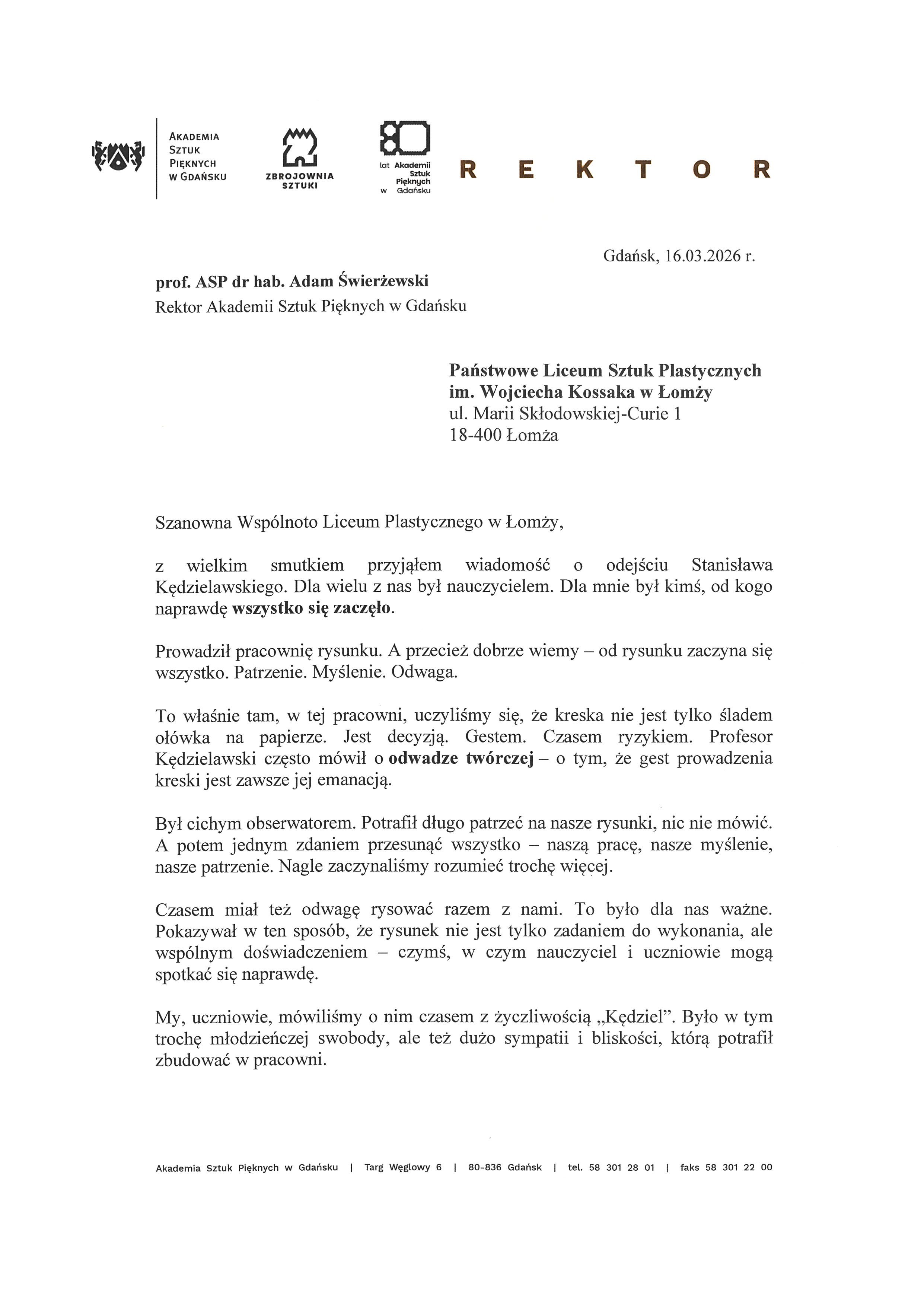 Wśród wciąż spływających kondolencji na szczególną uwagę zasługuje list Rektora Akademii Sztuk Pięknych w Gdańsku, skierowany do społeczności Państwowego Liceum Sztuk Plastycznych im. Wojciecha Kossaka w Łomży.