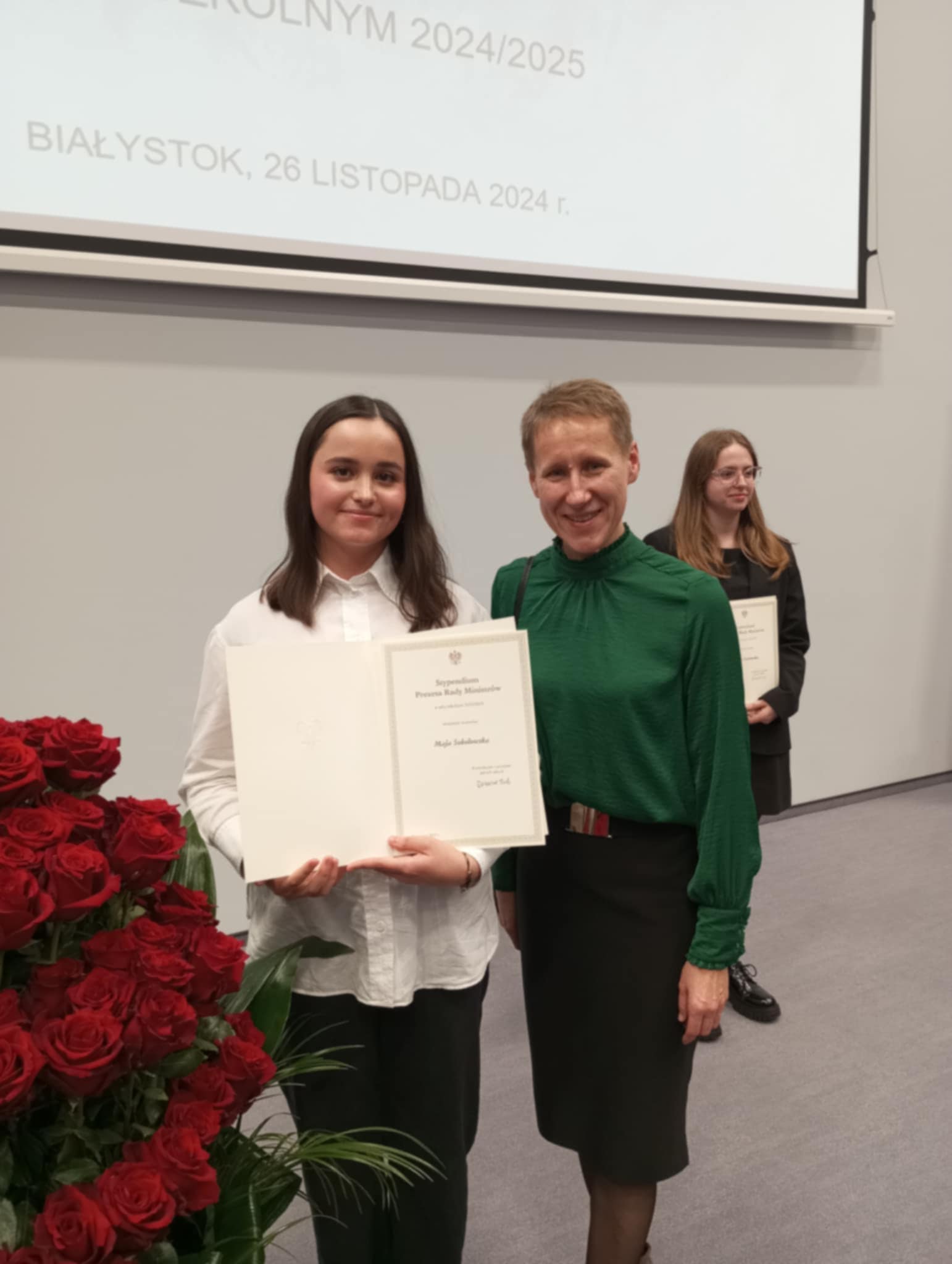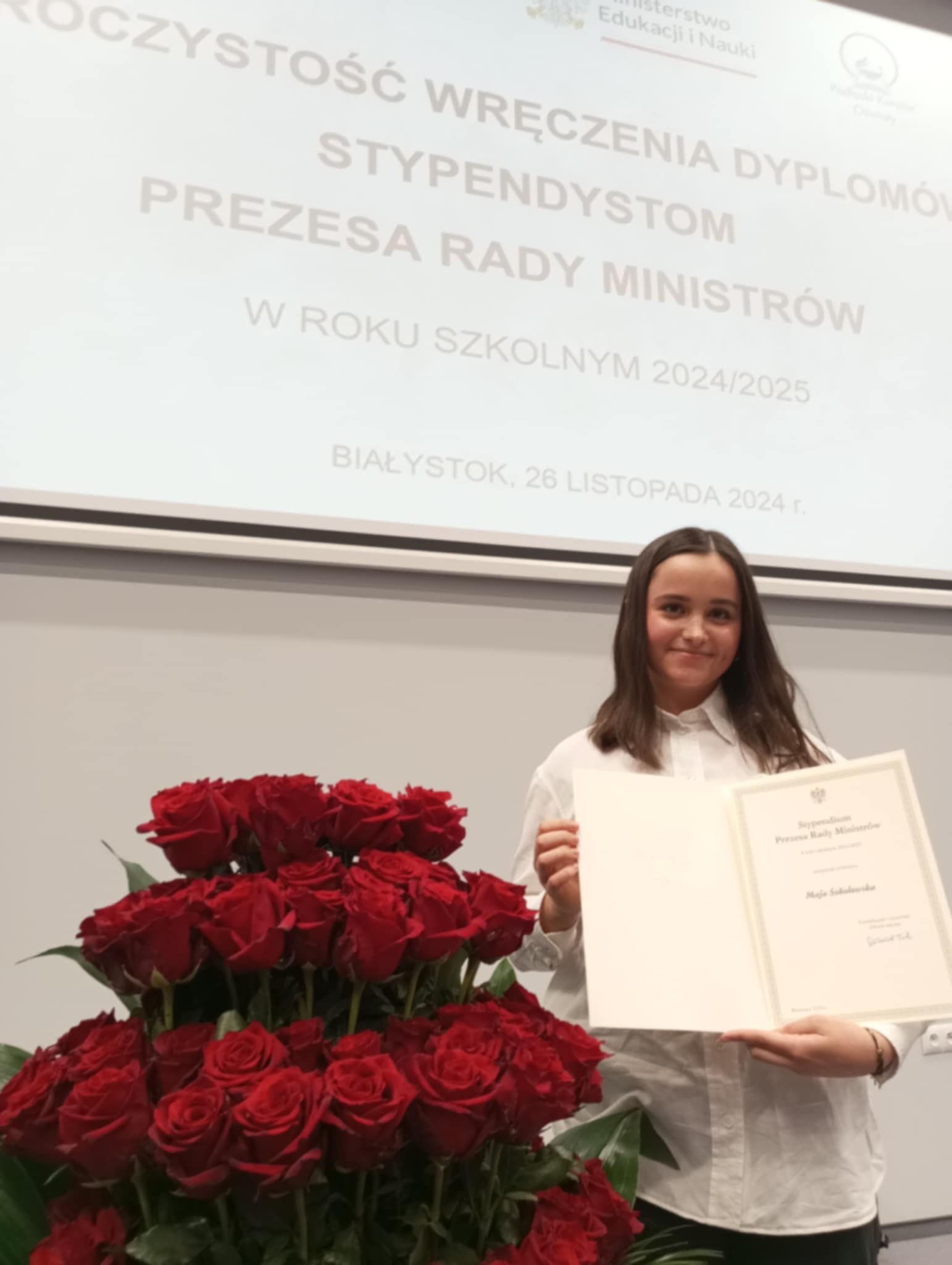 Jest nam niezmiernie miło poinformować, że nasza uczennica Maja Sokołowska znalazła się wśród 128 najlepszych uczniów województwa podlaskiego. Gala wręczenia stypendiów Prezesa Rady Ministrów, podczas której Maja została wyrózniona odbyła się 26.11.2024 r. w Białymstoku.