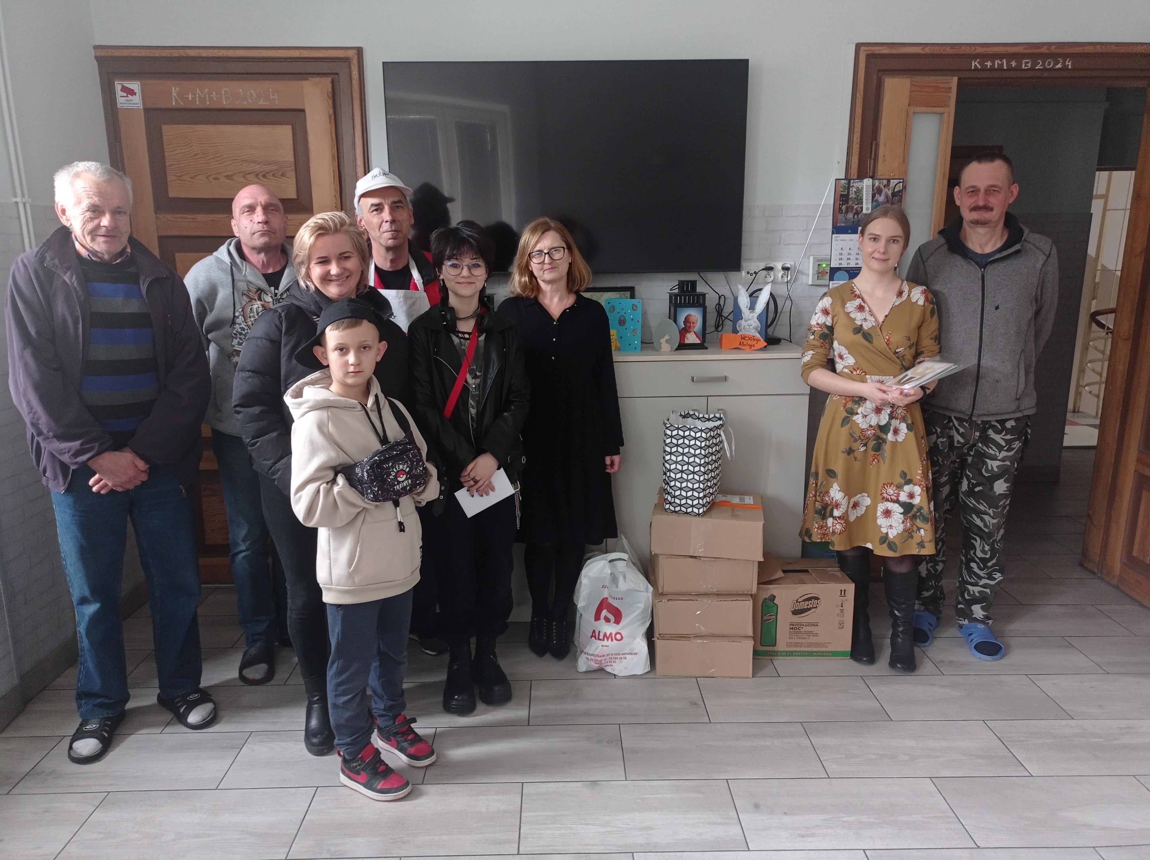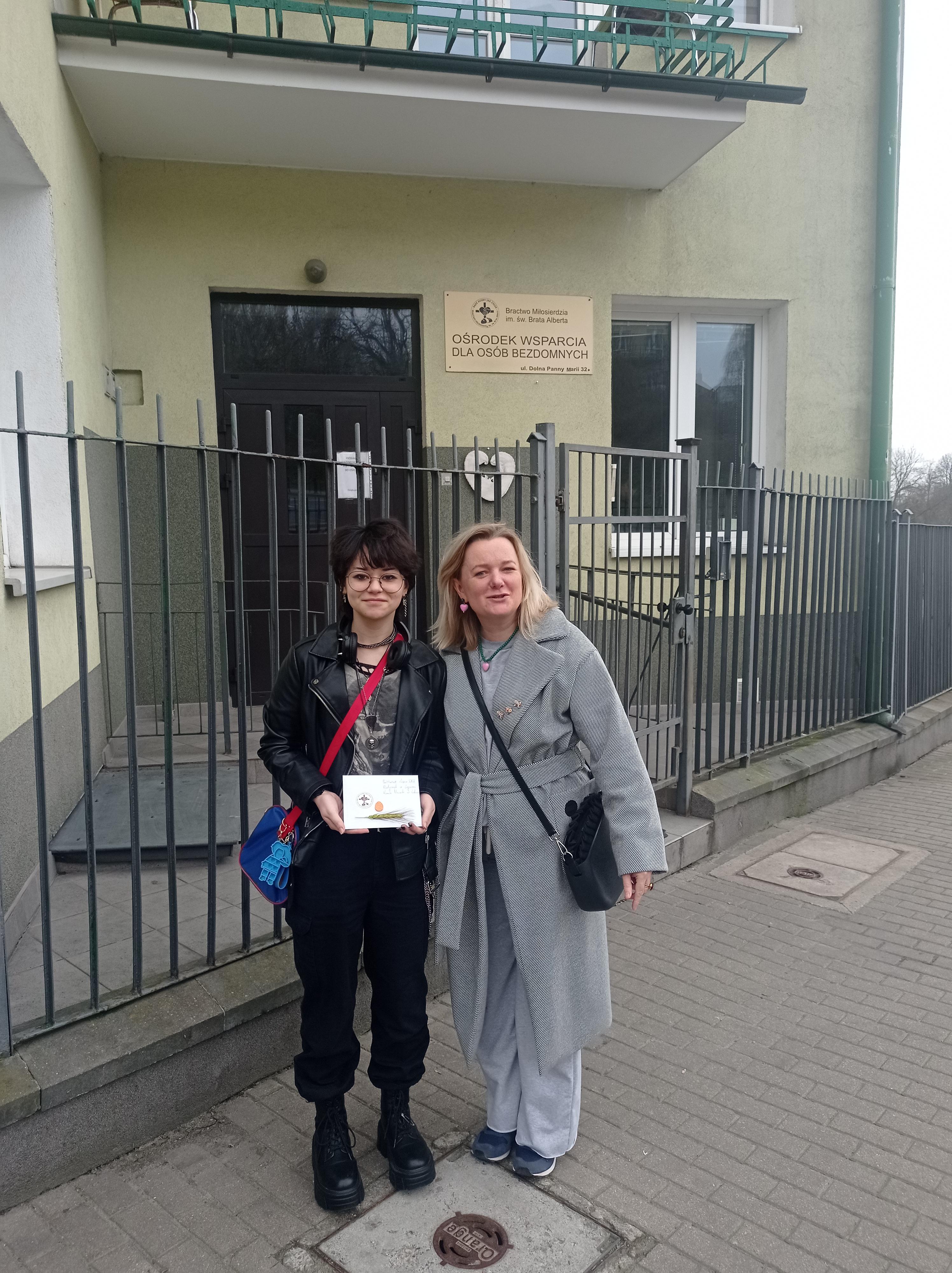 28 marca 2024 r. uczniowie z klasy 1b z paniami Anetą Lekan oraz Sylwią Tułajew udali się do Ośrodka Wsparcia dla Osób Bezdomnych, gdzie wręczyli wszystkie zebrane środki higieny osobistej, kartki świąteczne oraz kubki termiczne zakupione z pieniędzy uzyskanych z kiermaszu ciast.