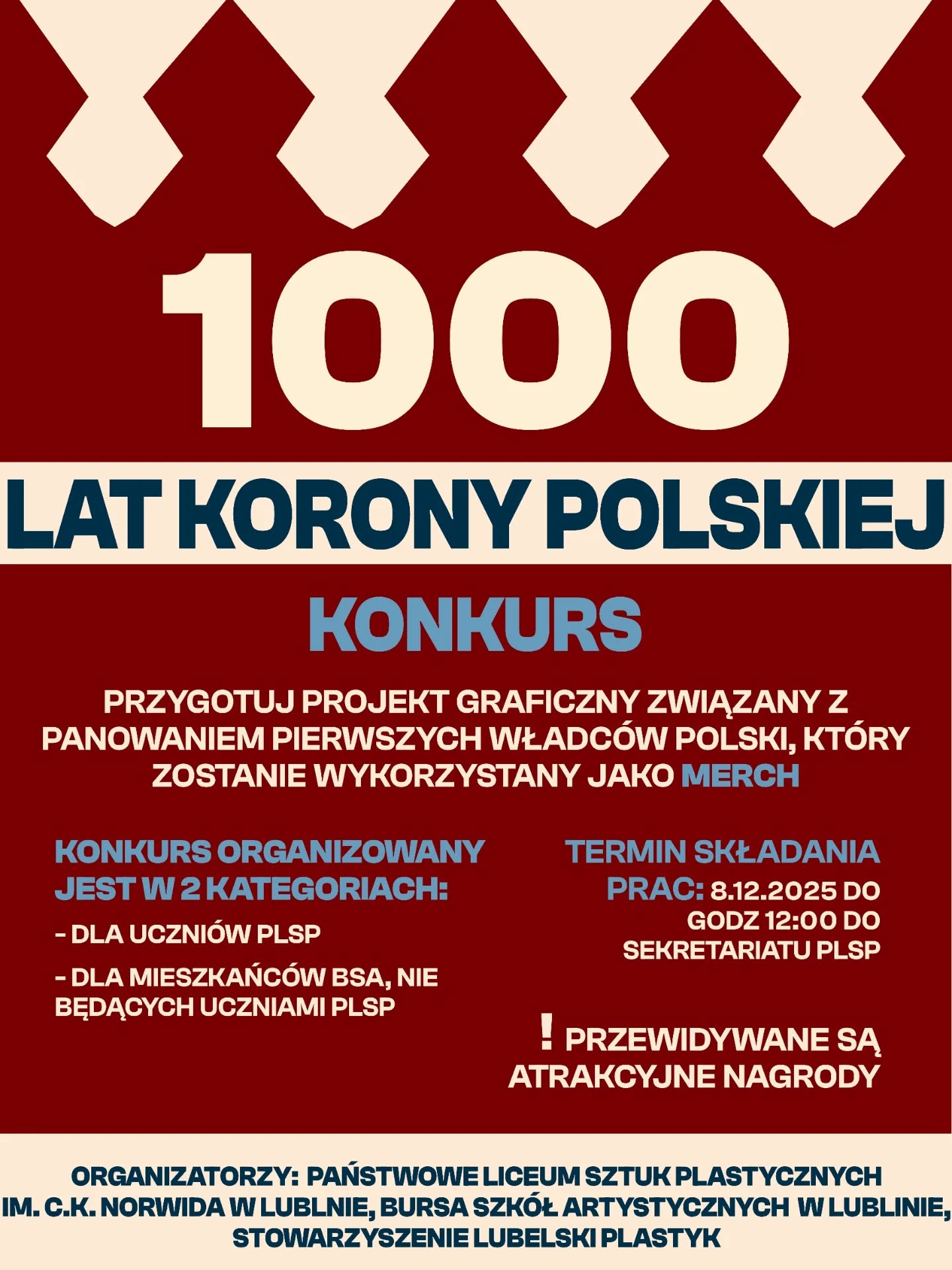 Państwowe Liceum Sztuk Plastycznych im. C. K. Norwida w Lublinie zaprasza do udziału w konkursie „1000 lat Korony Polskiej”, którego celem jest uczczenie dziedzictwa pierwszych władców Polski oraz rozwijanie kreatywności młodych twórców.
