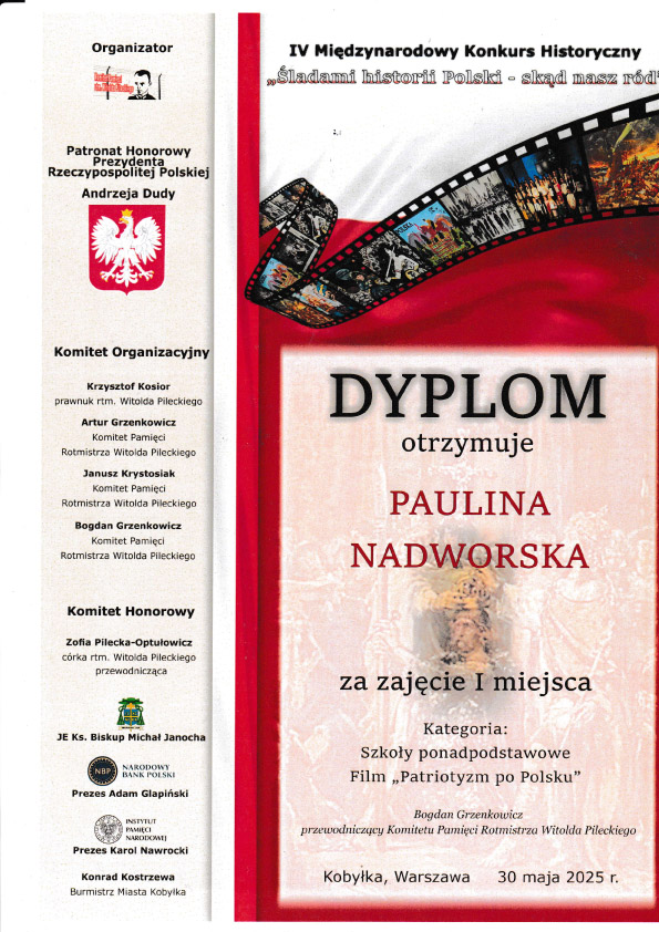 Tym bardziej cieszy fakt, że Paulina Nadworska (klasa II A) zajęła I miejsce w kategorii multimedialnej wykonując pracę dotyczącą sportowca i działacza konspiracji niepodległościowej Janusza Kusocińskiego (nauczyciel prowadzący Tomasz Banaszkiewicz).