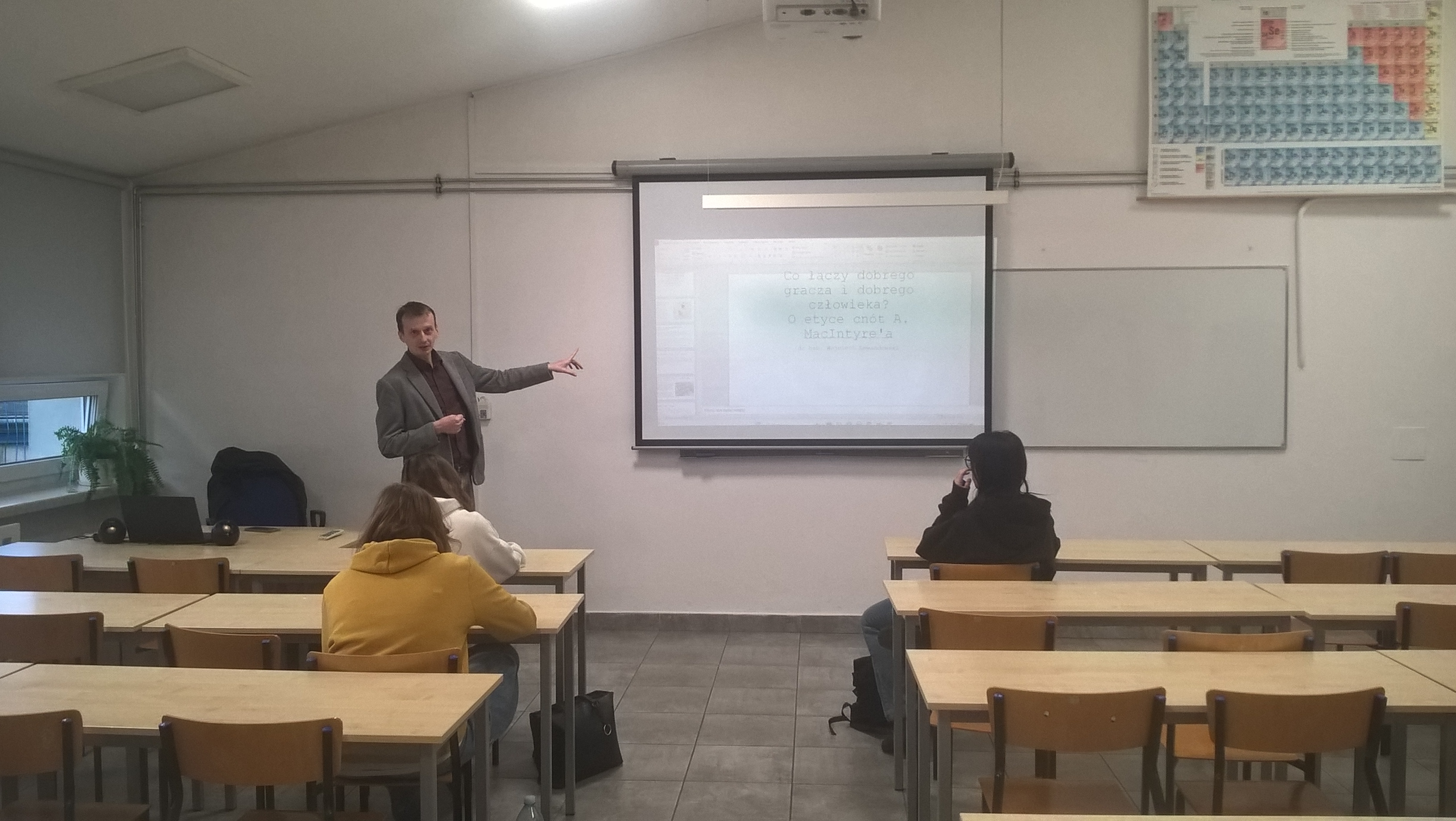 22 października br. w naszej szkole gościliśmy prof. Wojciecha Lewandowskiego z Katedry Etyki KUL, który wygłosił wykład poświęcony współczesnej etyce cnót według koncepcji Alasdaira MacIntyre’a. Spotkanie odbyło się w ramach współpracy PLSP z Wydziałem Filozofii KUL, a wzięli w nim udział uczniowie uczestniczący w zajęciach z etyki.