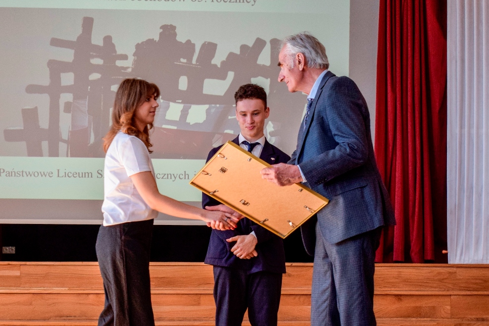 Dyrektor szkoły pan Krzysztof Dąbek odebrał od prezesa lubelskiego oddziału Stowarzyszenia Wspólnota Polska pamiątkowy medal oraz od prezesa lubelskiego oddziału Związku Sybiraków Medal "95. rocznica powstania Związku Sybiraków".