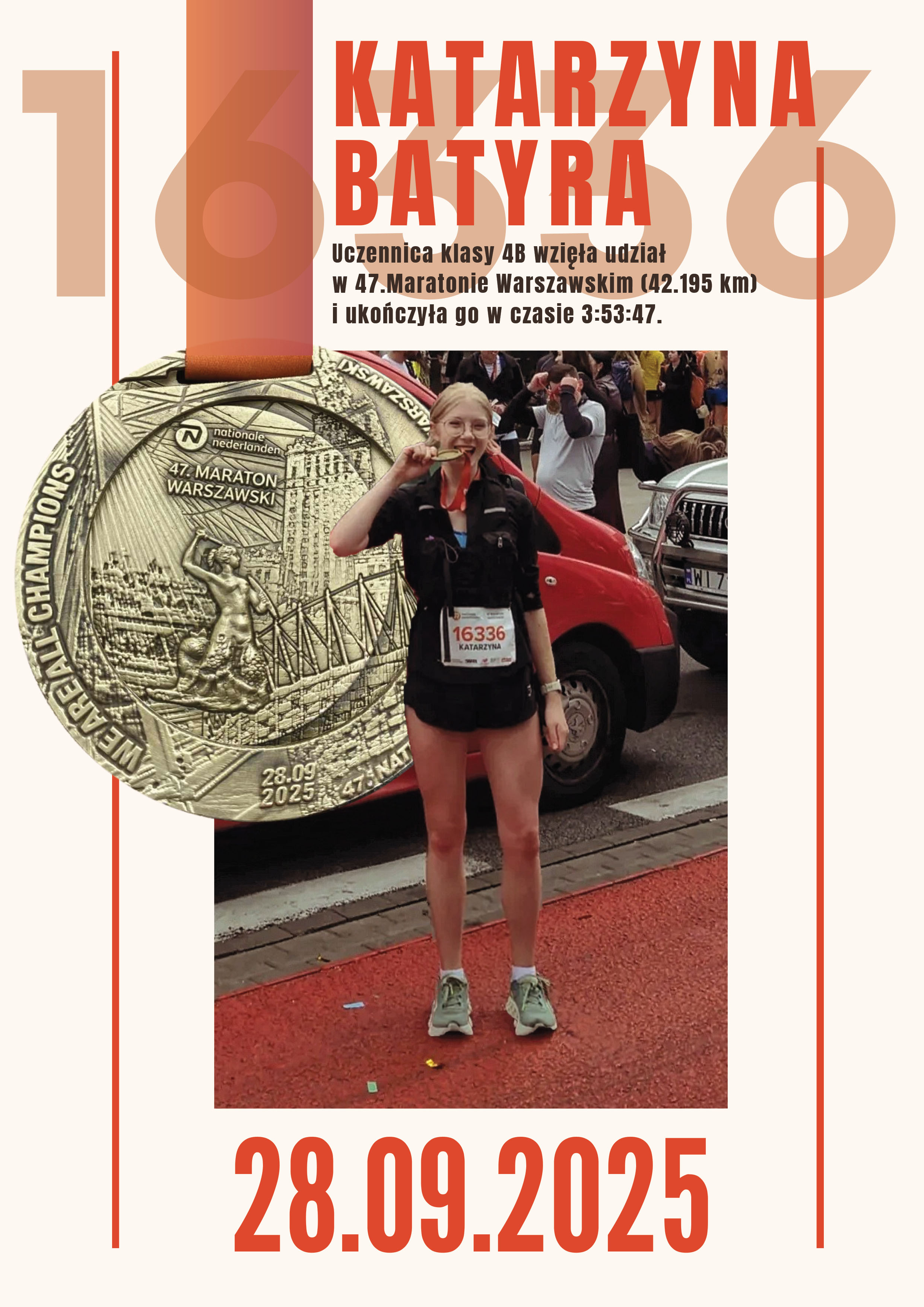 Z radością informujemy, że uczennica PLSP w Lublinie, Katarzyna Batyra, wzięła udział w 47. Maratonie Warszawskim, który odbył się 28 września 2025 roku. Kasia pokonała pełen dystans 42,195 km z czasem 3:53:47.