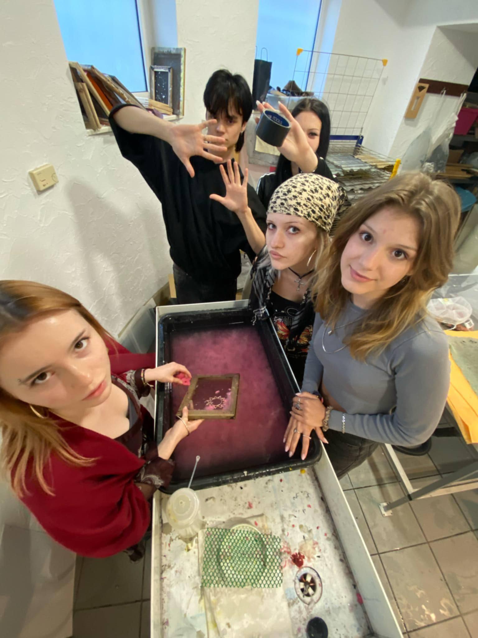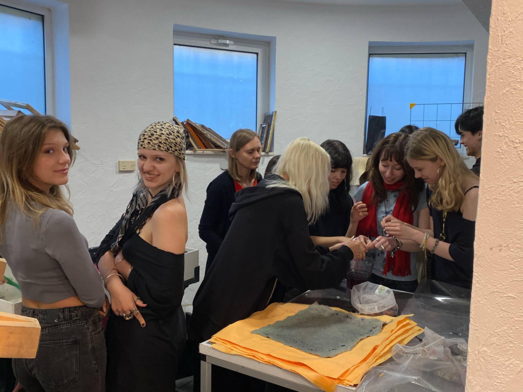 Pierwszego dnia dr Paweł Napierała z Pracowni Technik Malarskich i Rysunkowych opowiadał o technikach malarskich, a Joanna Kokoć z Laboratorium papieru opowiedziała o pracowni i zrobiła nam warsztaty czerpania papieru.