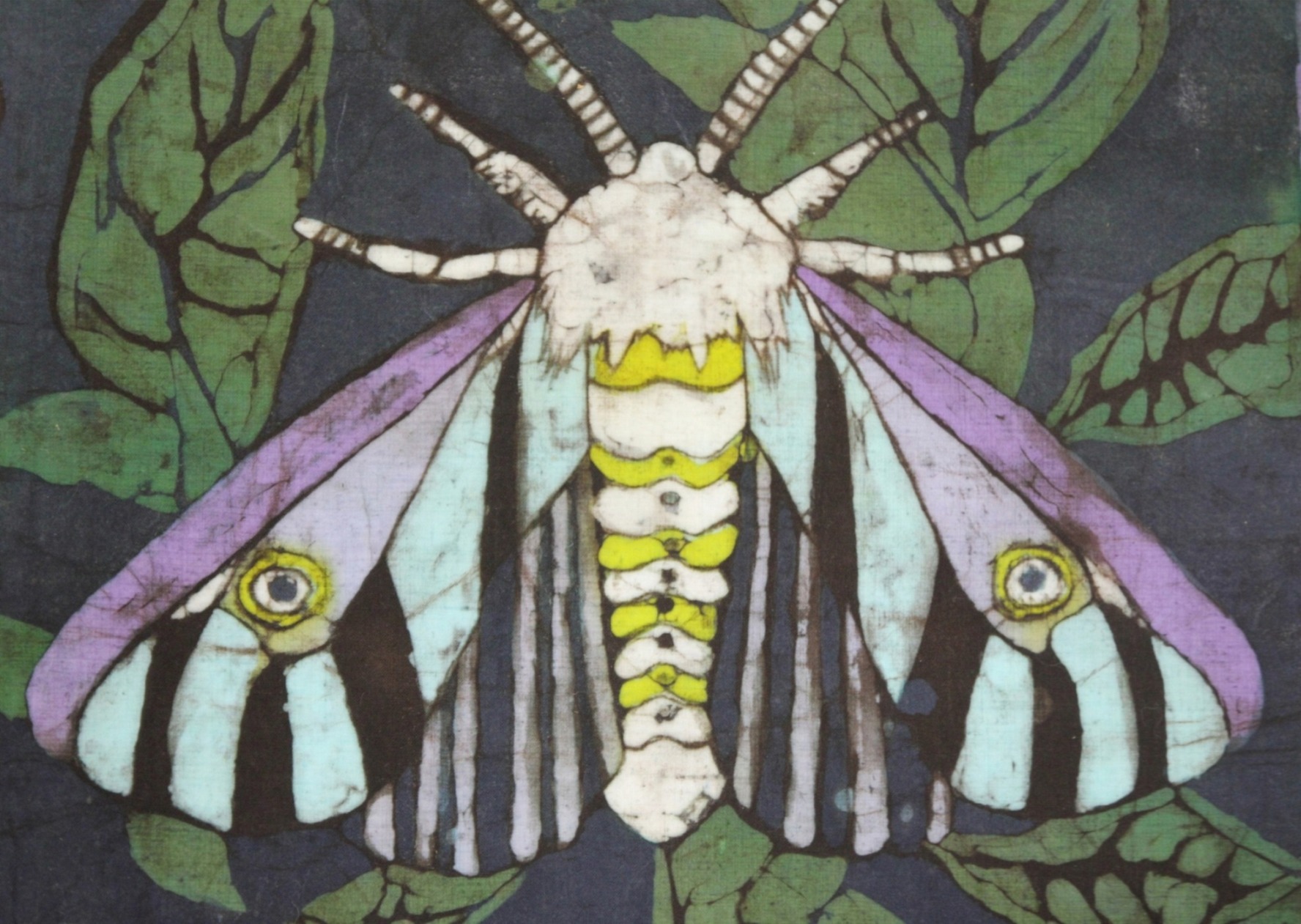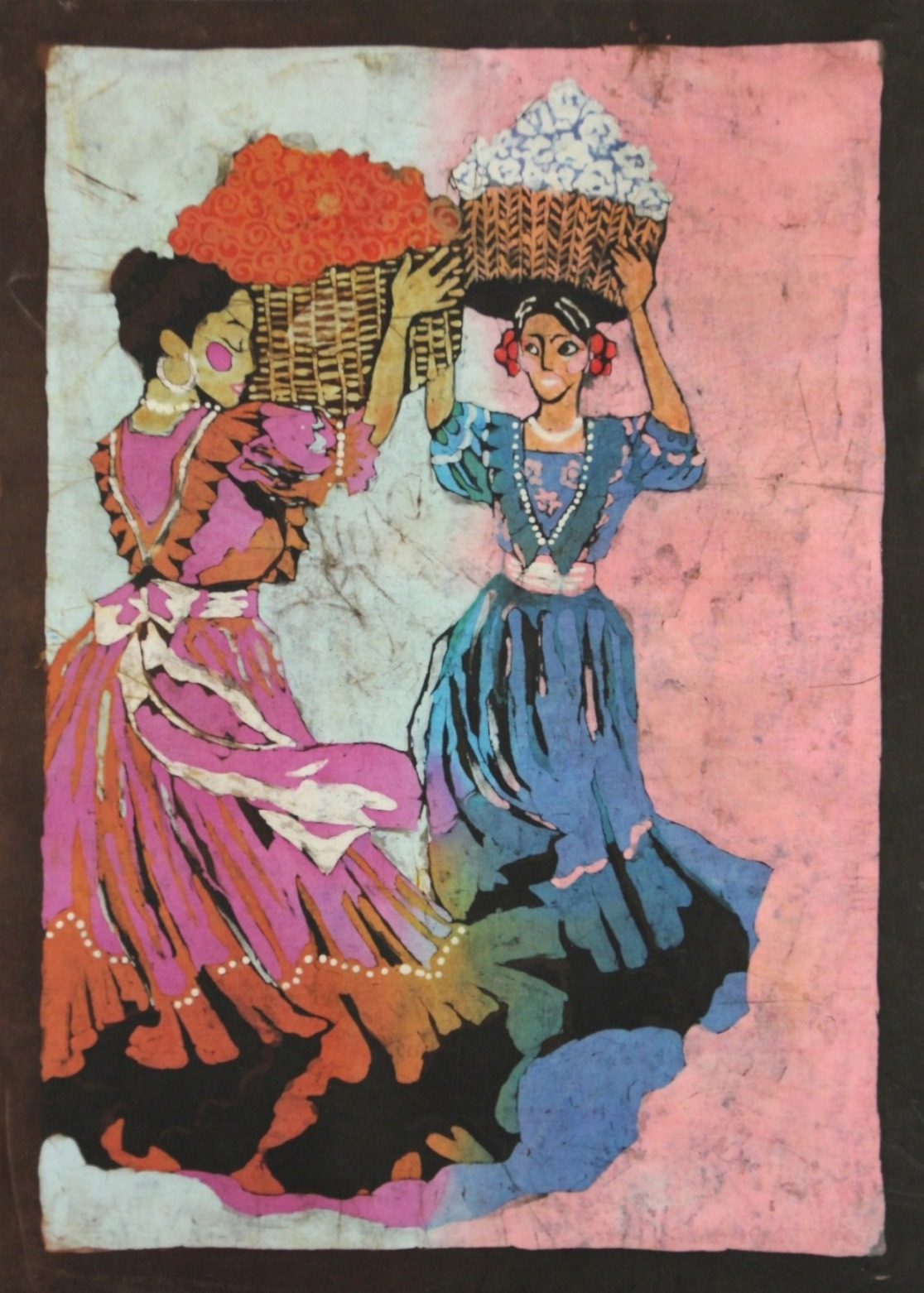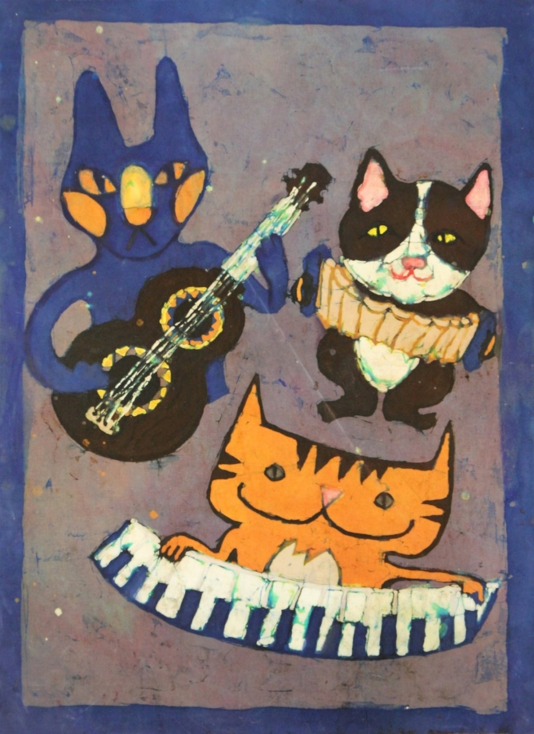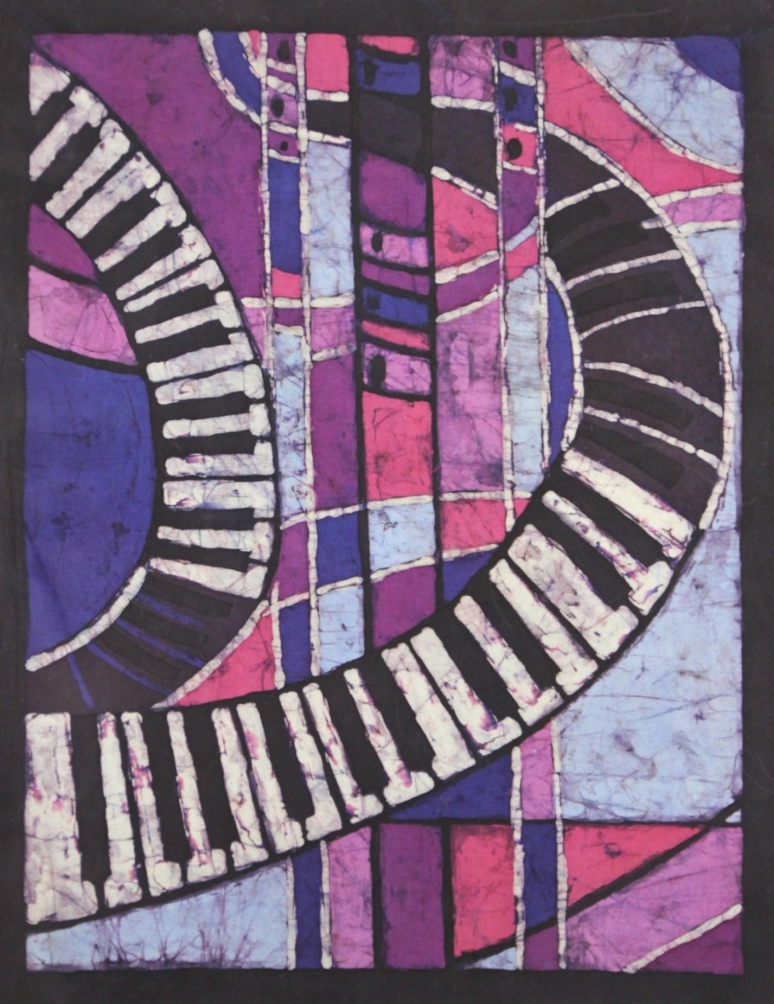Inspiracje te są widoczne w syntetycznym myśleniu o obrazie. Postacie tancerzy i motywy muzyczne ulegają uproszczeniu, podporządkowane są płaszczyźnie tkaniny i sile kontrastu. Kolor funkcjonuje tu nie opisowo, lecz emocjonalnie — buduje nastrój, tempo i intensywność, podobnie jak dźwięk w utworze muzycznym. Spękania wosku, nie do końca kontrolowane, wprowadzają element przypadku, który wzmacnia ekspresję prac i nadaje im organiczny charakter. Jako technika tkaniny artystycznej batik wymaga cierpliwości i planowania, a jednocześnie pozostawia przestrzeń dla improwizacji.