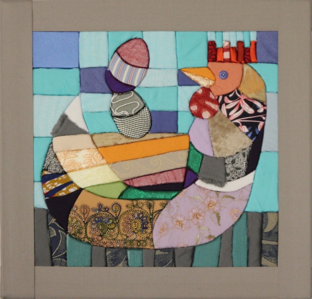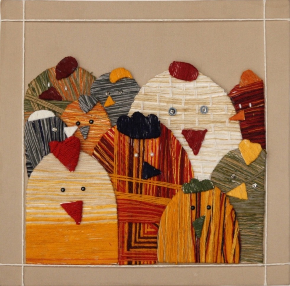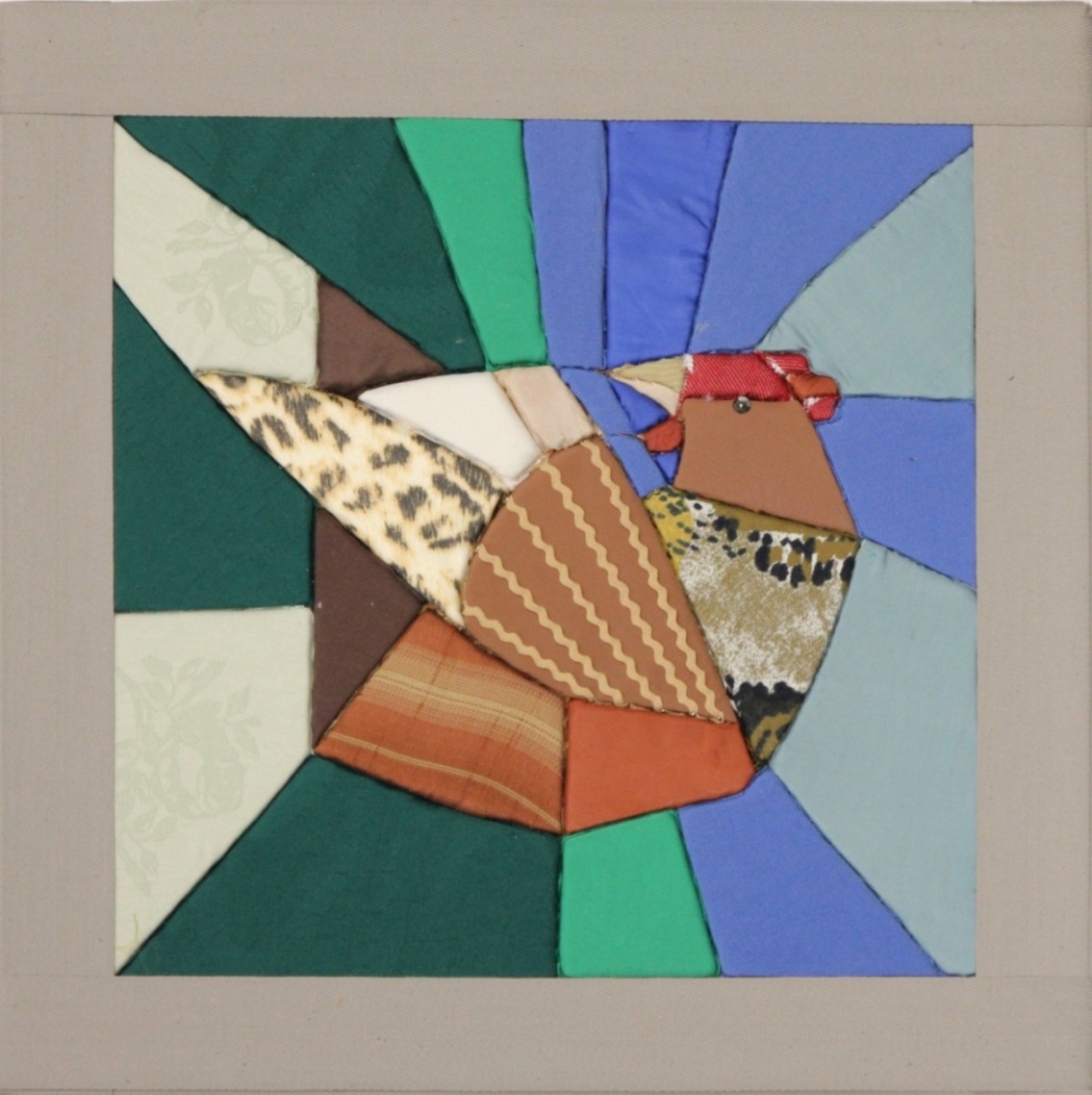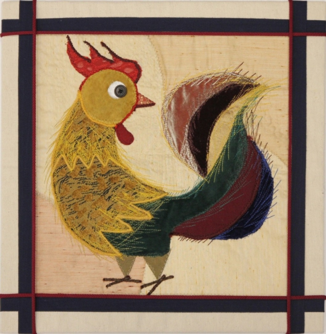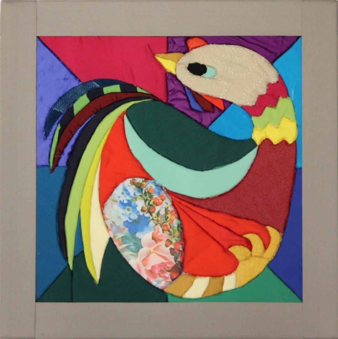 Prezentowane prace pokazują aplikację jako pełnoprawny środek wypowiedzi artystycznej, w którym dekoracyjność idzie w parze z syntezą formy. Motyw kur i kogutów staje się pretekstem do świadomego projektowania obrazu