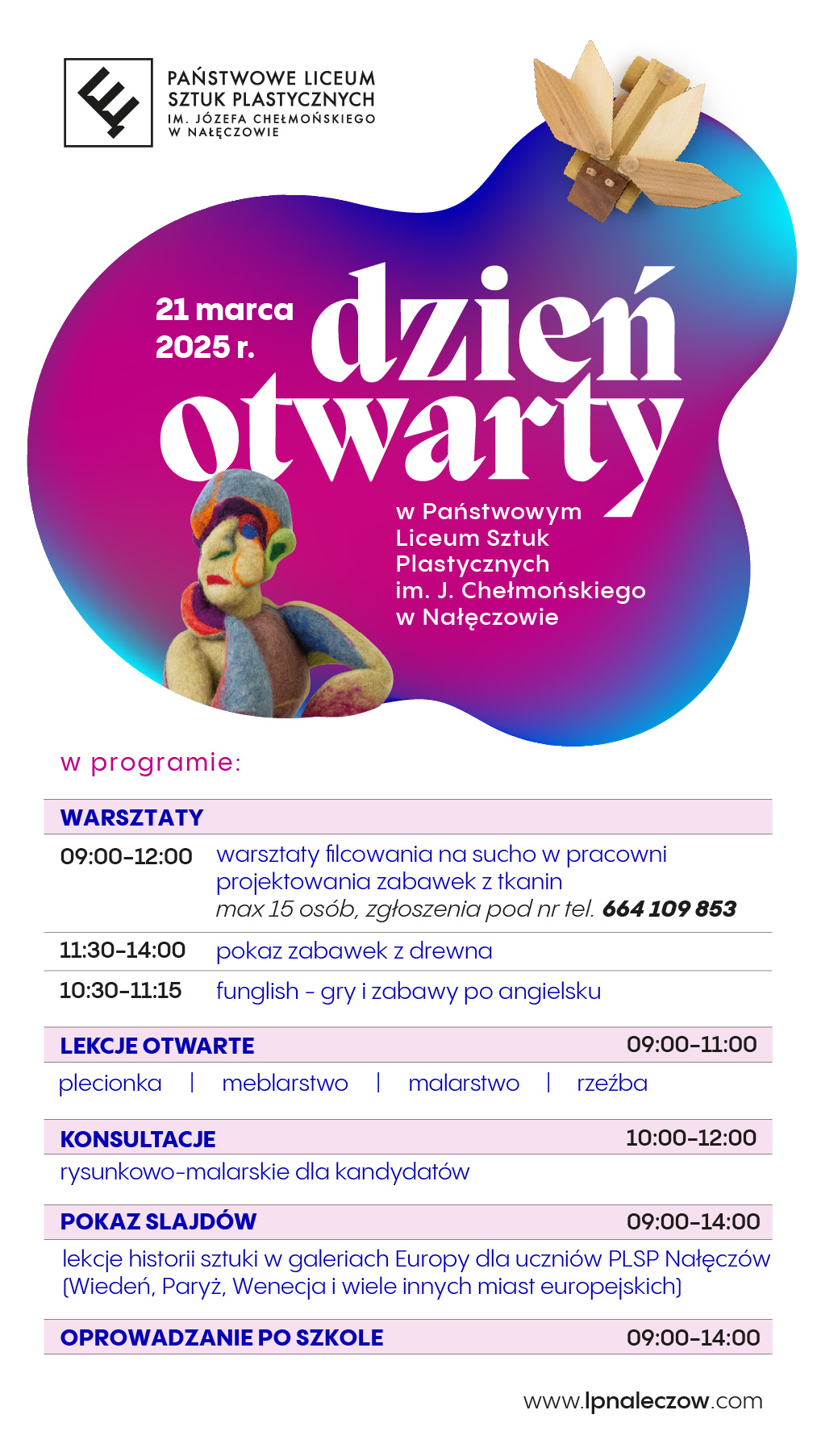 Serdecznie zapraszamy wszystkich chętnych do poznania naszej szkoły podczas DNIA OTWARTEGO, który odbędzie się w piątek 21 marca 2025 r. Zobacz, co robimy w Państwowym Liceum Sztuk Plastycznych w Nałęczowie.