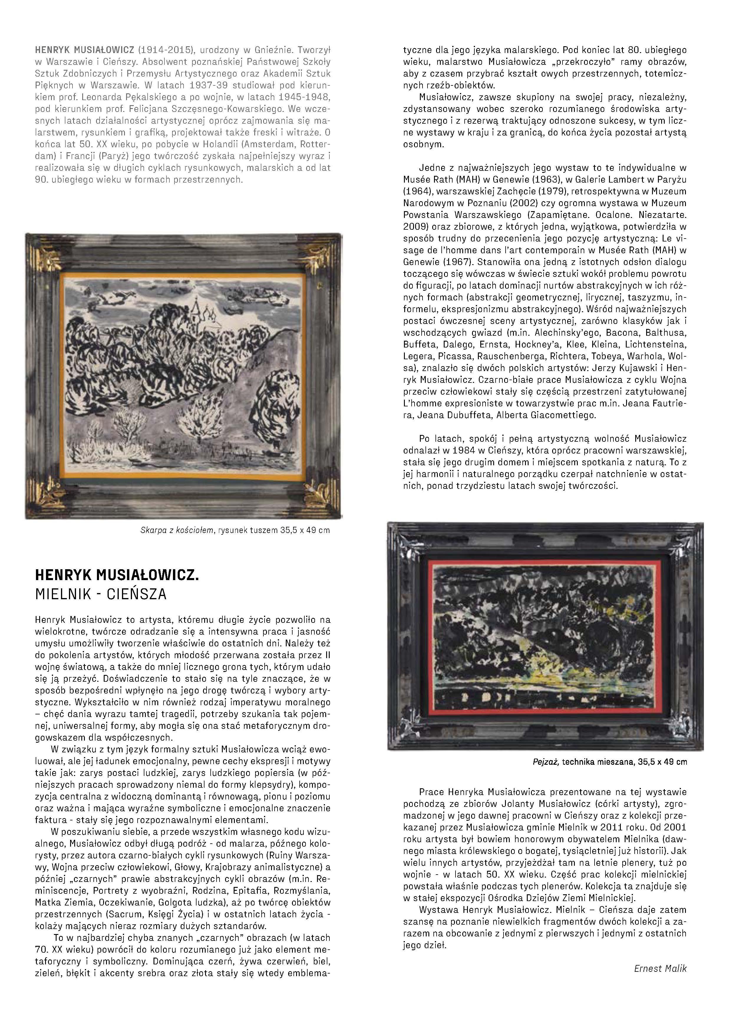 Prace Henryka Musiałowicza (1914-2015) prezentowane na wystawie "Henryk Musiałowicz. Mielnik - Cieńsza" pochodzą ze zbiorów Jolanty Musiałowicz (córki artysty) zgromadzonej w dawnej pracowni artysty w Cieńszy oraz z kolekcji przekazanej przez Musiałowicza gminie Mielnik w 2011 roku. Wówczas to artysta został honorowym obywatelem Mielnika (dawnego miasta królewskiego o bogatej, tysiącletniej już historii). Jak wielu innych artystów, przyjeżdżał tam na letnie plenery, tuż po wojnie - w latach 50. ubiegłego wieku. Część prac kolekcji mielnickiej powstała właśnie podczas tych plenerów. Kolekcja ta znajduje się w stałej ekspozycji Ośrodka Dziejów Ziemi Mielnickiej.