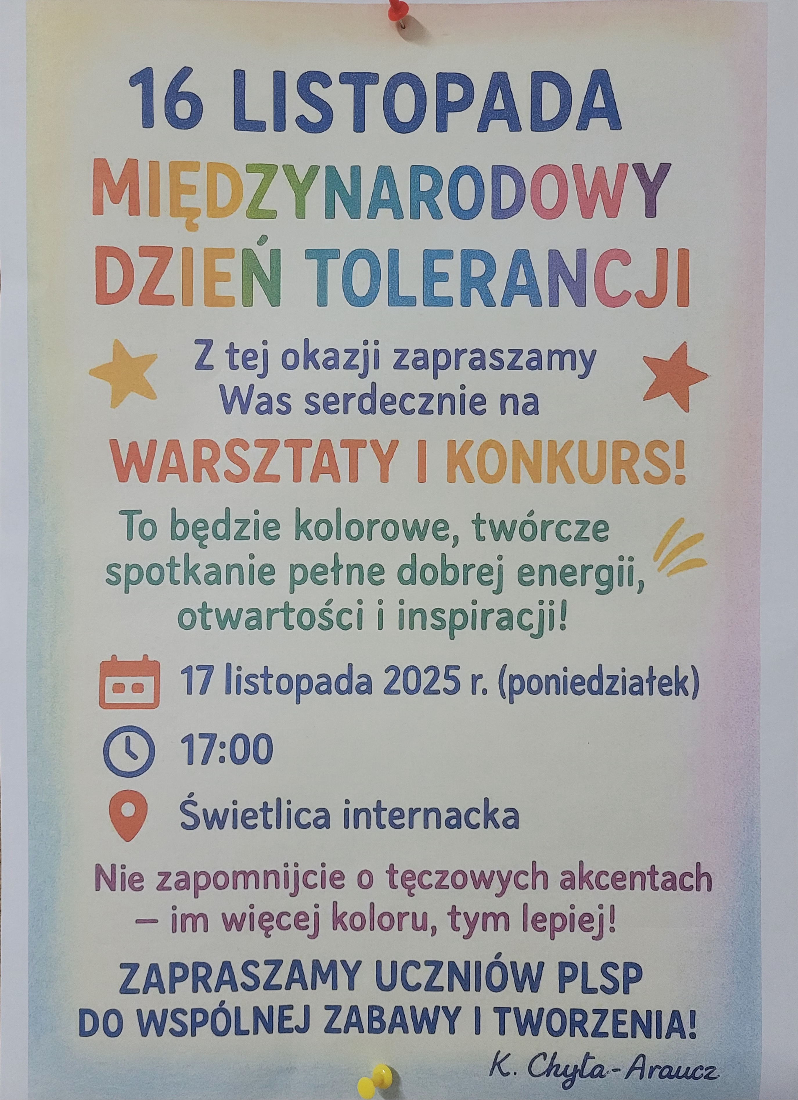 Dnia 17.11.2025 roku z okazji Międzynarodowego Dnia Tolerancji uczniowie PLSP wzięli udział w wyjątkowych warsztatach poświęconych budowaniu postaw szacunku, otwartości i zrozumieniu wobec innych. Spotkanie stało się okazją do rozmów o różnorodności, empatii oraz o tym, jak ważne jest, by każdy czuł się akceptowany i bezpieczny.