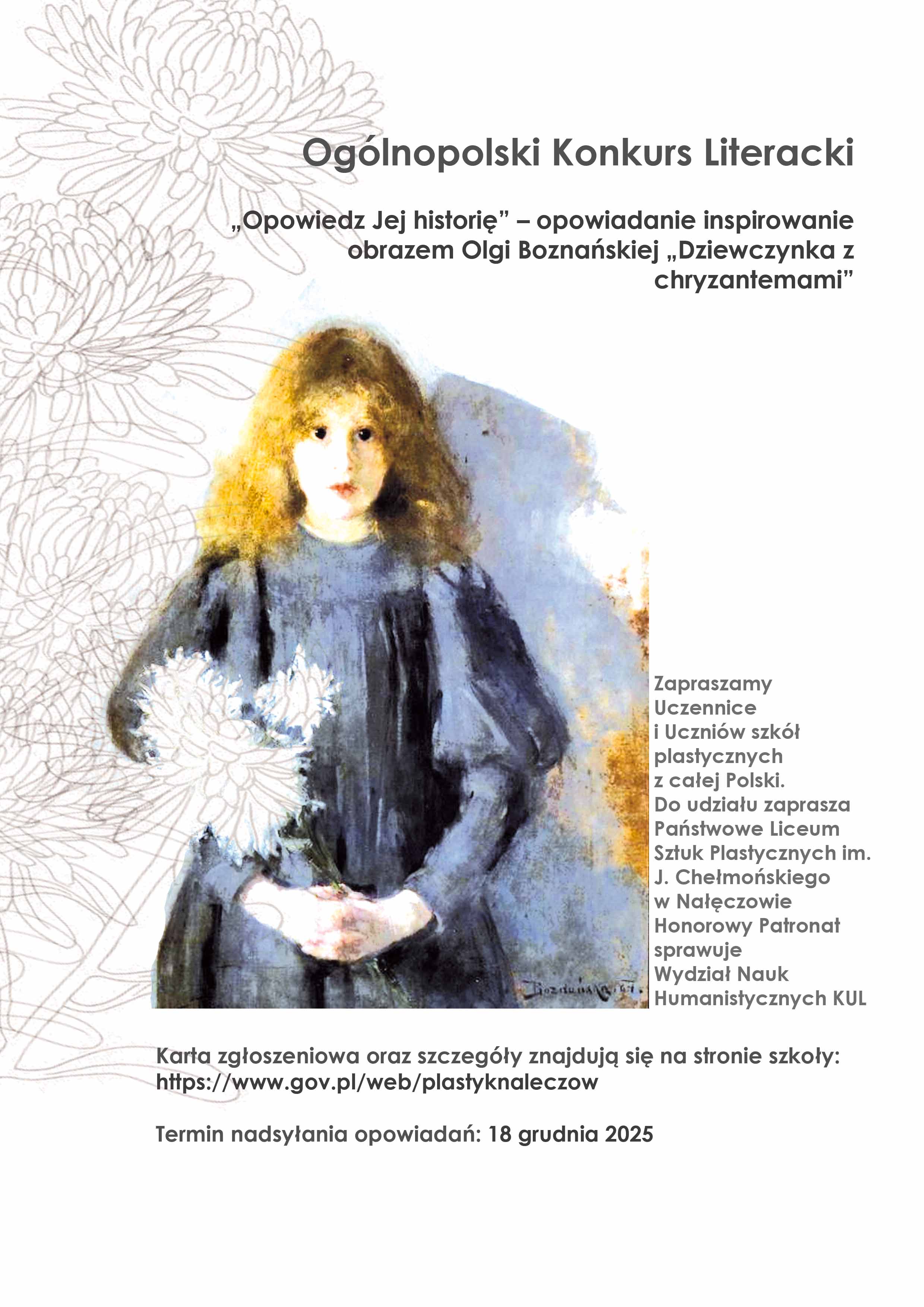 Serdecznie zapraszamy do udziału w Ogólnopolskim Konkursie Literackim "Opowiedz Jej historię". Konkurs inspirowany jest obrazem Olgi Boznańskiej "Dziewczynka z chryzantemami". Termin nadsyłania prac: 18 grudnia 2025.