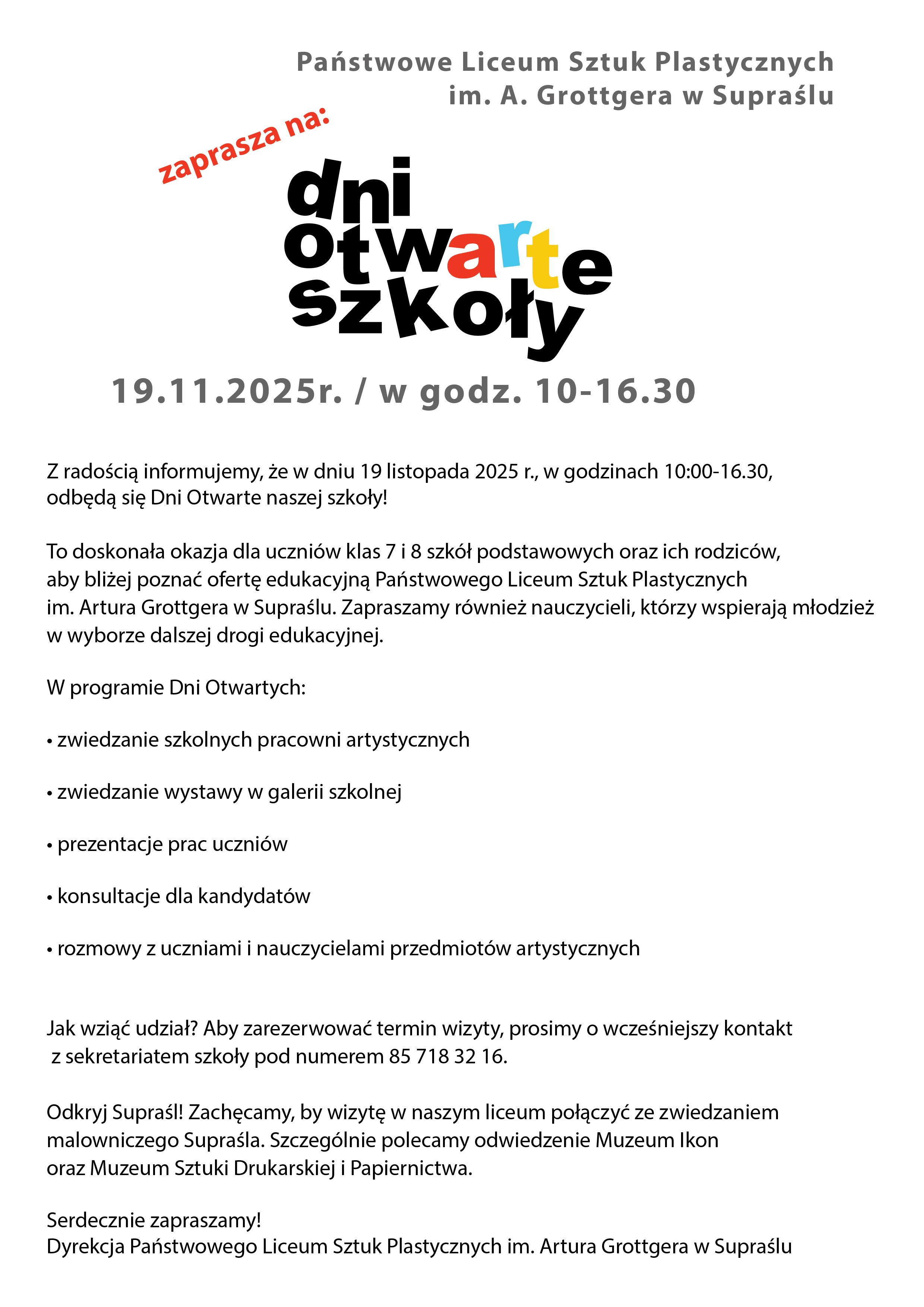 To doskonała okazja dla uczniów klas 7 i 8 szkół podstawowych oraz ich rodziców, aby bliżej poznać ofertę edukacyjną Państwowego Liceum Sztuk Plastycznych im. Artura Grottgera w Supraślu. Zapraszamy również nauczycieli, którzy wspierają młodzież w wyborze dalszej drogi edukacyjnej.
