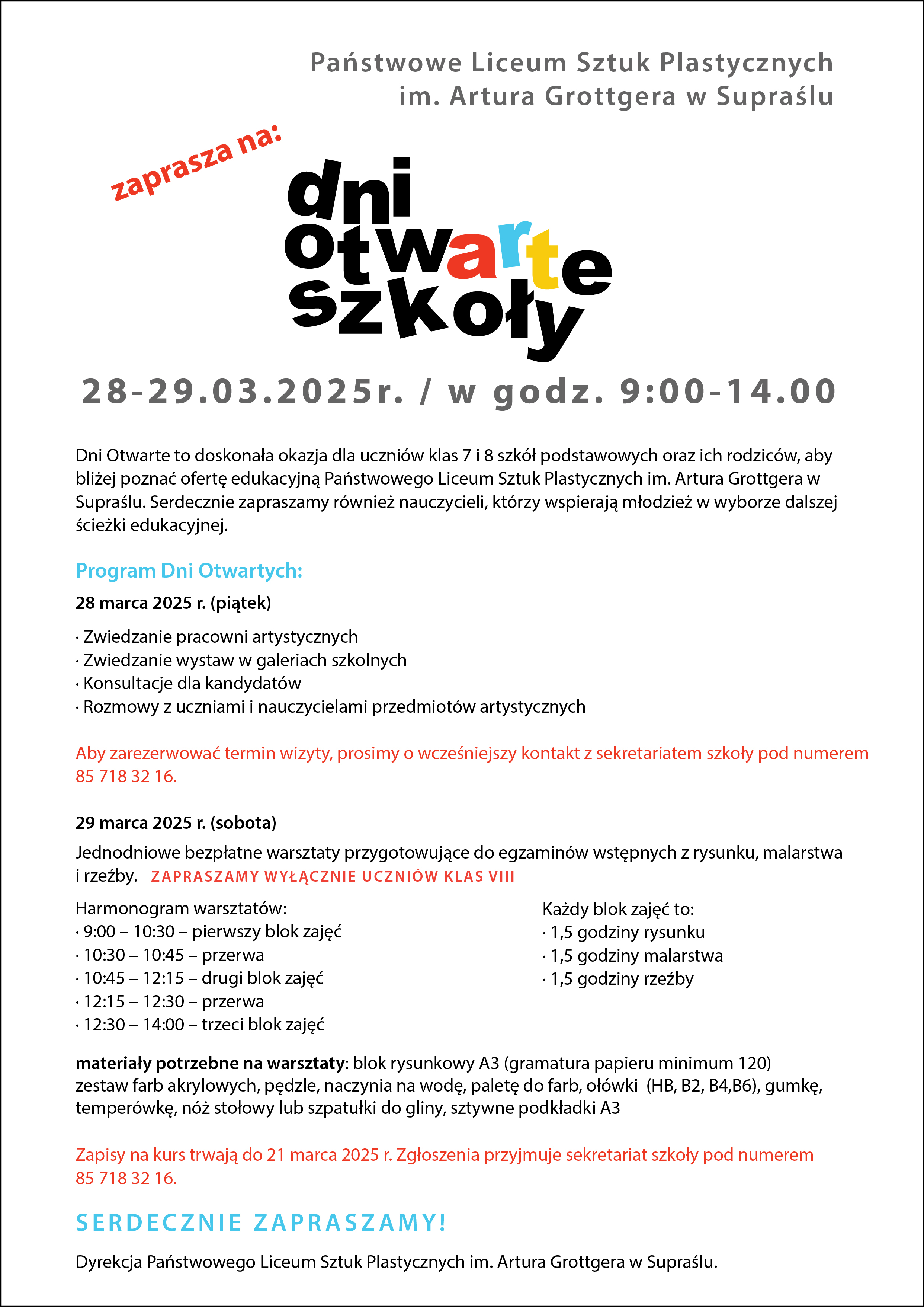 To doskonała okazja dla uczniów klas 7 i 8 szkół podstawowych oraz ich rodziców, aby bliżej poznać ofertę edukacyjną Państwowego Liceum Sztuk Plastycznych im. Artura Grottgera w Supraślu. Serdecznie zapraszamy również nauczycieli, którzy wspierają młodzież w wyborze dalszej ścieżki edukacyjnej.