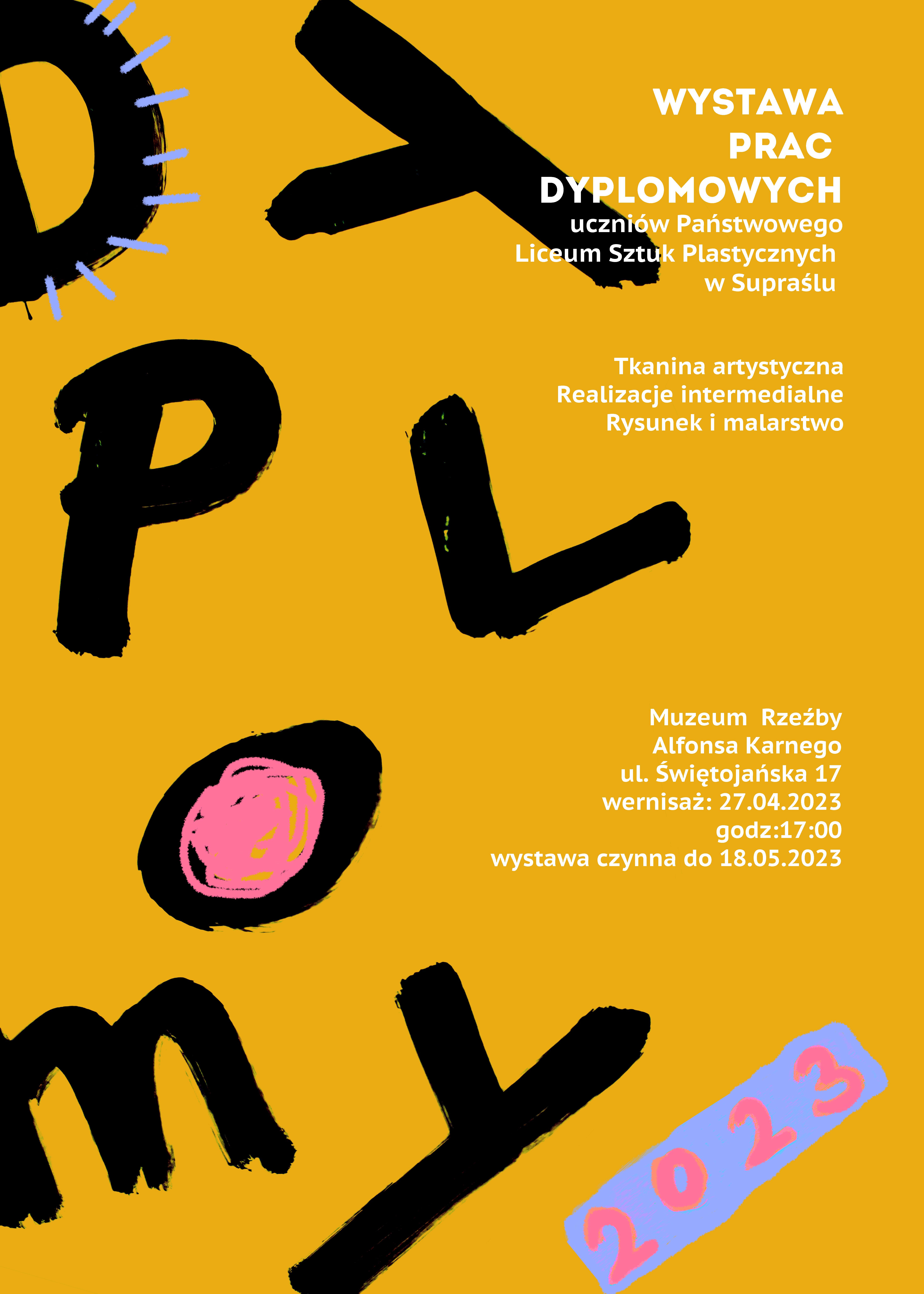 Zapraszamy na otwarcie wystawy prac uczniów Państwowego Liceum Sztuk Plastycznych im. Artura Grottgera w Supraślu „Dyplomy 2023”, 27 kwietnia 2023 r. o godzinie 17:00 w Muzeum Rzeźby Alfonsa Karnego w Białymstoku, ul. Świętojańska 17.