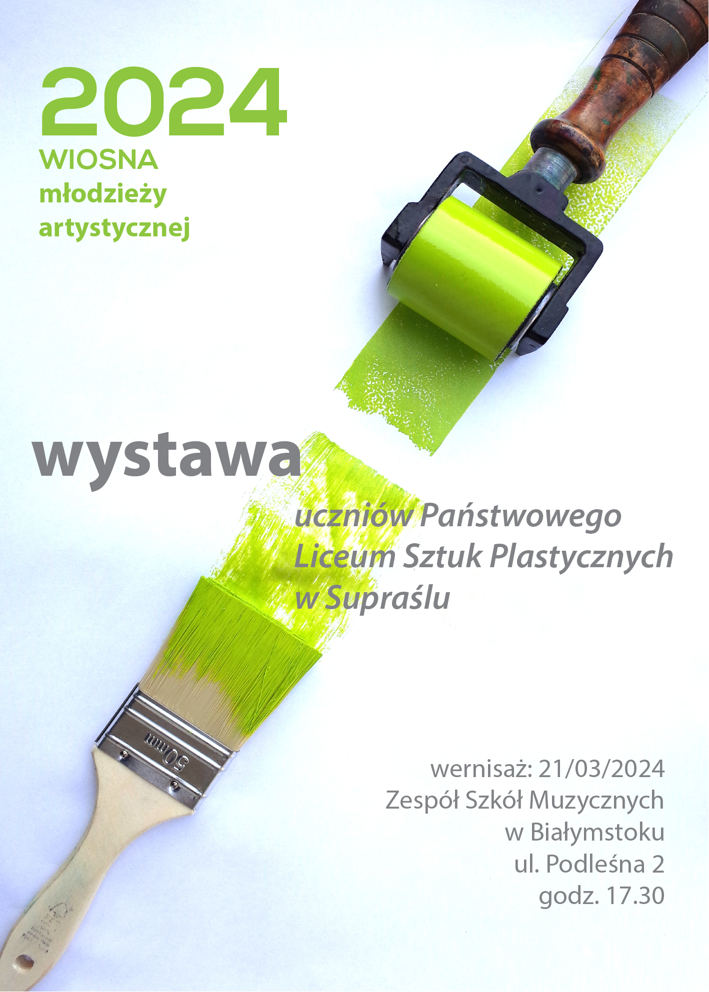 Serdecznie zapraszamy na wystawę uczniów Państwowego Liceum Sztuk Plastycznych w Supraślu. Wernisaż odbędzie się dnia: 21.03.2024 w Zespole Szkół Muzycznych w Białymstoku przy ul. Podleśnej 2, o godz. 17:30.