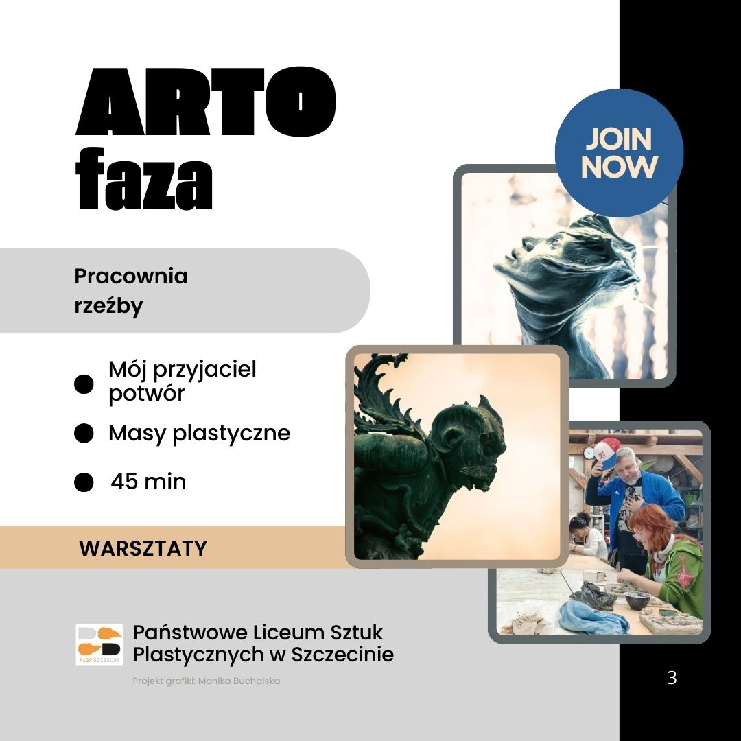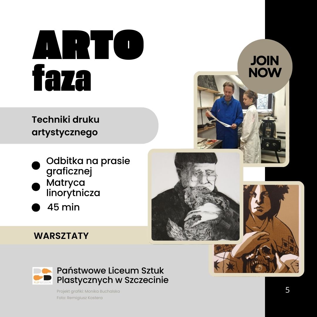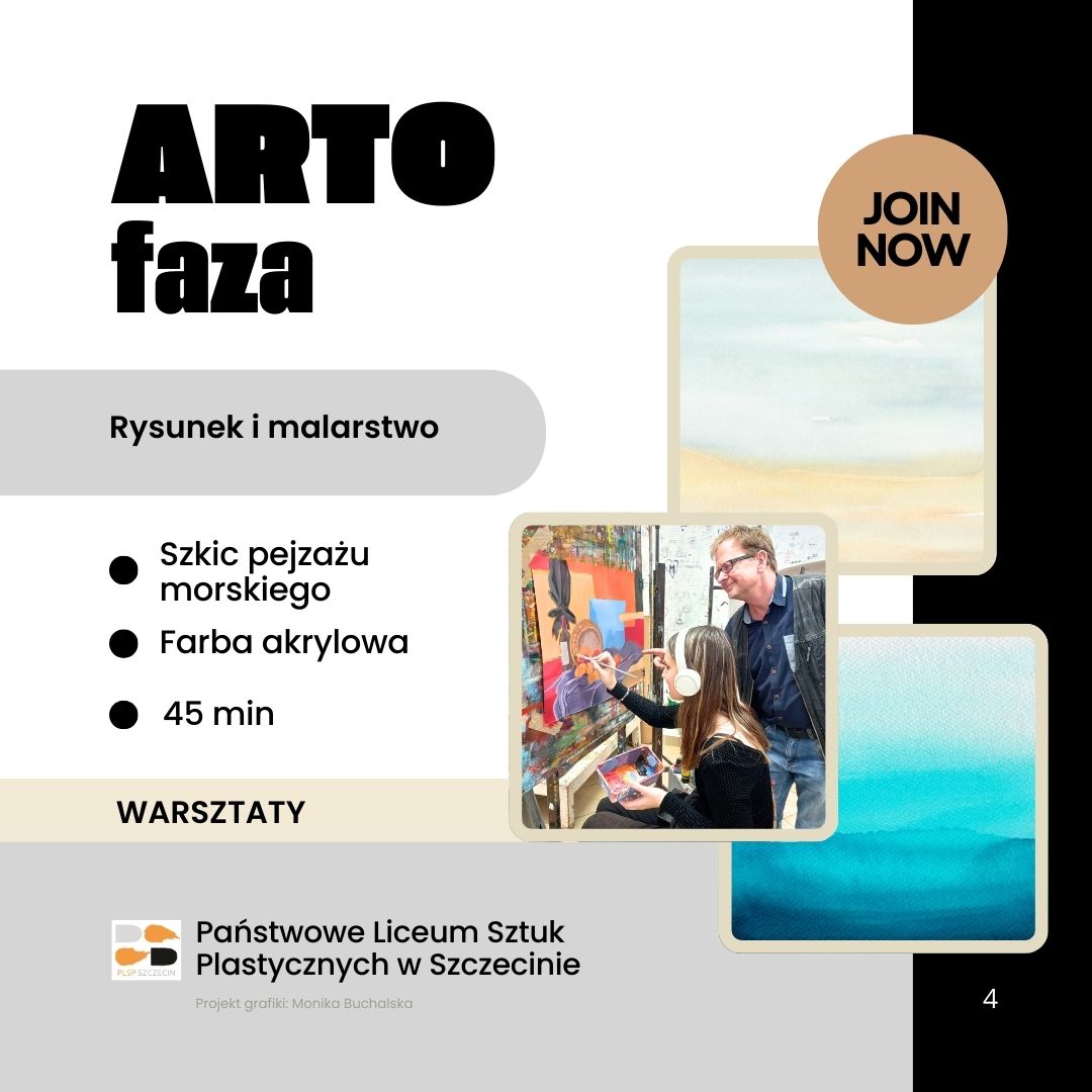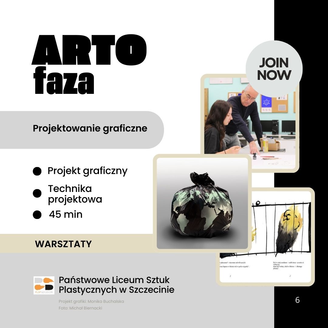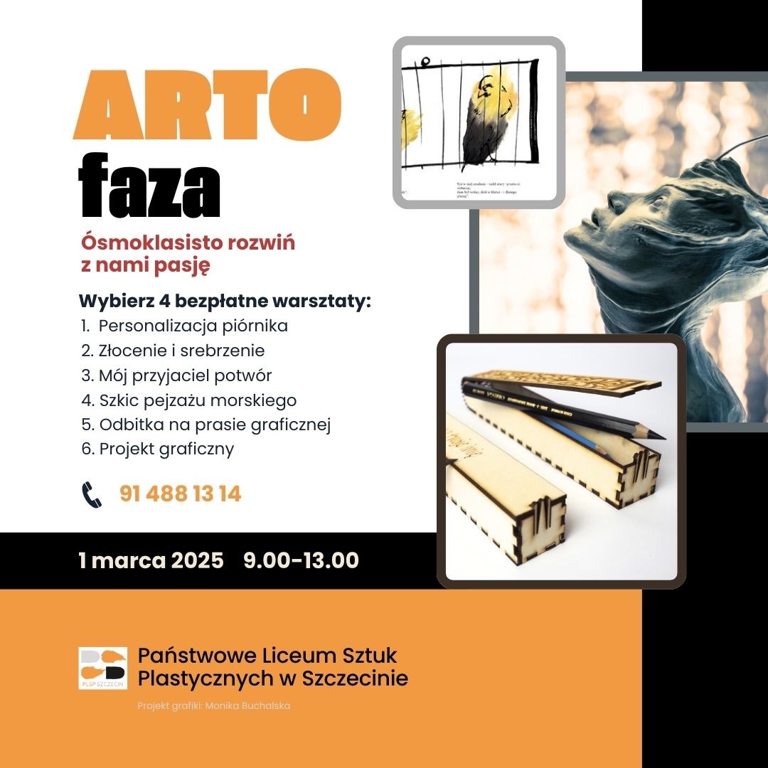 Przyjdź na bezpłatne warsztaty plastyczne ARTOfaza organizowane w Państwowym Liceum Sztuk plastycznych w Szczecinie. Warsztaty poprowadzą nauczyciele plastycy uczący w naszej szkole.