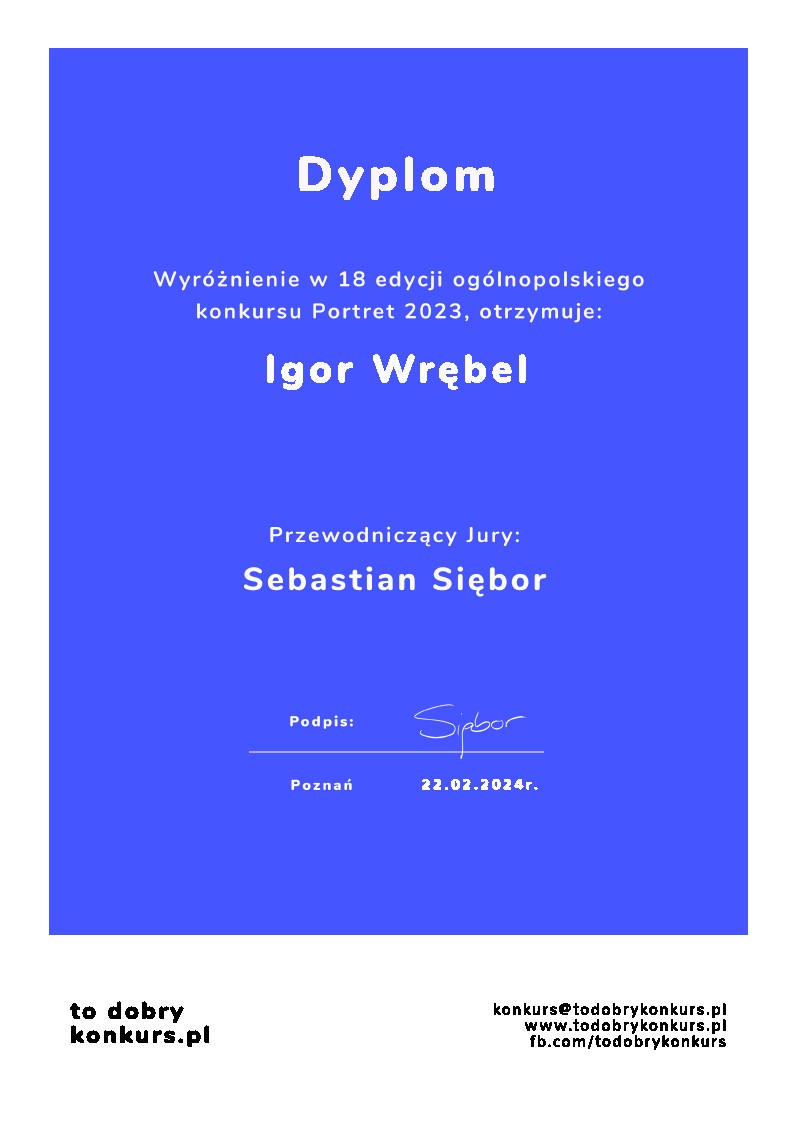 Igor Wrębel z klasy IV b został wyróżniony w 18 Edycji Ogólnopolskiego Konkursu Fotograficznego Portret 2023 - To dobry konkurs. W rywalizacji wzięło udział 11 tysięcy prac fotograficznych. Brawo Igor, gratulacje!