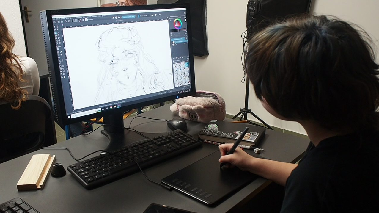 Sercem pracowni są komputery, wyposażone w niezbędne oprogramowanie do projektowania. Między innymi Fusion360 do tworzenia modeli 3D, oraz DoubleCAD do tworzenia rysunków 2D. Każde stanowisko posiada tablet graficzny, który jest bardzo pomocny w tworzeniu szkiców oraz rysunków. Każdy produkt, który powstaje w naszej pracowni zawdzięcza swoje istnienie właśnie dzięki takim szkicom koncepcyjnym wykonanym tradycyjnie na papierze lub metodą cyfrową.