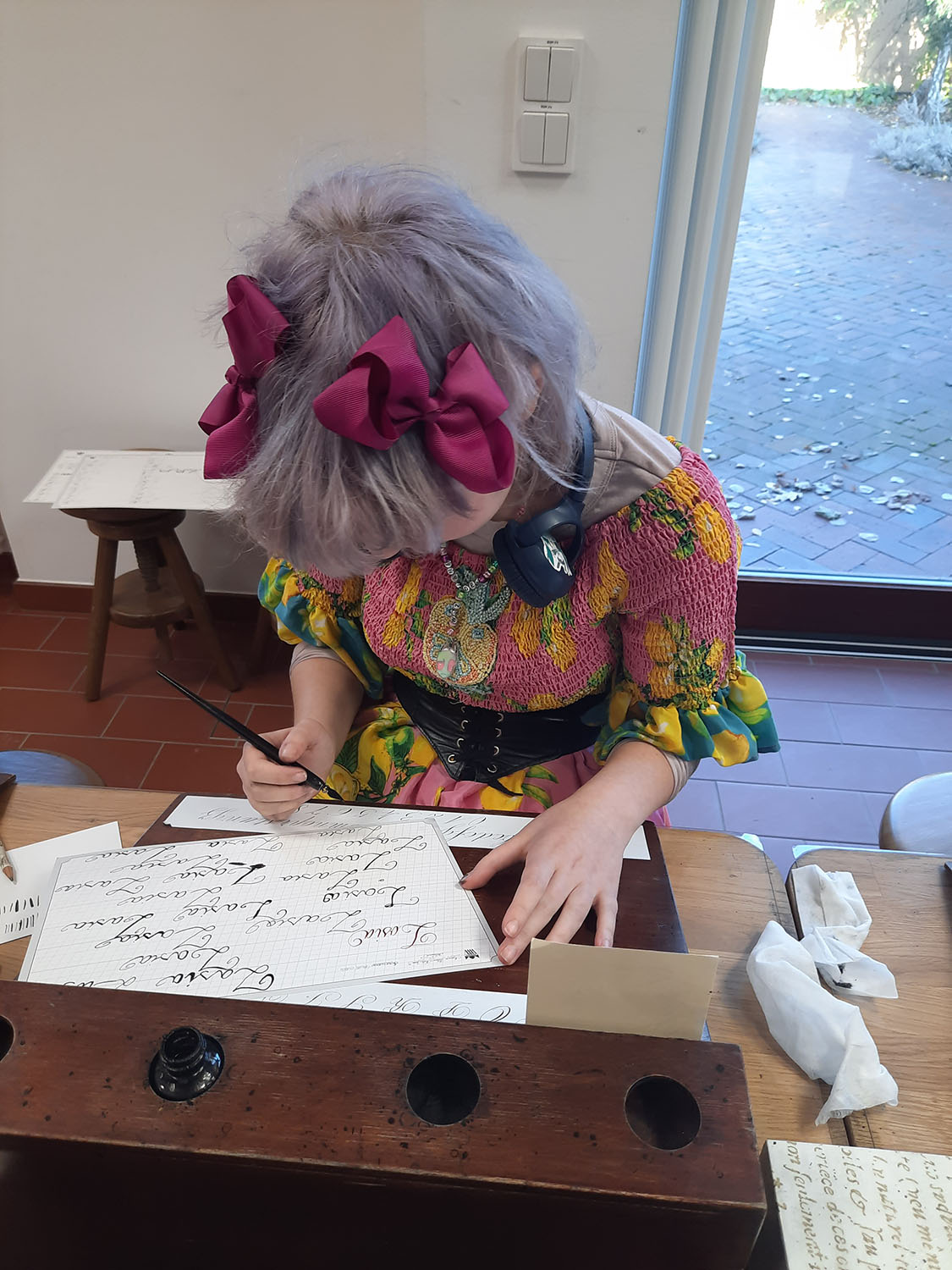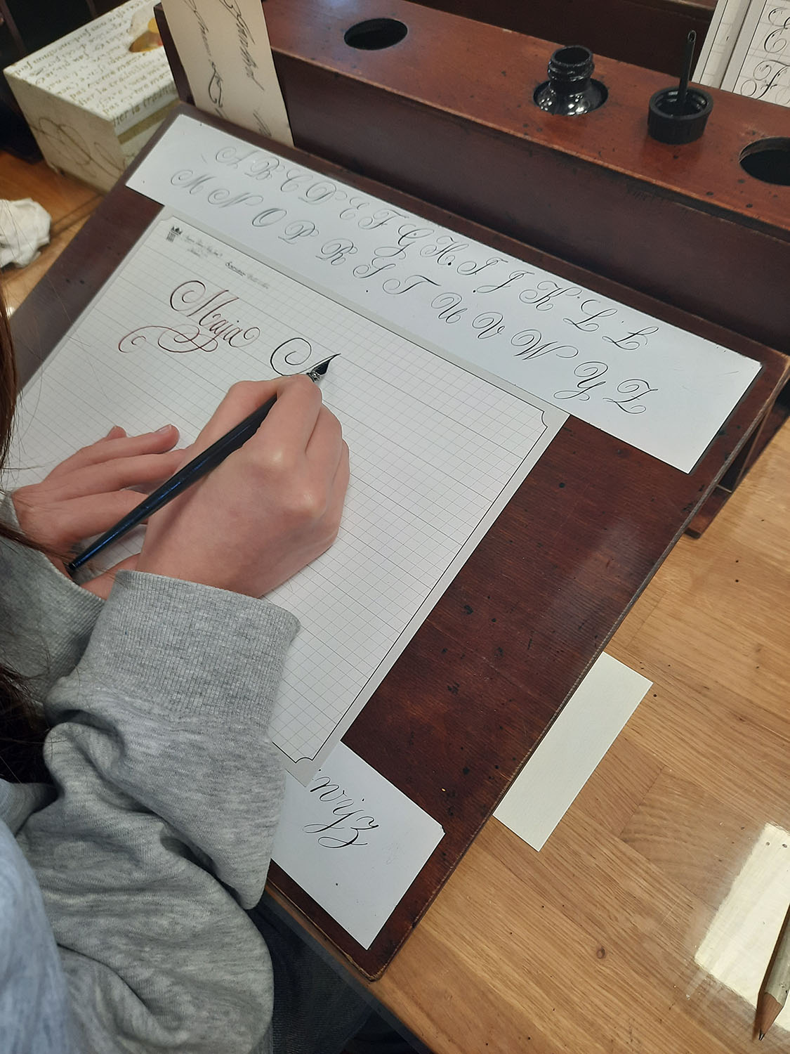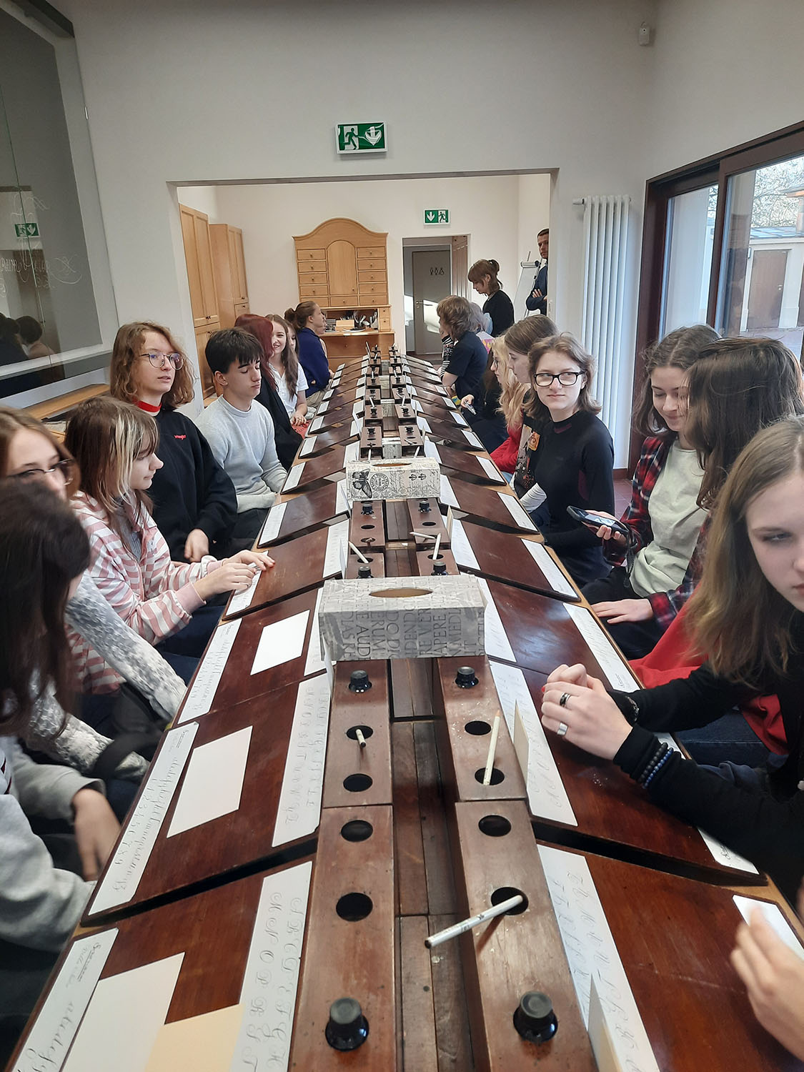 26 listopada klasa 1b z p. Patrycją Cichą i p. Krzysztofem Ząbkiem uczestniczyła w warsztatach pt. “Kaligrafia - zapomniana sztuka”. Zajęcia odbyły się w skryptorium przy Muzeum Pałacu Jana III Sobieskiego w Wilanowie. Podczas lekcji uczniowie zastanawiali się, dlaczego kaligrafia jest dziedziną sztuki. Prowadząca w bardzo ciekawy sposób przybliżyła sylwetkę i twórczość Franciszka Starowieyskiego – mistrza kaligrafii i twórcy polskiej szkoły plakatu oraz teatru rysowania. Młodzież mogła podziwiać szkolne zeszyty Jana Sobieskiego, a także spróbować swoich sił w artystycznym kreśleniu liter. Wszyscy wspólnie uznali, że kaligrafia jest sztuką piękną, ale niezwykle trudną.