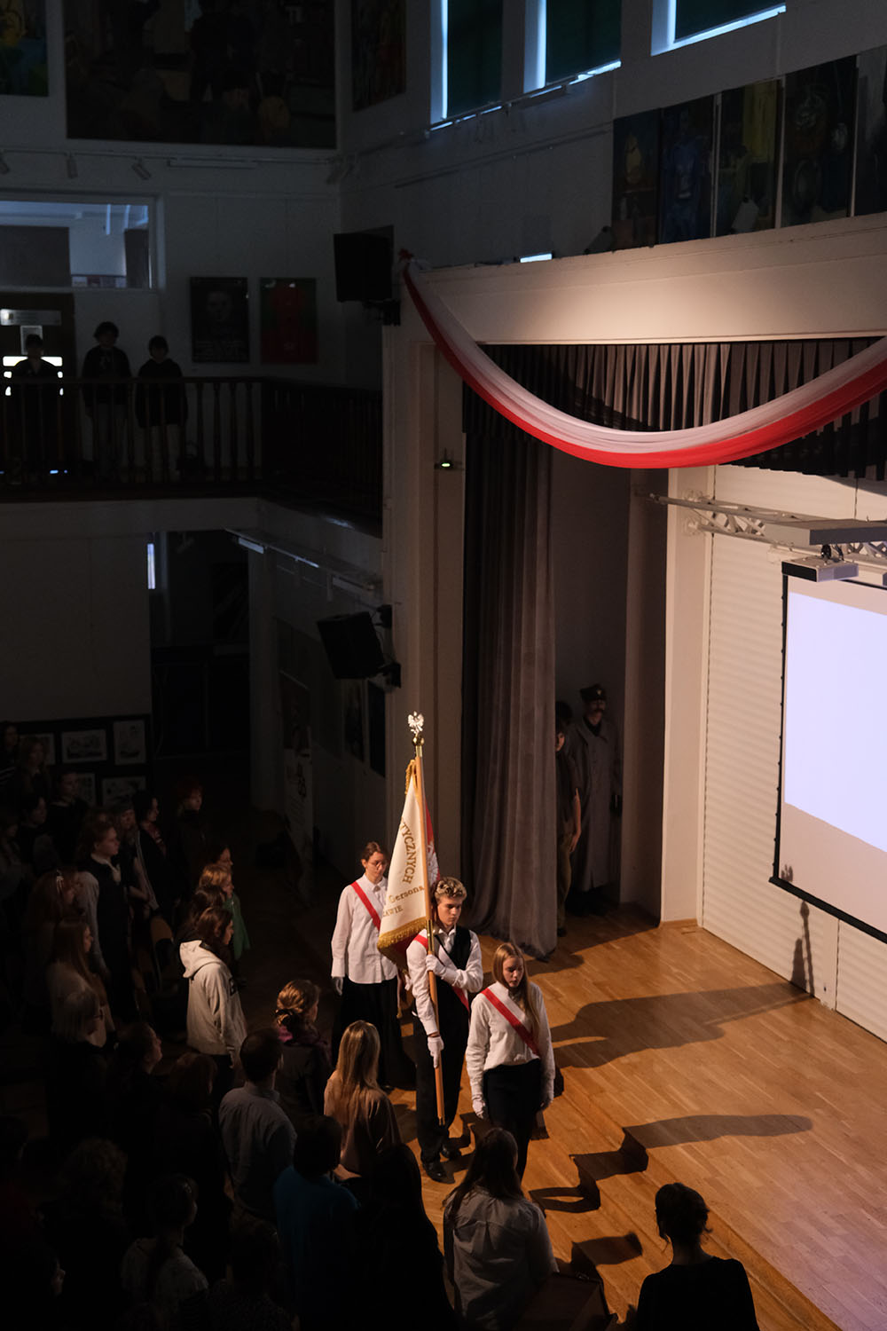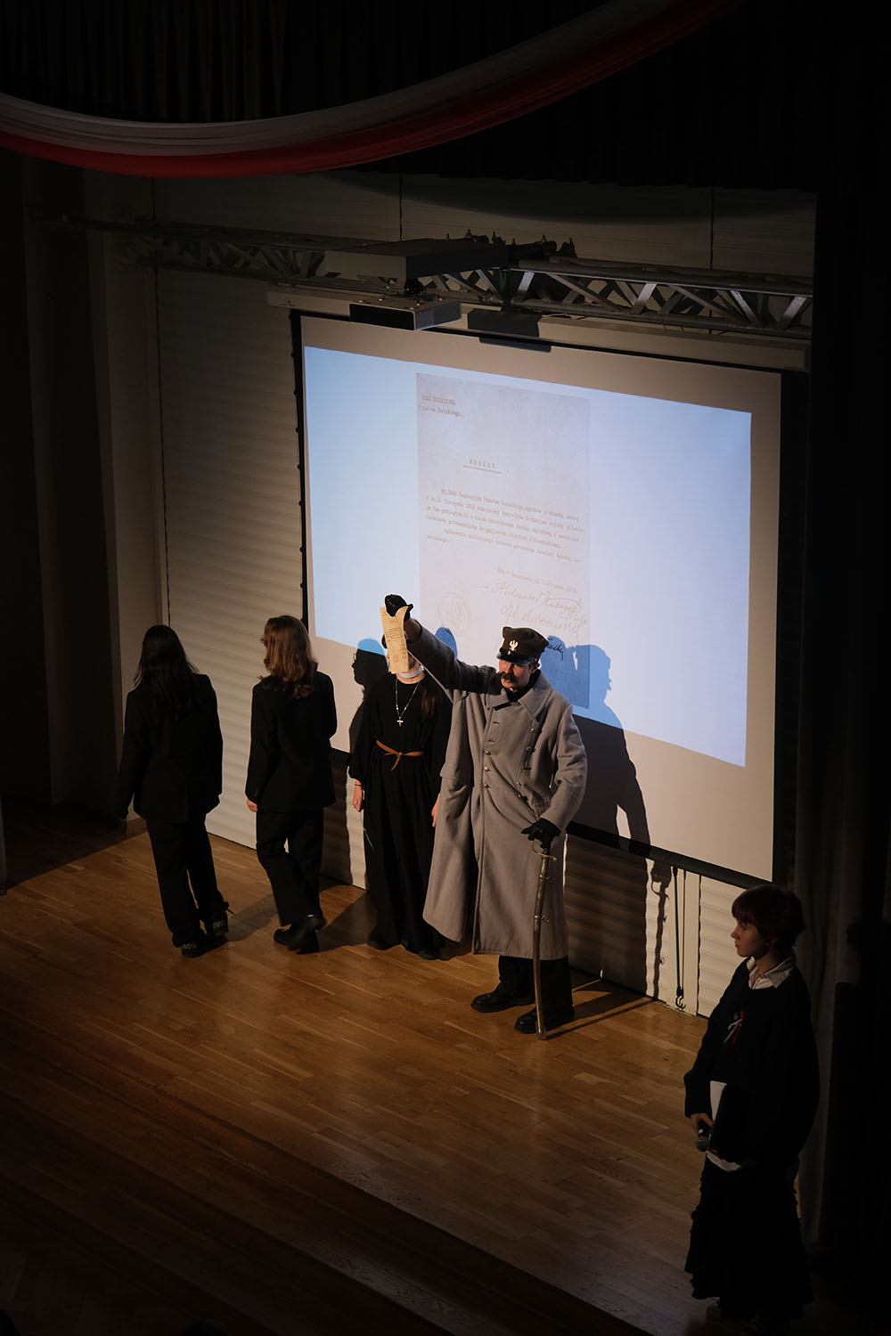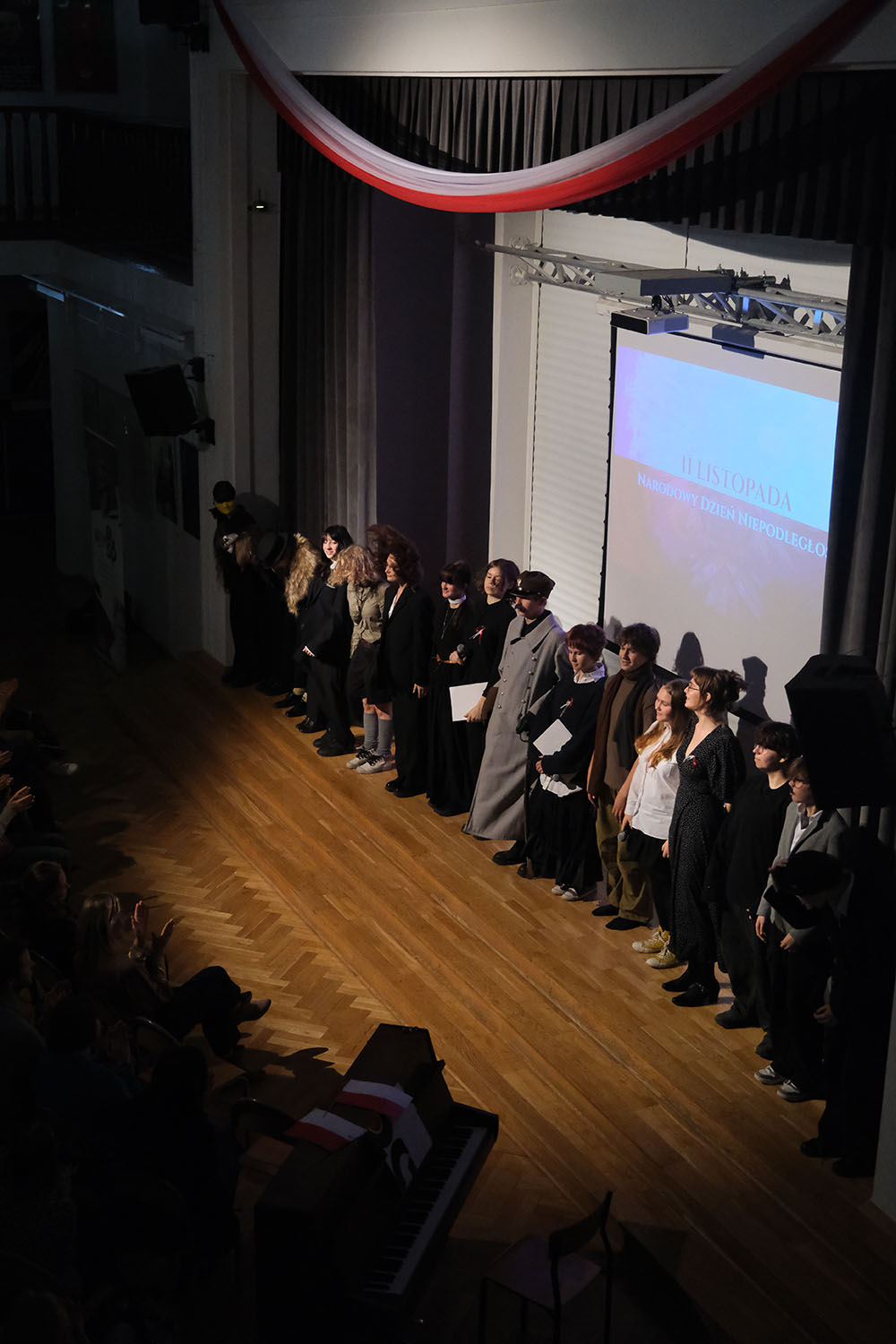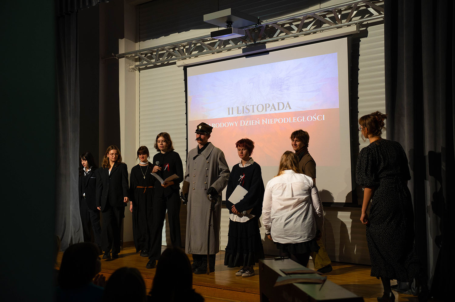 7 listopada w naszej szkole odbyły się uroczyste obchody Święta Niepodległości. Cała społeczność szkolna zebrała się w auli, aby wspólnie zaśpiewać Mazurek Dąbrowskiego i obejrzeć przygotowane przez klasę 2A przedstawienie. Spektakl przedstawiał drogę do odzyskania niepodległości przez Polskę, co było dobrą lekcją historii i patriotyzmu. Uczniowie z zaangażowaniem wcielili się w role postaci historycznych. Na uwagę zasługuje śpiew Wiktorii Czajkowskiej, która wykonała takie utwory jak Ojczyzno ma i Miejcie nadzieję. Na pianinie akompaniowała jej Hanna Strzeżysz.