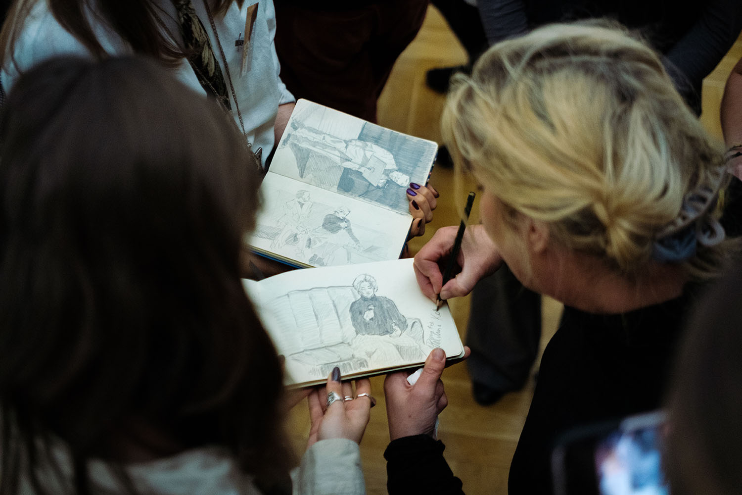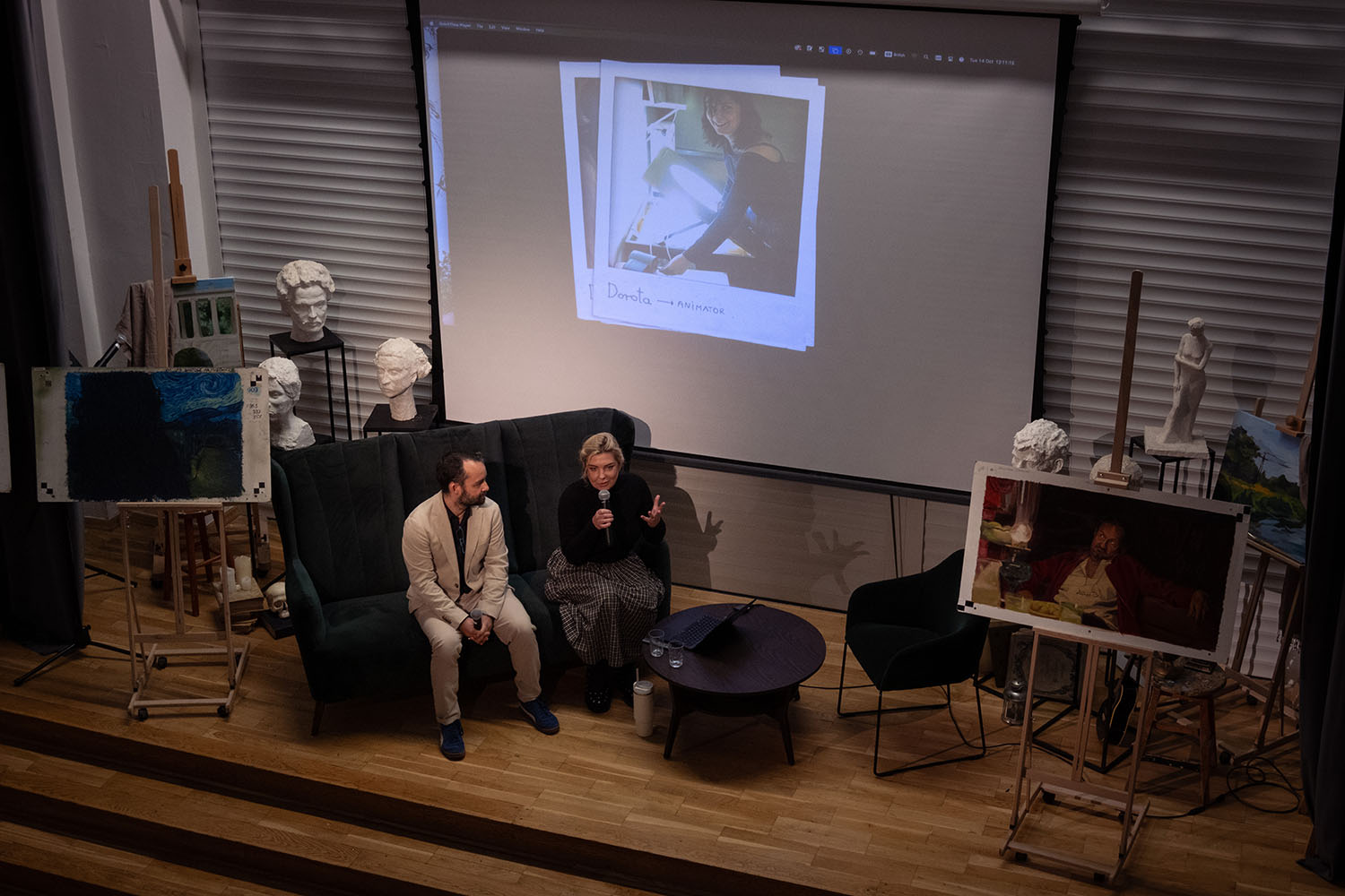 Podczas spotkania artystka z ogromną serdecznością wspominała lata nauki w PLSP, dzieląc się anegdotami z czasów szkolnych oraz refleksjami na temat roli edukacji artystycznej w jej dalszej drodze twórczej. Opowiedziała również o kulisach powstawania swoich filmów – o procesie pracy nad animacją malarską, współpracy z zespołem artystów oraz wyzwaniach, jakie towarzyszyły realizacji obu produkcji.