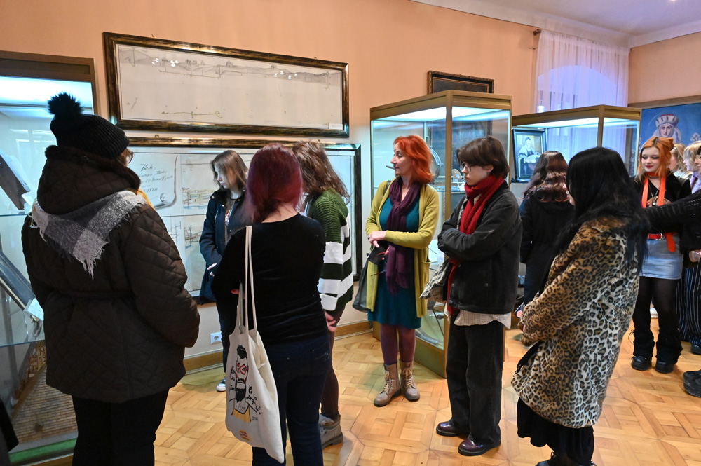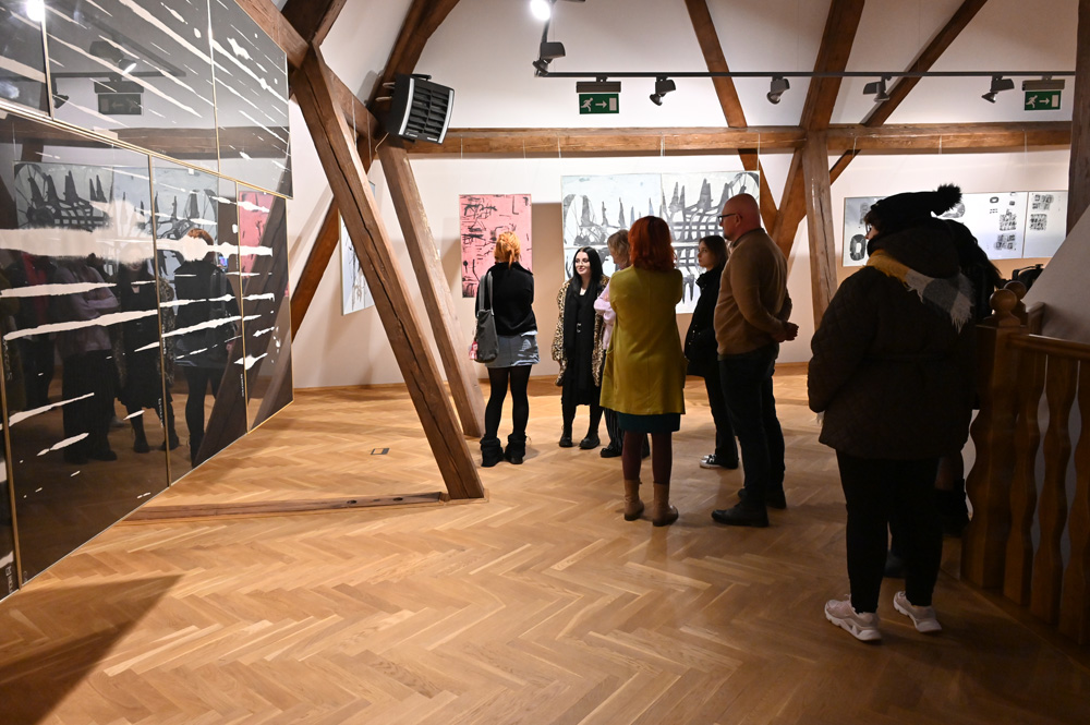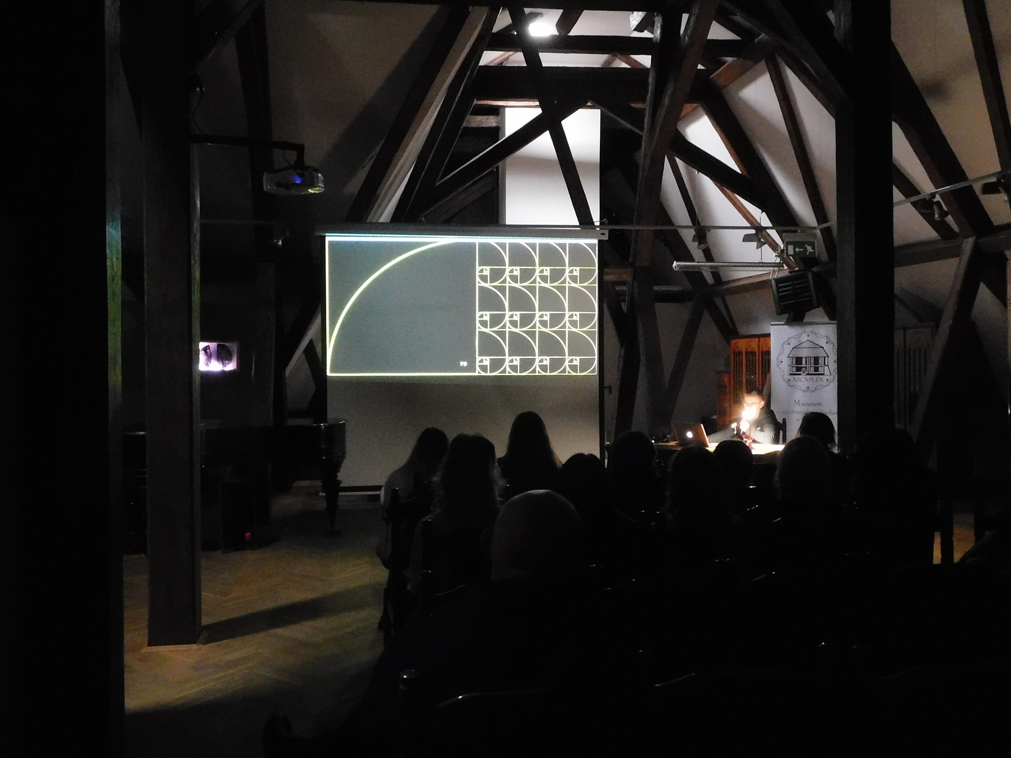 W przestrzeni strychu muzealnego artysta grafik Piotr Duda poprowadził wykład na temat kompozycji, jeden z tematów proponowanych w ramach muzealnych lekcji artystycznych.