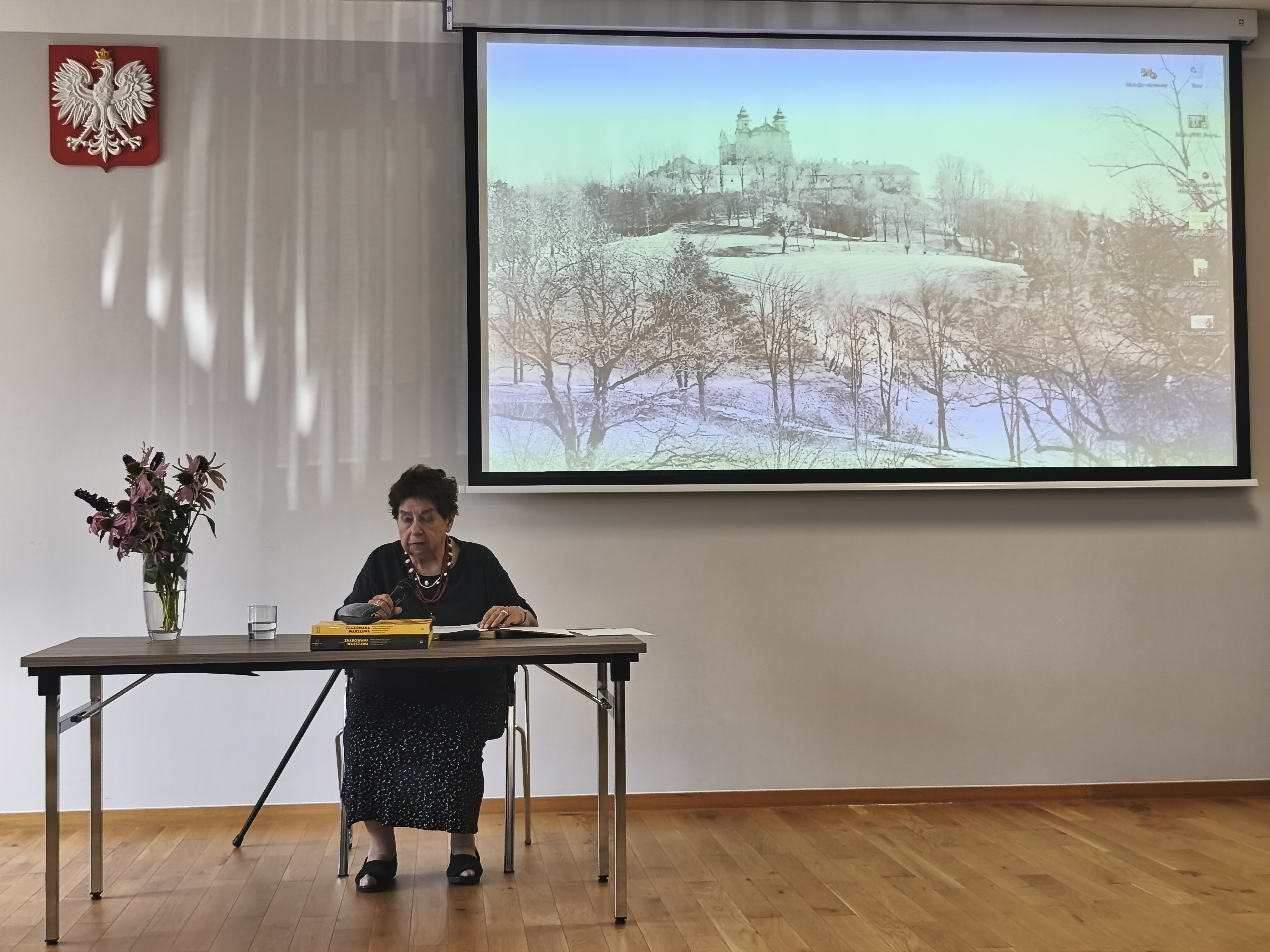 Pani Maria Serafińska-Domańska, kierownik Koryznówki w latach 1981-2023 podsumowała sesję opowiadając o upamiętnieniu miejsc pobytu obrazów w formie tablic pamiątkowych na murach.