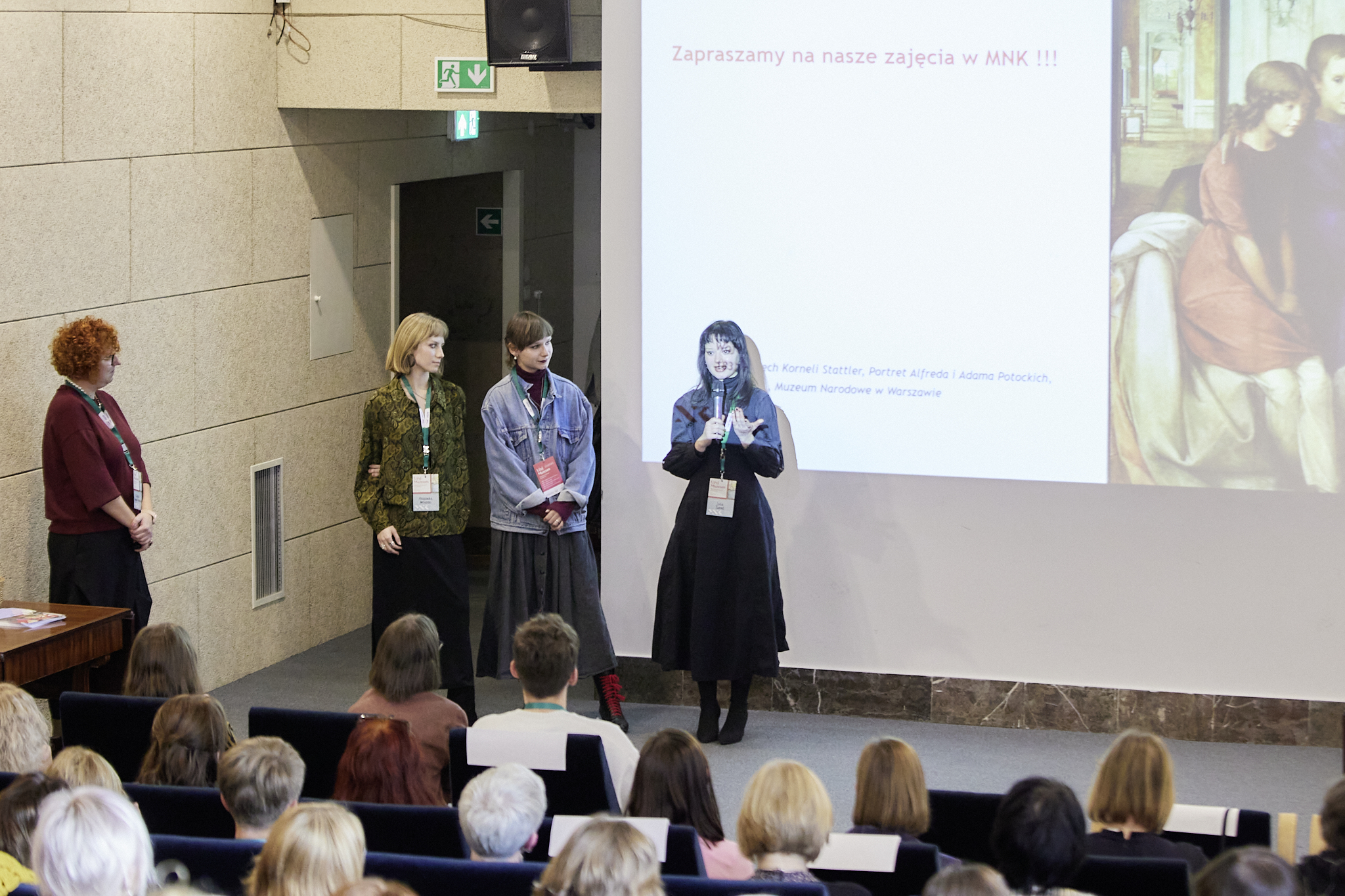 Autorki scenariusza lekcji muzealnej INTERWENCJA – Matylda Krzywda, Aleksandra Małyszek i Julia Sarad wraz z nauczycielką Eweliną Bochnak-Wojtanowicz, 21. października, podczas konferencji dla nauczycieli „Użyj muzeum. Wspólna przestrzeń dla edukacji” w Muzeum Narodowym w Krakowie, opowiadały o swoich doświadczeniach, związanych z udziałem w tym niezwykle wartościowym i ciekawym projekcie edukacyjnym.