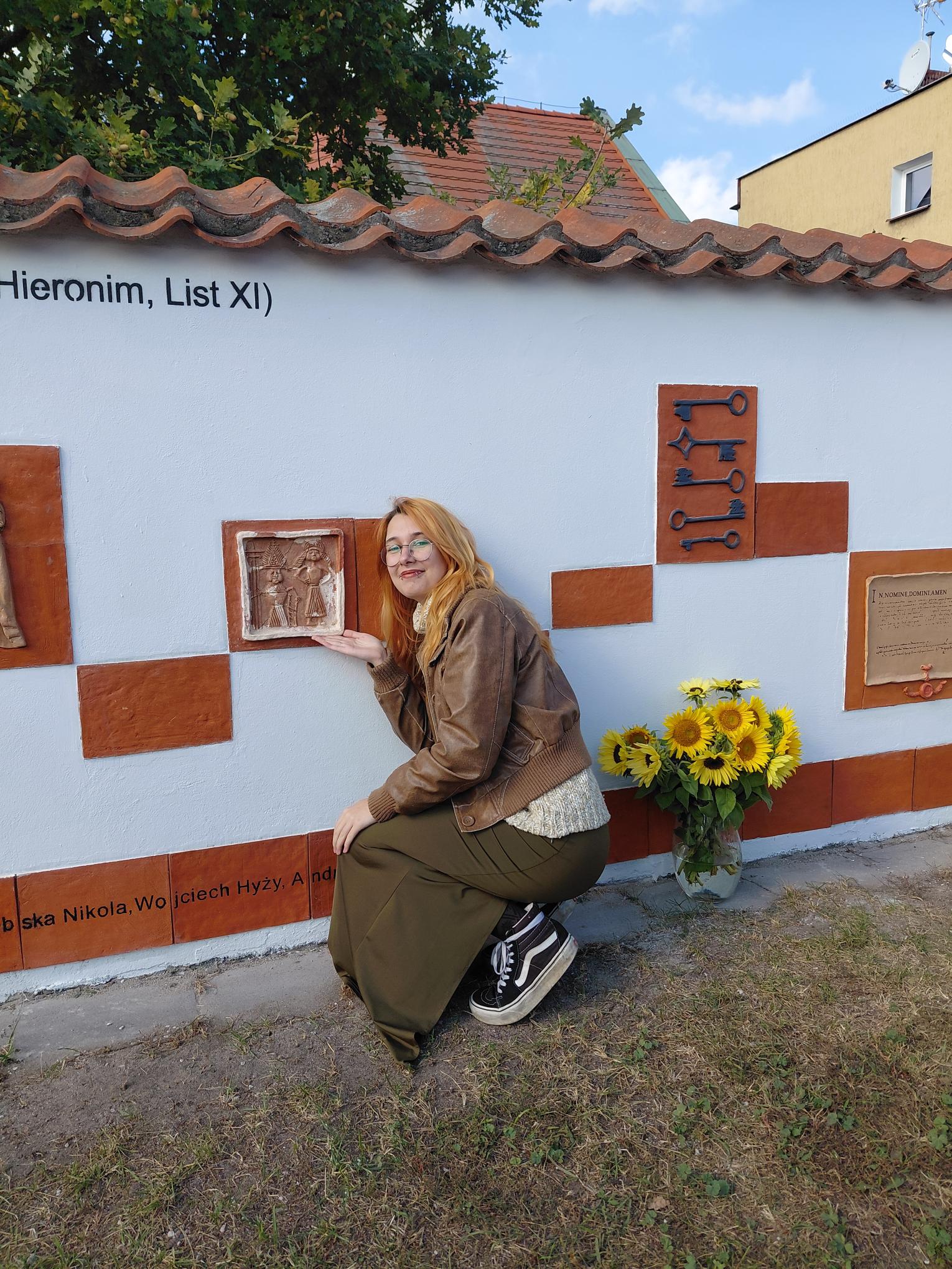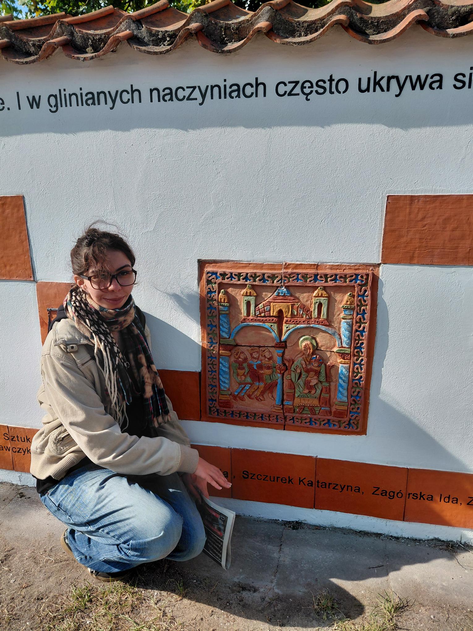 Kompozycję, którą tworzą ceramiczne płyty z postacią św. Hieronima, sceną Hołdu Trzech Króli z Kodeksu Pułtuskiego, motywami znalezisk archeologicznych (naczynia, klucze, moneta, rękojeść nożyka, waga) i archiwaliami (pieczęć miejska, akt nadania praw miejskich) wykonała grupa uczennic z klasy czwartej, ze specjalności ceramika artystyczna. Prace nad projektem trwały od klasy trzeciej.