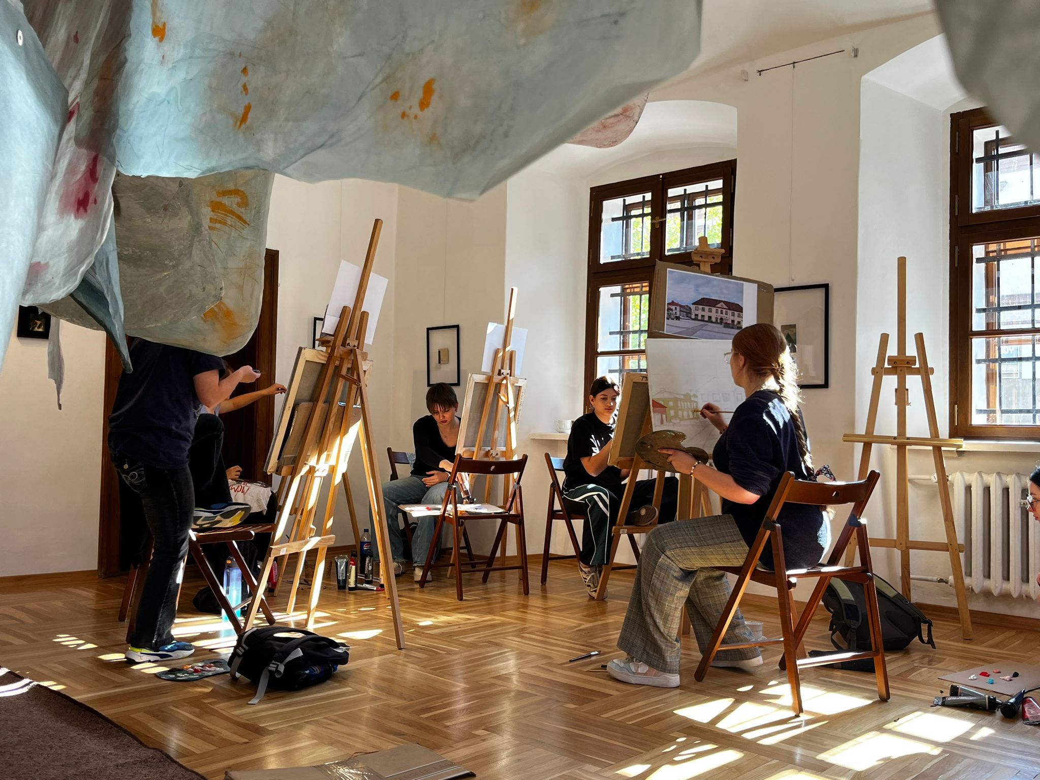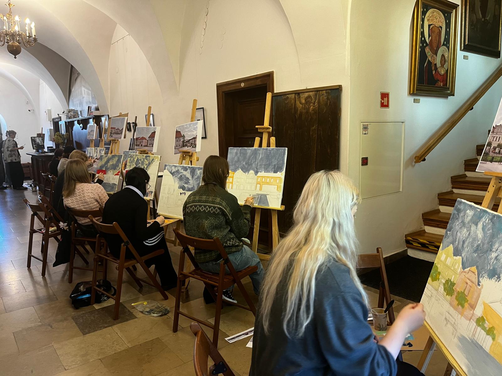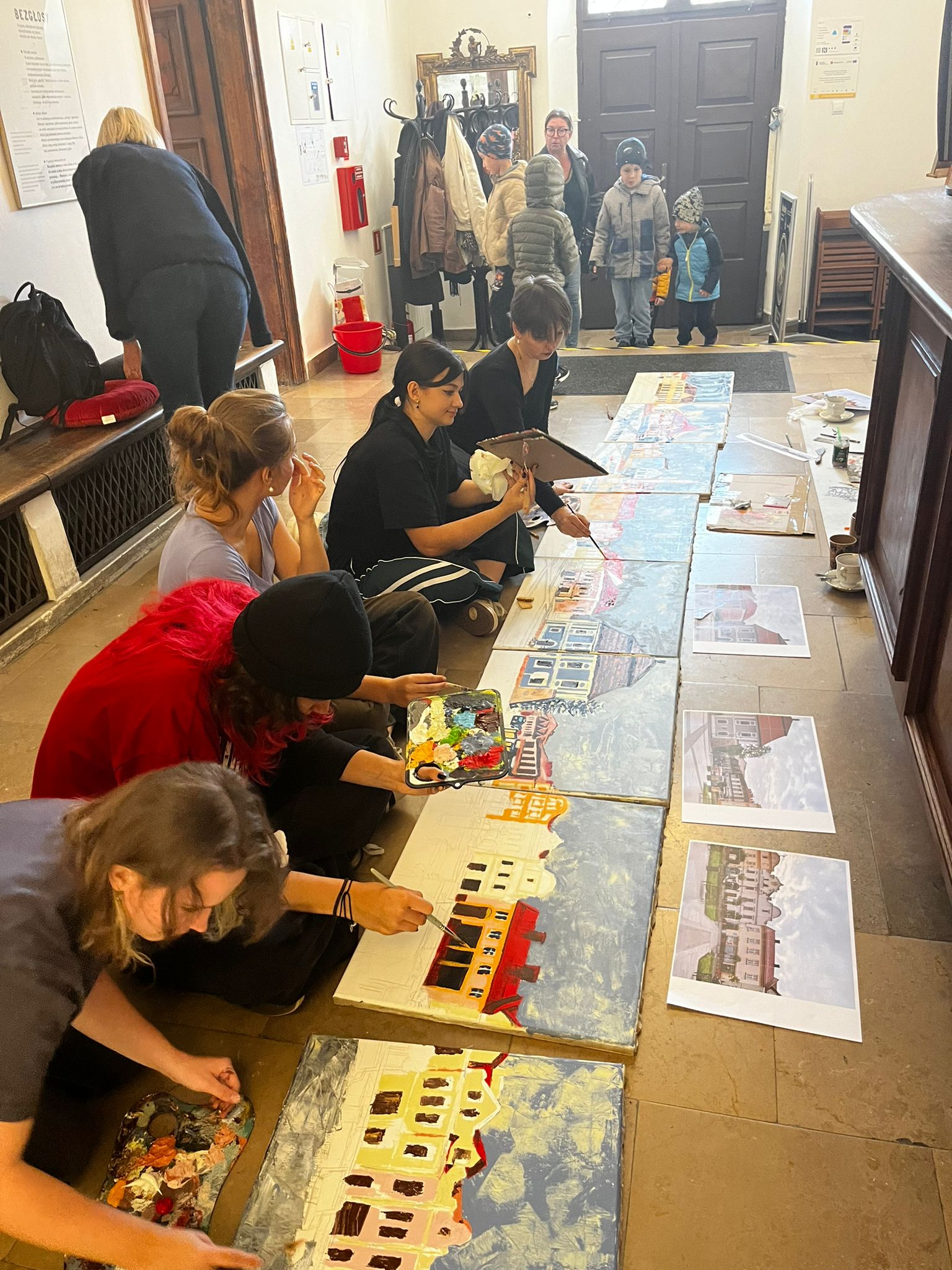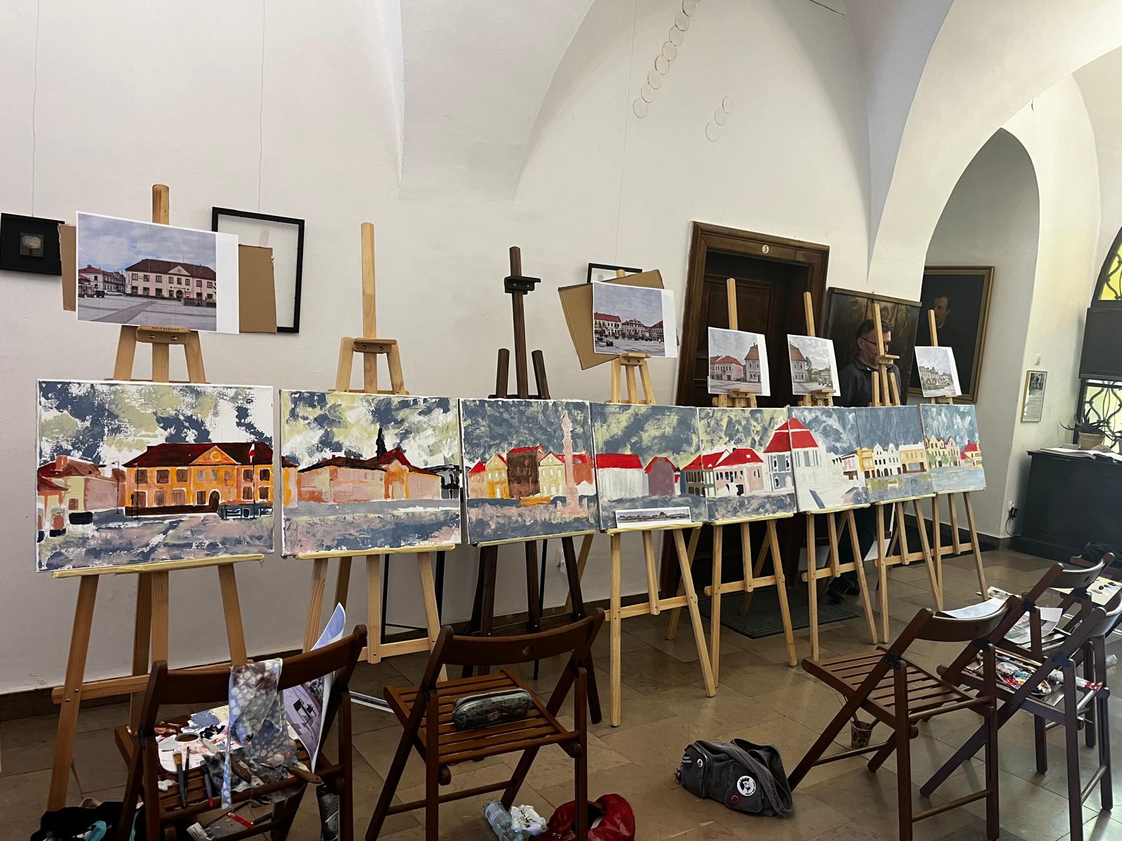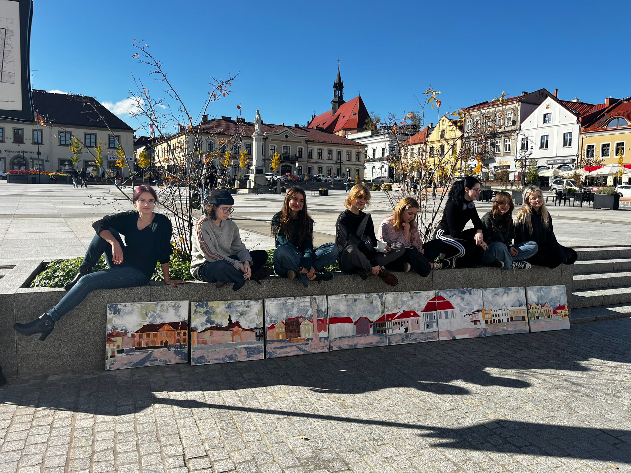 Panorama wokół bocheńskiego Rynku w malarskiej odsłonie prawie na ukończeniu. To efekt pracy sympatycznej grupy uzdolnionych uczniów wiśnickiego plastyka, podczas drugiego dnia pleneru w naszym muzeum.