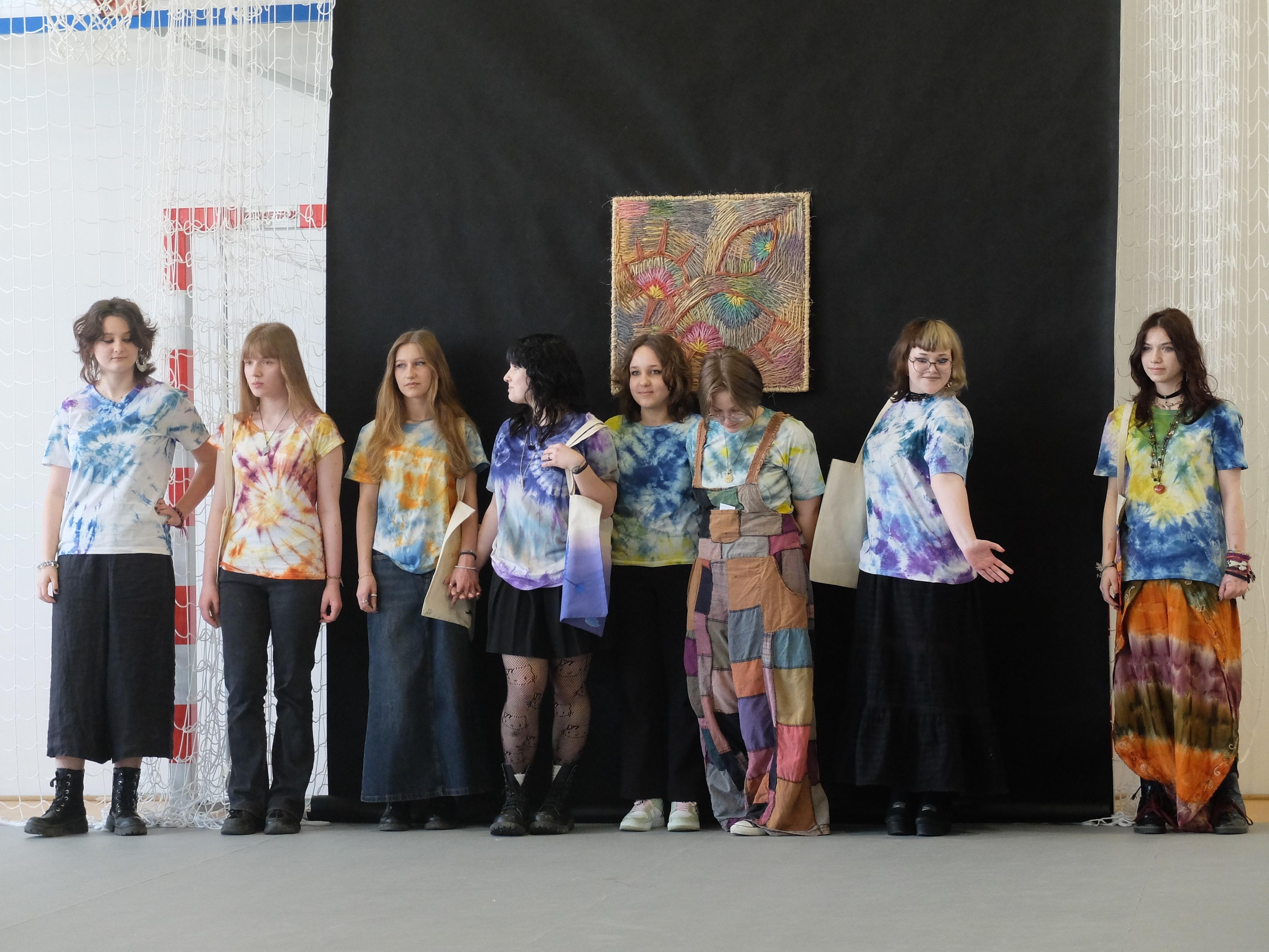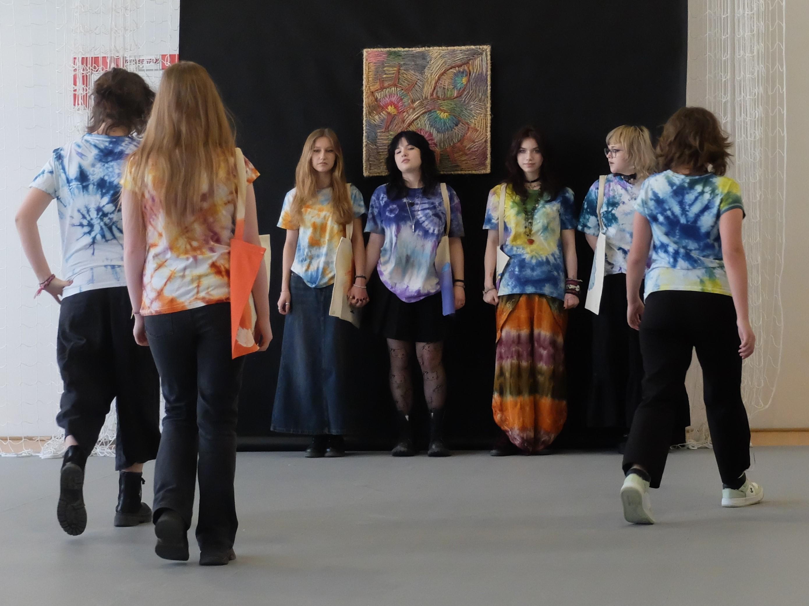 13. Pokaz zakończony był prezentacją koszulek uczniów klasy I, które wykonali w technice barwienia bandanu, czyli farbowania techniką rezerwującą.