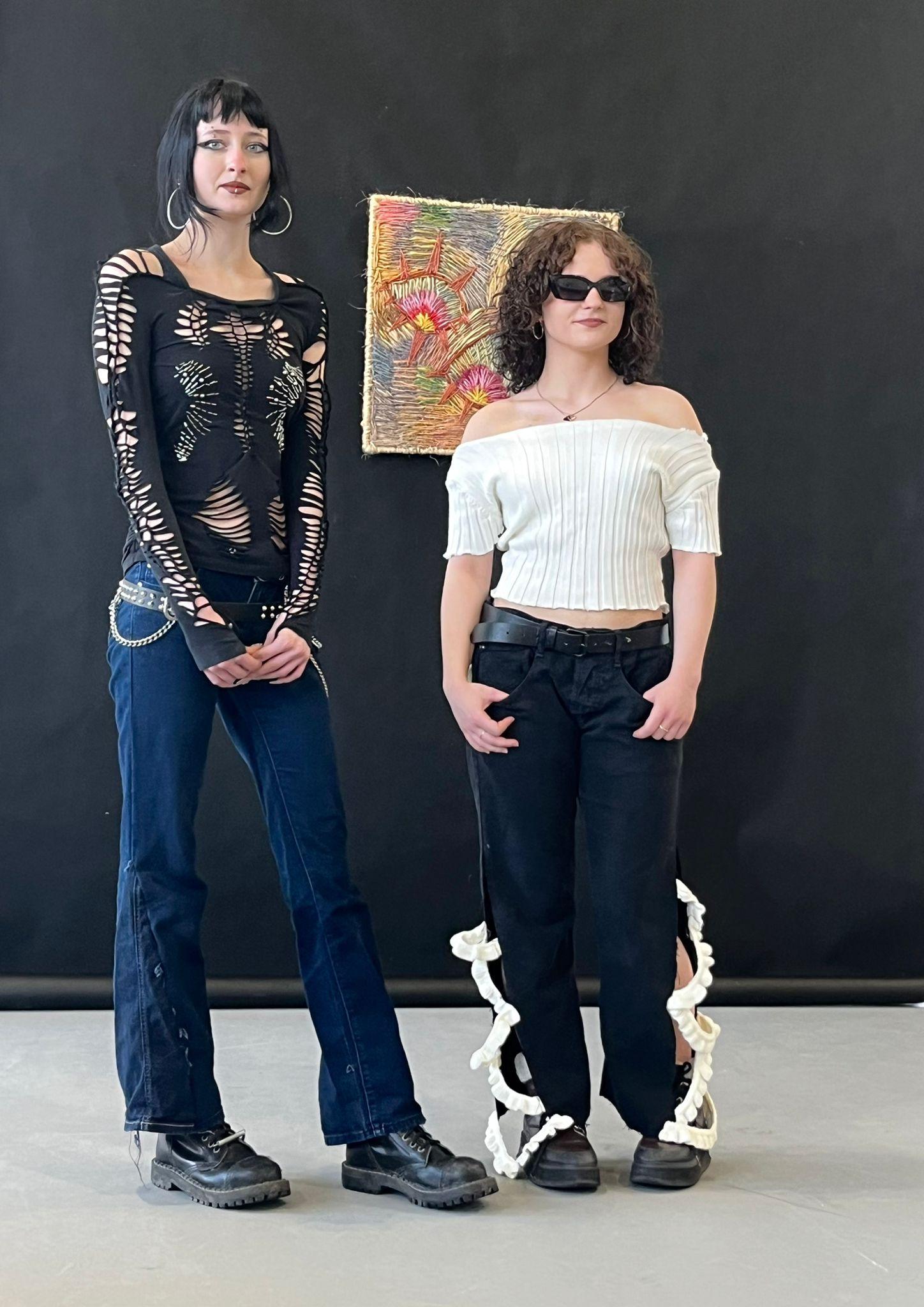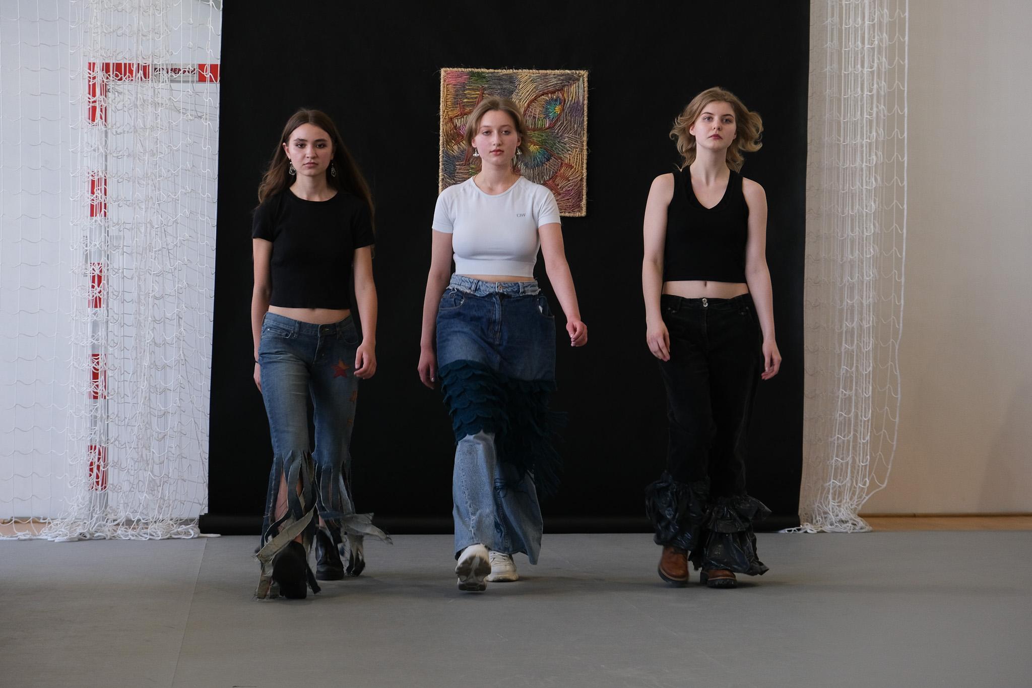 4. Jeans to inspiracja dla kolejnych wizji. Maja Dudek ozdobiła spodnie i suknię wykorzystując malowanie z wykorzystaniem szablonu oraz ciekawe naszycia kontrastowego materiału.