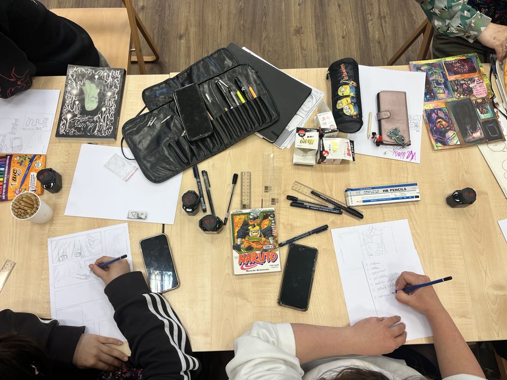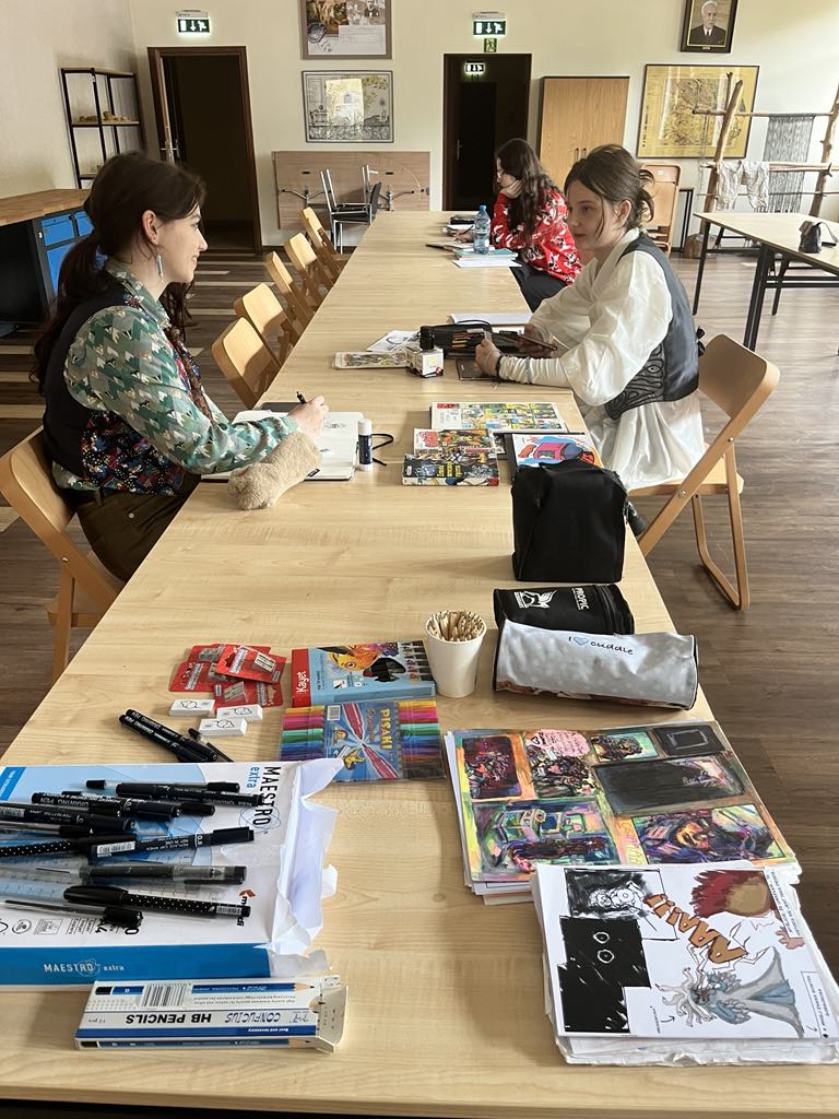 Trzy uczennice klasy II. PLSP w Nowym Wiśniczu – Zofia Malec, Aleksandra Moneta oraz Dobromiła Kubatko – przeprowadziły autorskie warsztaty poświęcone sztuce komiksu. Podczas zajęć uczestnicy mieli okazję poznać podstawy narracji graficznej, tworzyć własne szkice, dowiedzieć się jak opowiadać historie obrazem.