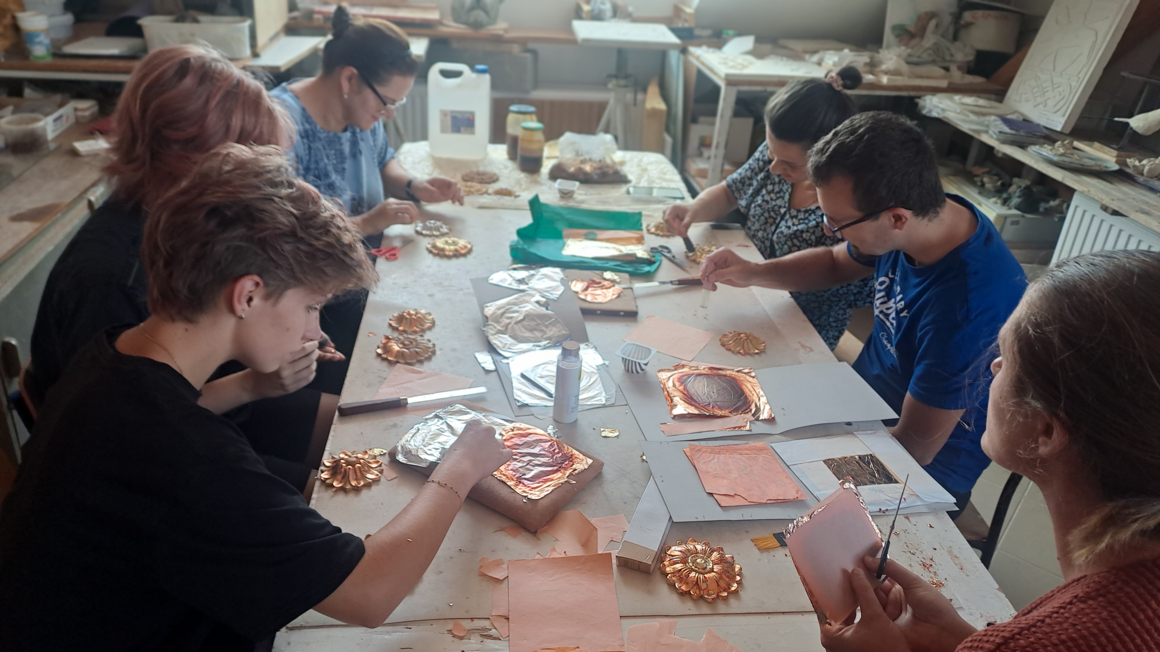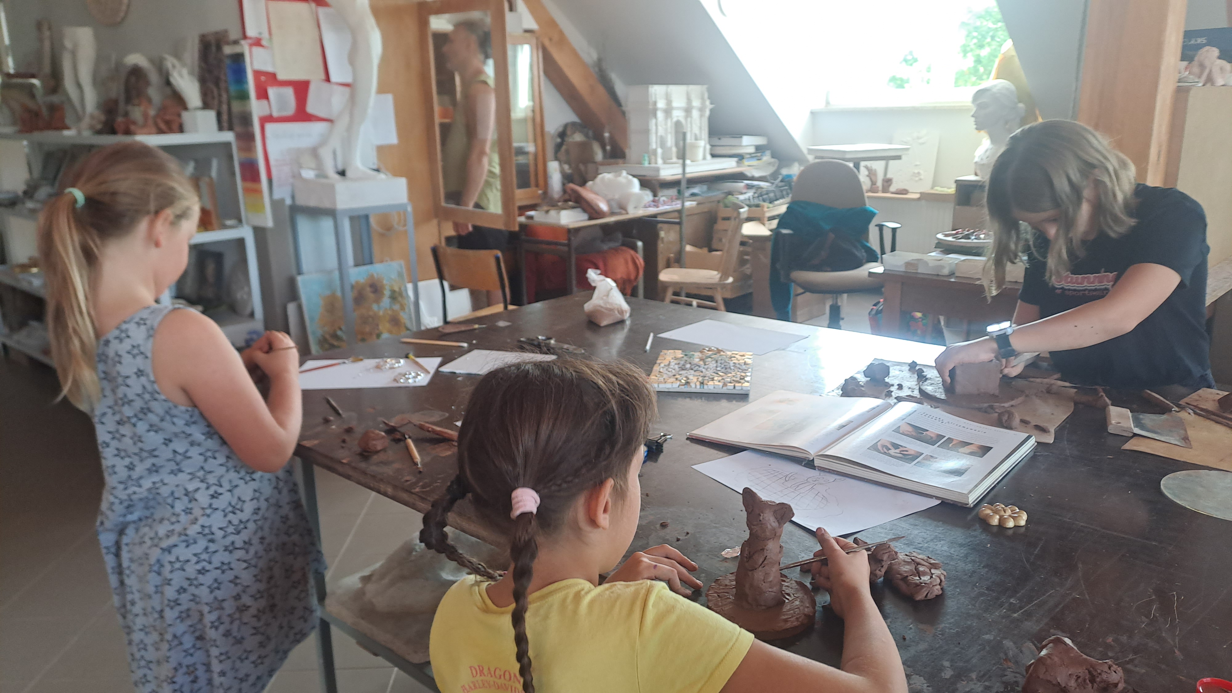 Warsztaty pozłotnicze prowadziła Aleksandra Biedka, a opiekę nad tworzącymi w glinie sprawował Marek Biedka.